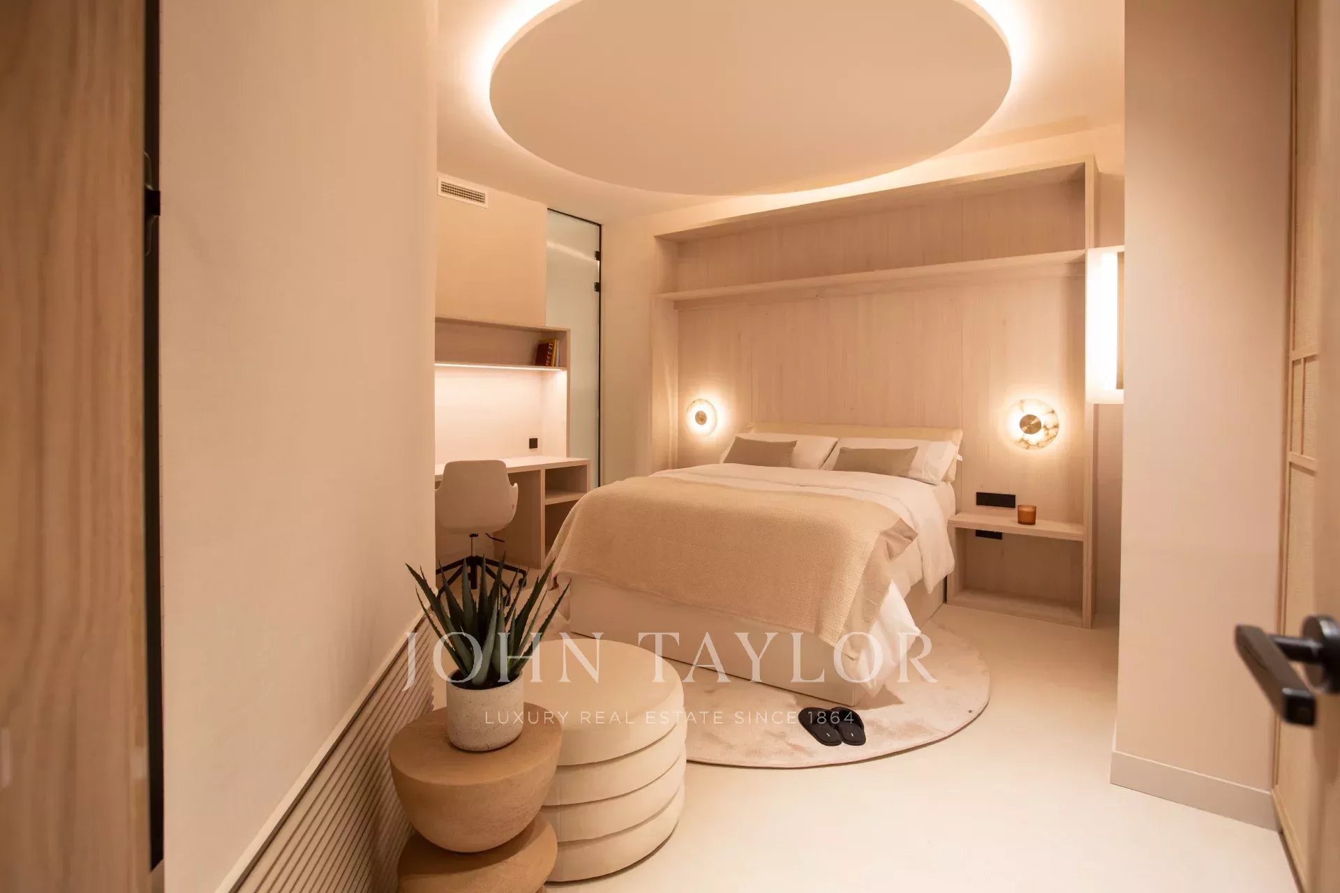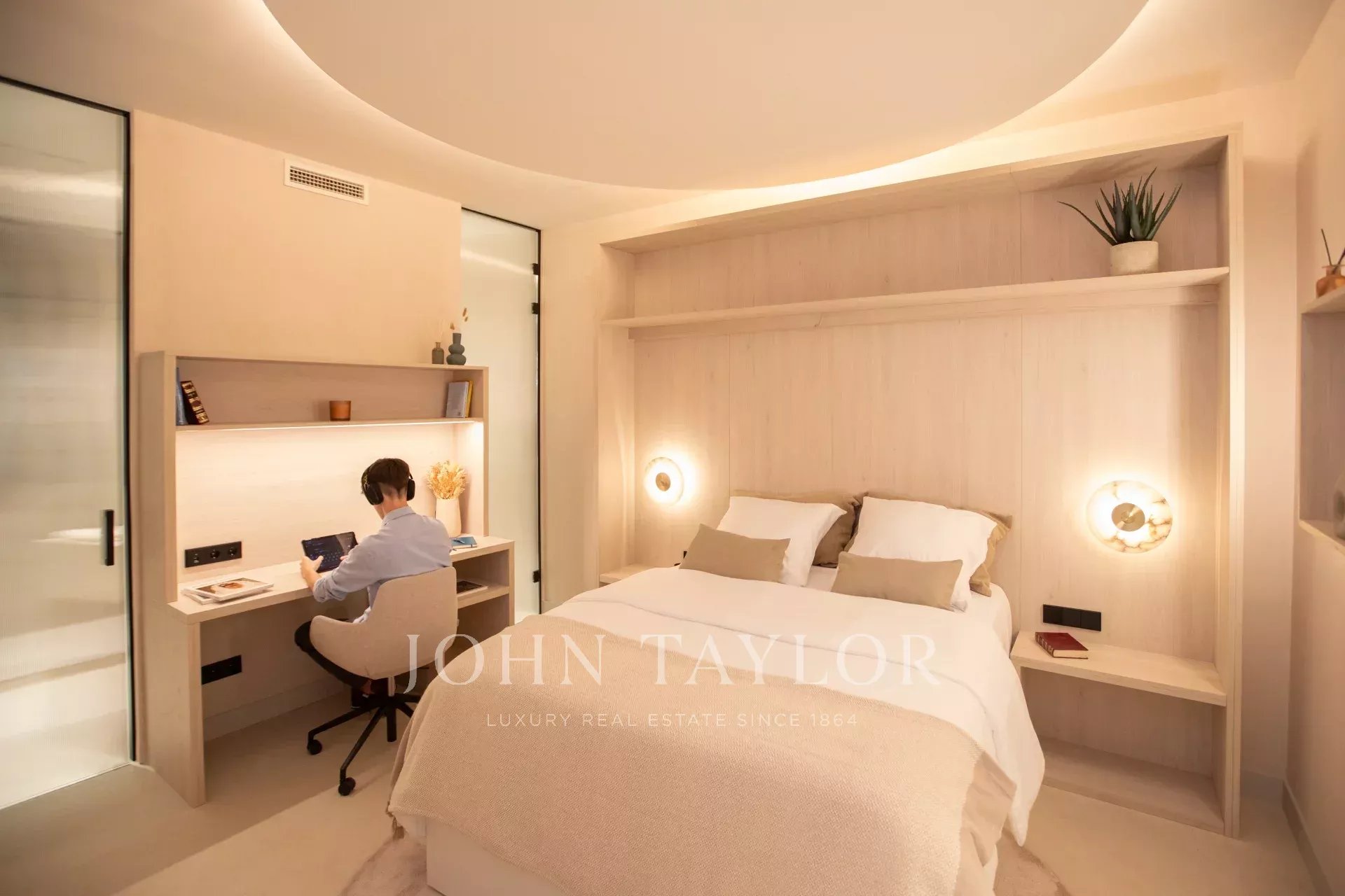 La zona notte comprende non meno di cinque ulteriori camere da letto, tutte dotate di bagno privato con finestre e zone studio. Una di queste si affaccia su un tranquillo cortile paesaggistico con una piacevole vista. L'ufficio, dotato di un grande schermo per le videoconferenze, e il soggiorno, che dispone di un proiettore nascosto, si affacciano sul cortile. Un'altra delle camere da letto ha un ingresso separato, che la rende perfetta come camera per il personale o per gli ospiti. È presente anche una lavanderia separata con tre lavatrici e tre asciugatrici.