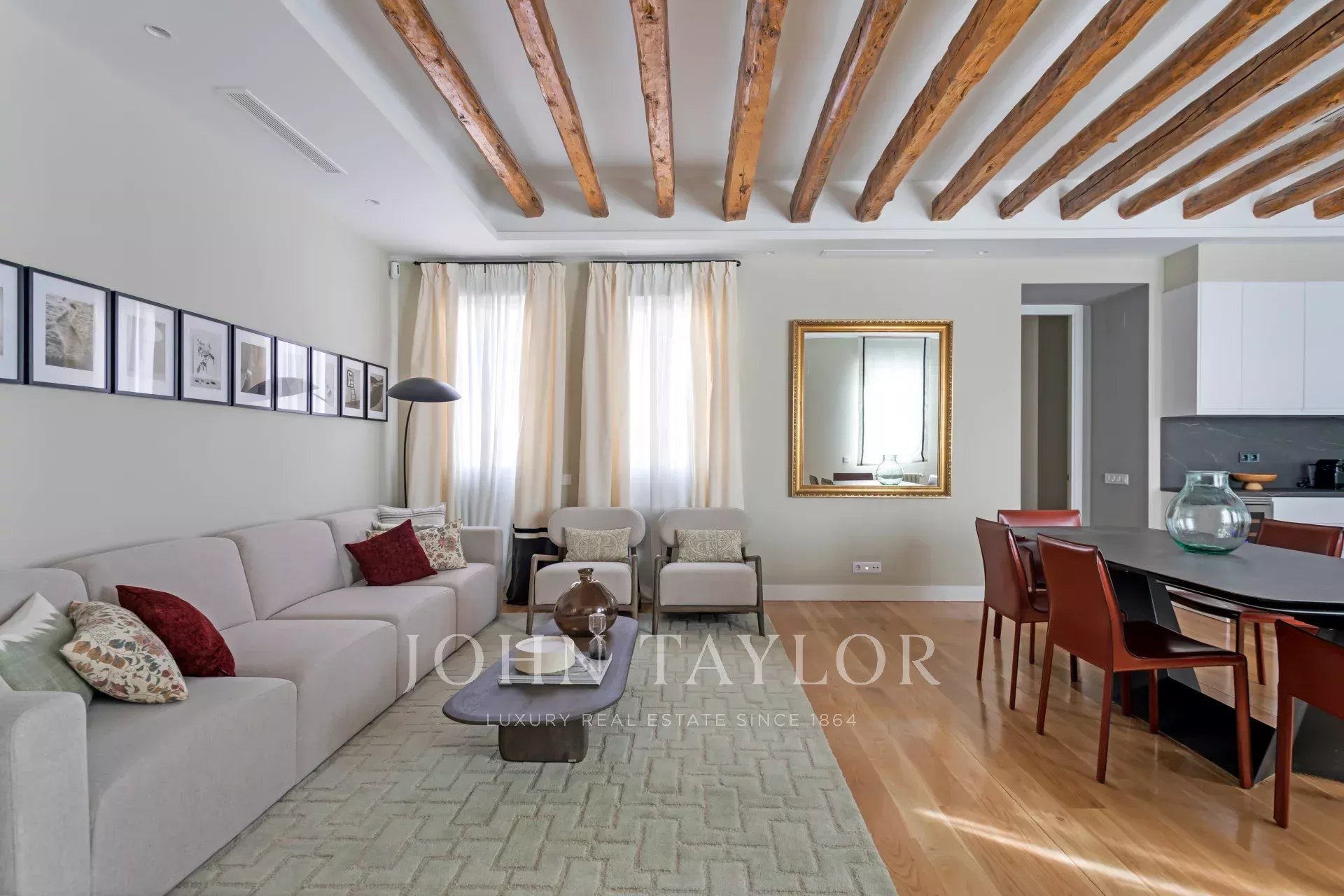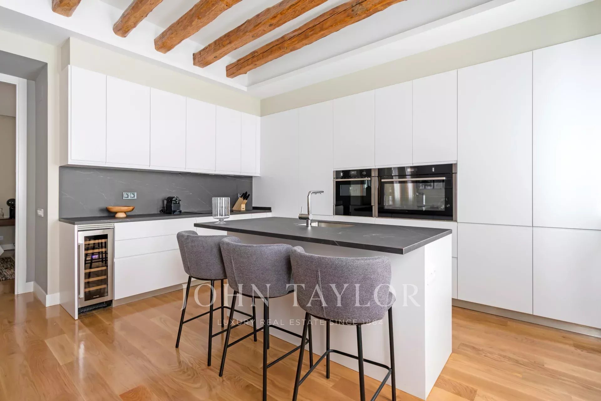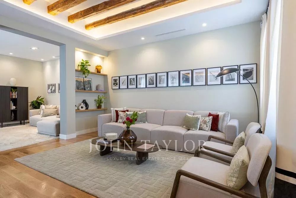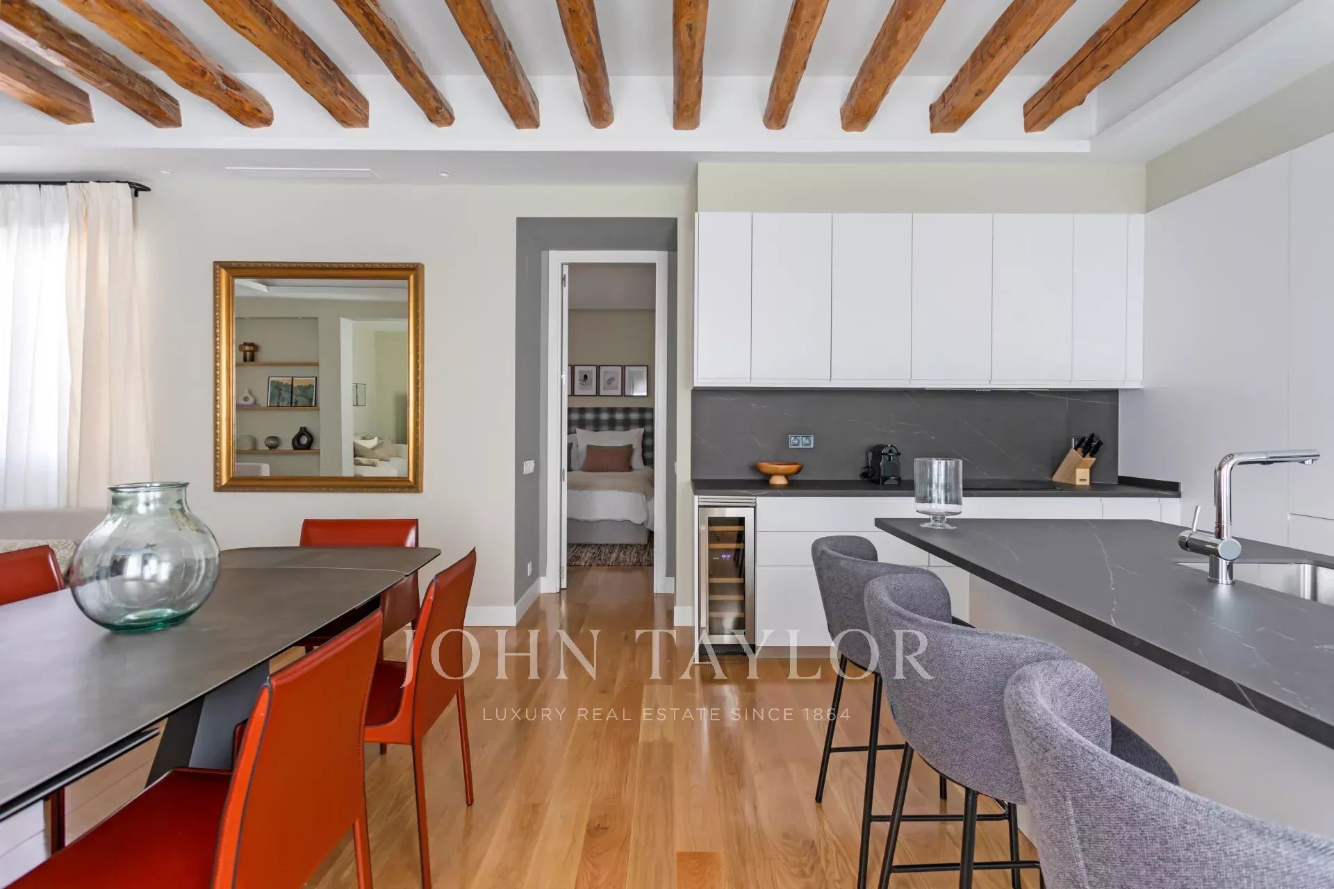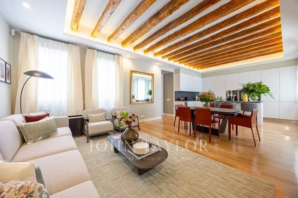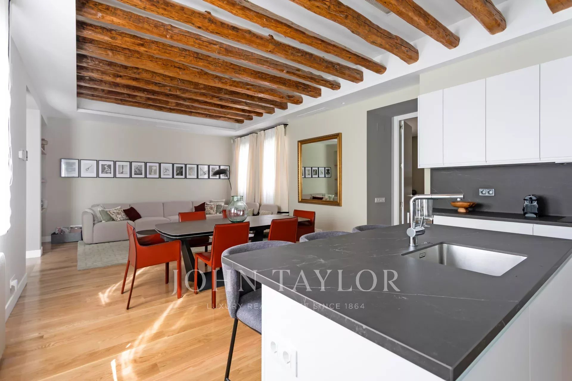 L'ampio soggiorno/sala da pranzo e cucina open space (49 m2) conserva le travi originali della fine del XIX secolo, la luminosità e il silenzio sono sorprendenti e invitano a un'atmosfera conviviale o tranquilla. Il design degli interni e l'arredamento sono stati curati nei minimi dettagli per ottenere un'armonia difficile da battere. La cucina è dotata dei migliori elettrodomestici disponibili sul mercato ed è completamente attrezzata.