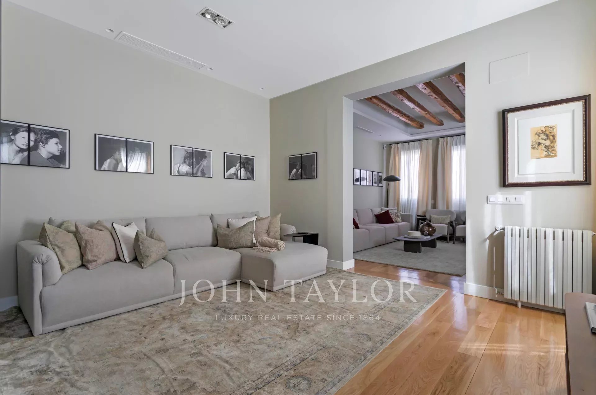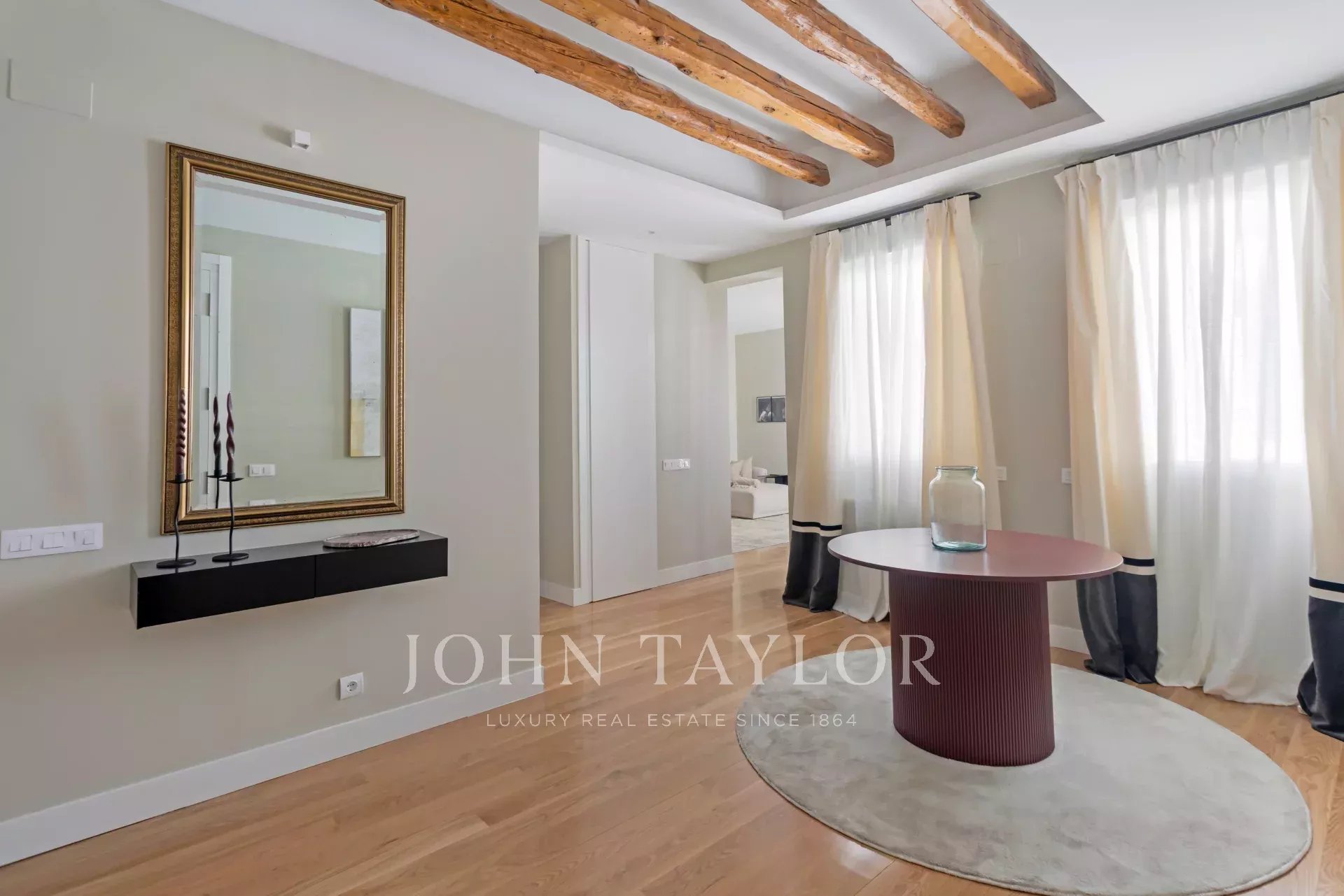 Subito dopo l'ingresso siamo accolti da un ampio salone, pieno di luce che ci permette di apprezzare i suoi pavimenti in rovere massiccio, le travi in legno originali e i suoi soffitti alti tre metri.