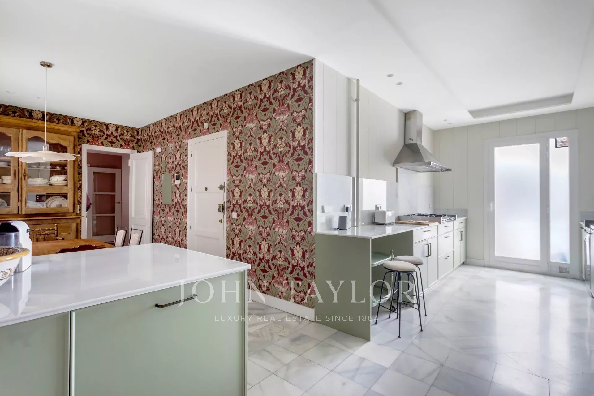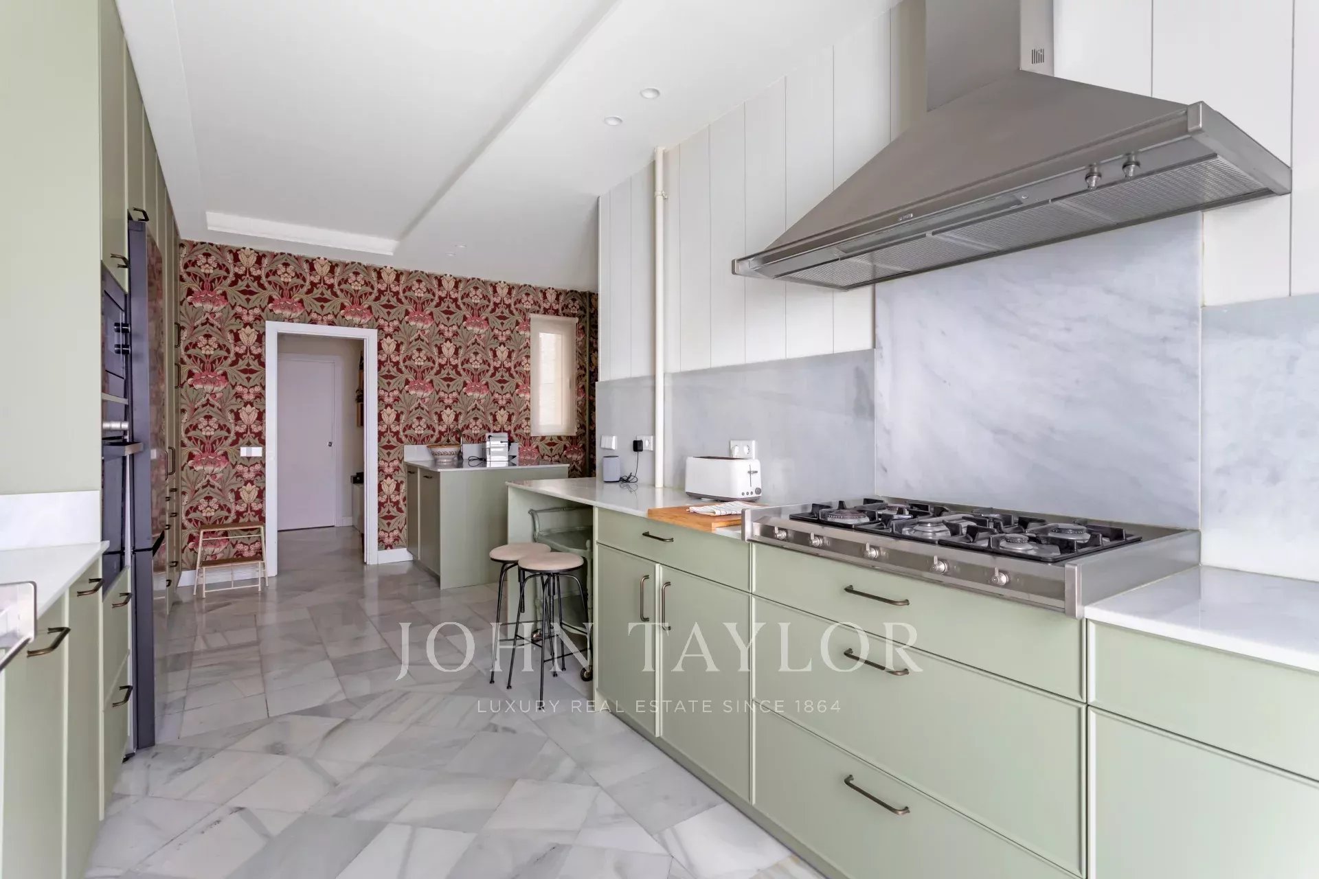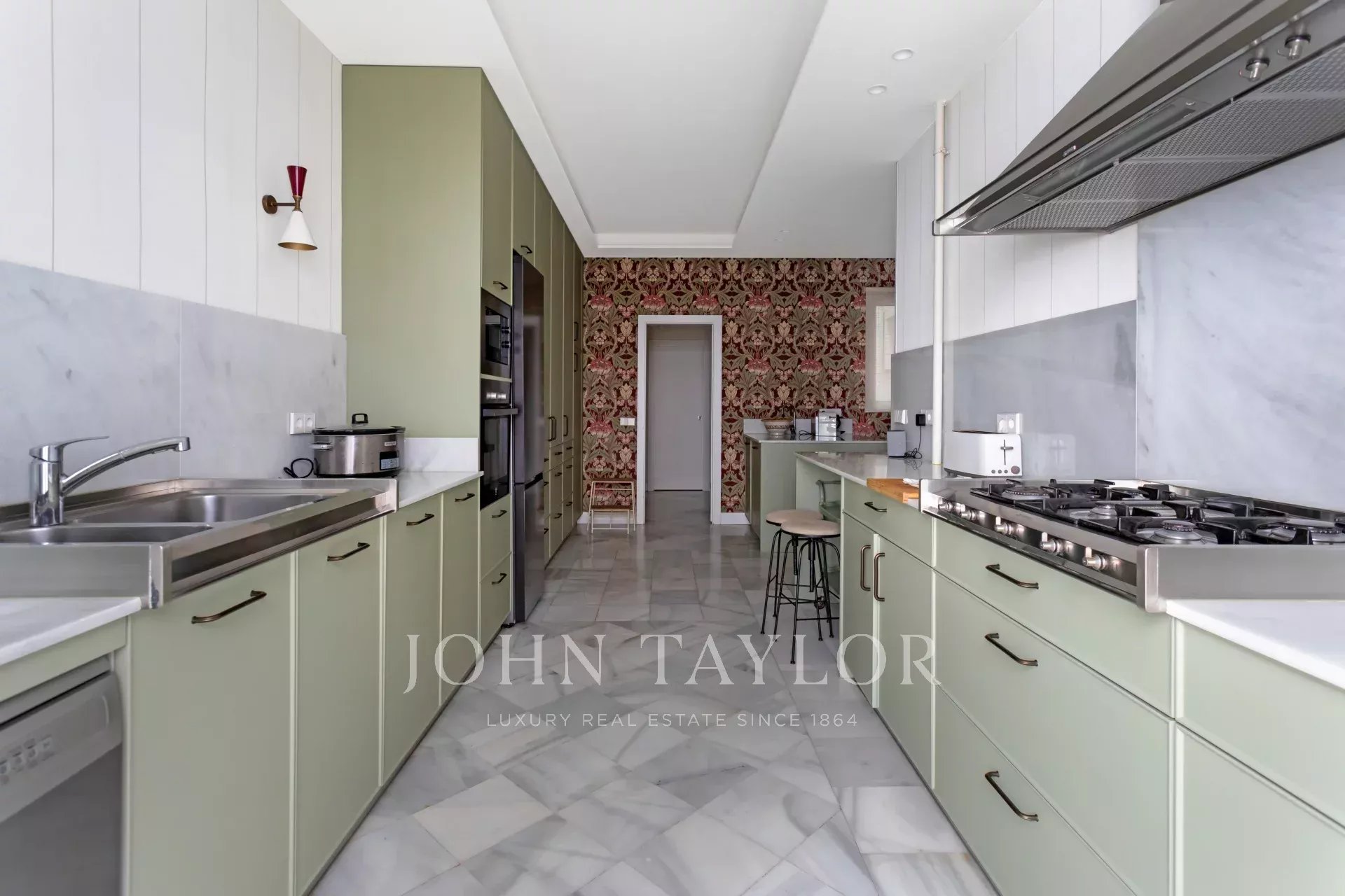 La cucina, pratica e di grande capienza, mantiene una linea sobria e funzionale con mobili su misura; insieme agli spazi di servizio, dona equilibrio all'insieme. Quattro camere da letto che garantiscono privacy e versatilità e tre bagni distribuiti con criterio completano la casa, offrendo una tela perfetta per intervenire e aggiornare rispettando la sua essenza originale. Luce, proporzioni e dettagli d'epoca convivono con la possibilità di aggiungere tocchi contemporanei senza perdere il suo carattere signorile.