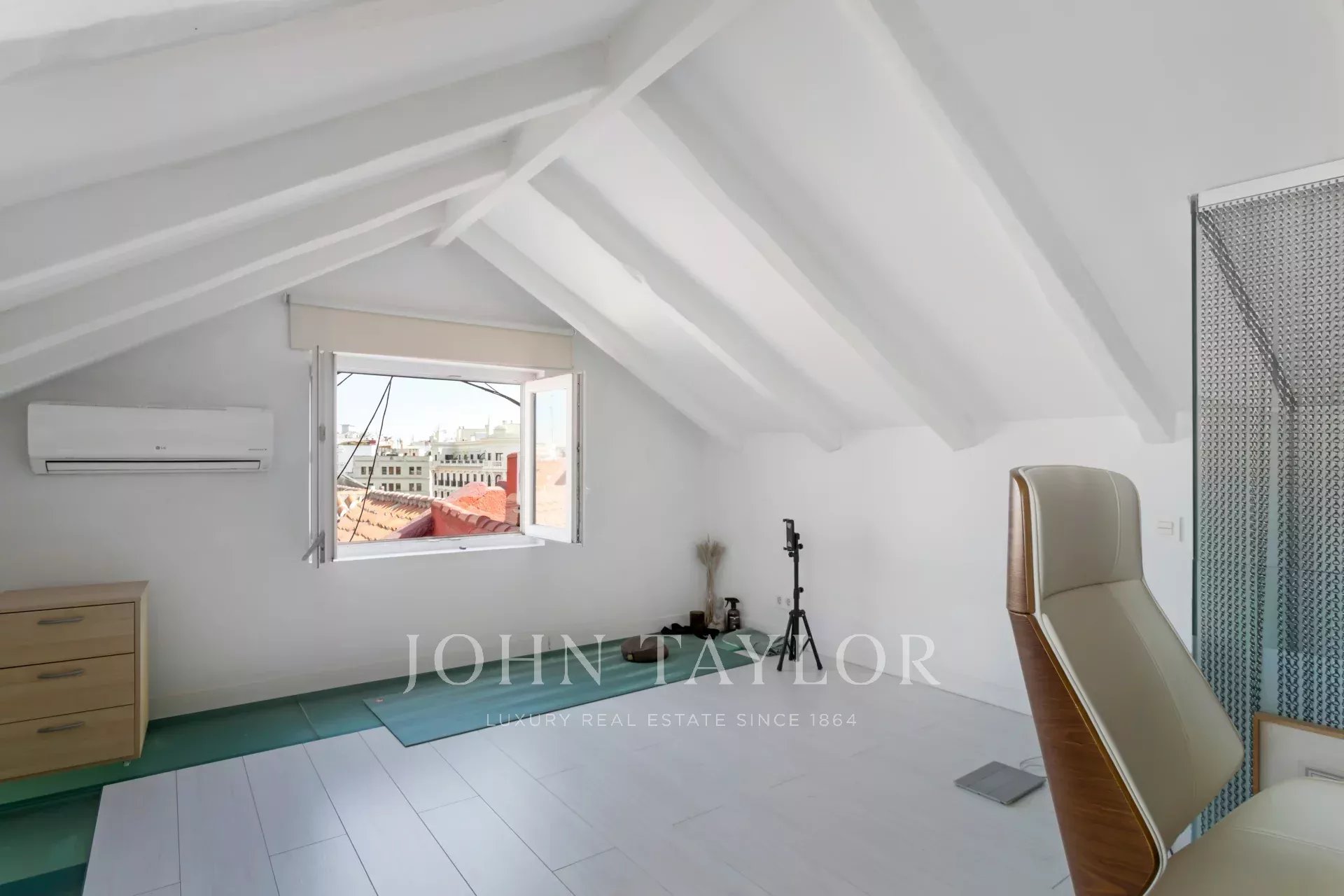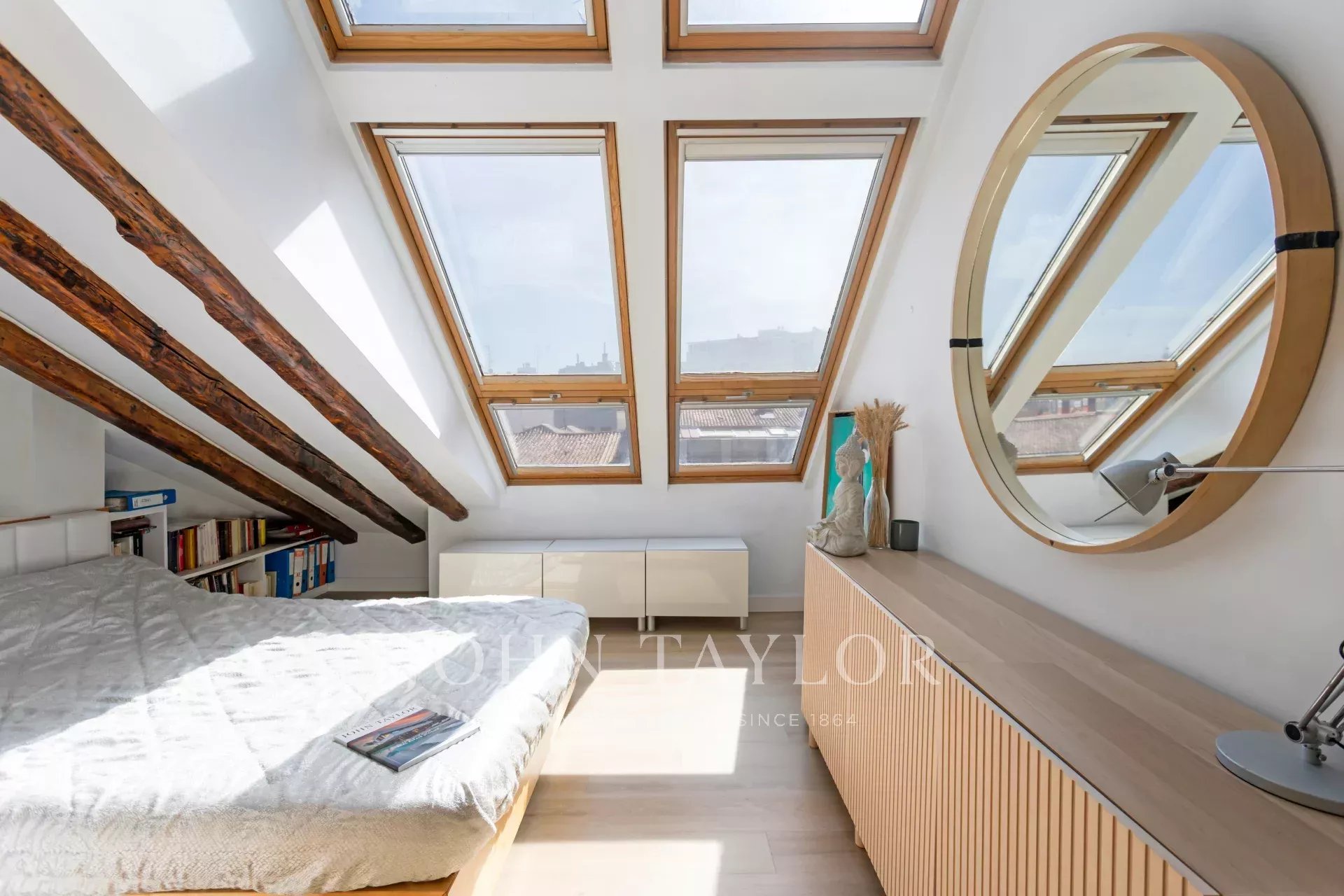 Il soggiorno e la camera da letto hanno finestre per tetti che si affacciano su via Alcalá, da cui si possono ammirare splendidi edifici classici e parte del Parco del Retiro. Questo è un attico per gli amanti del sole e della luce naturale.