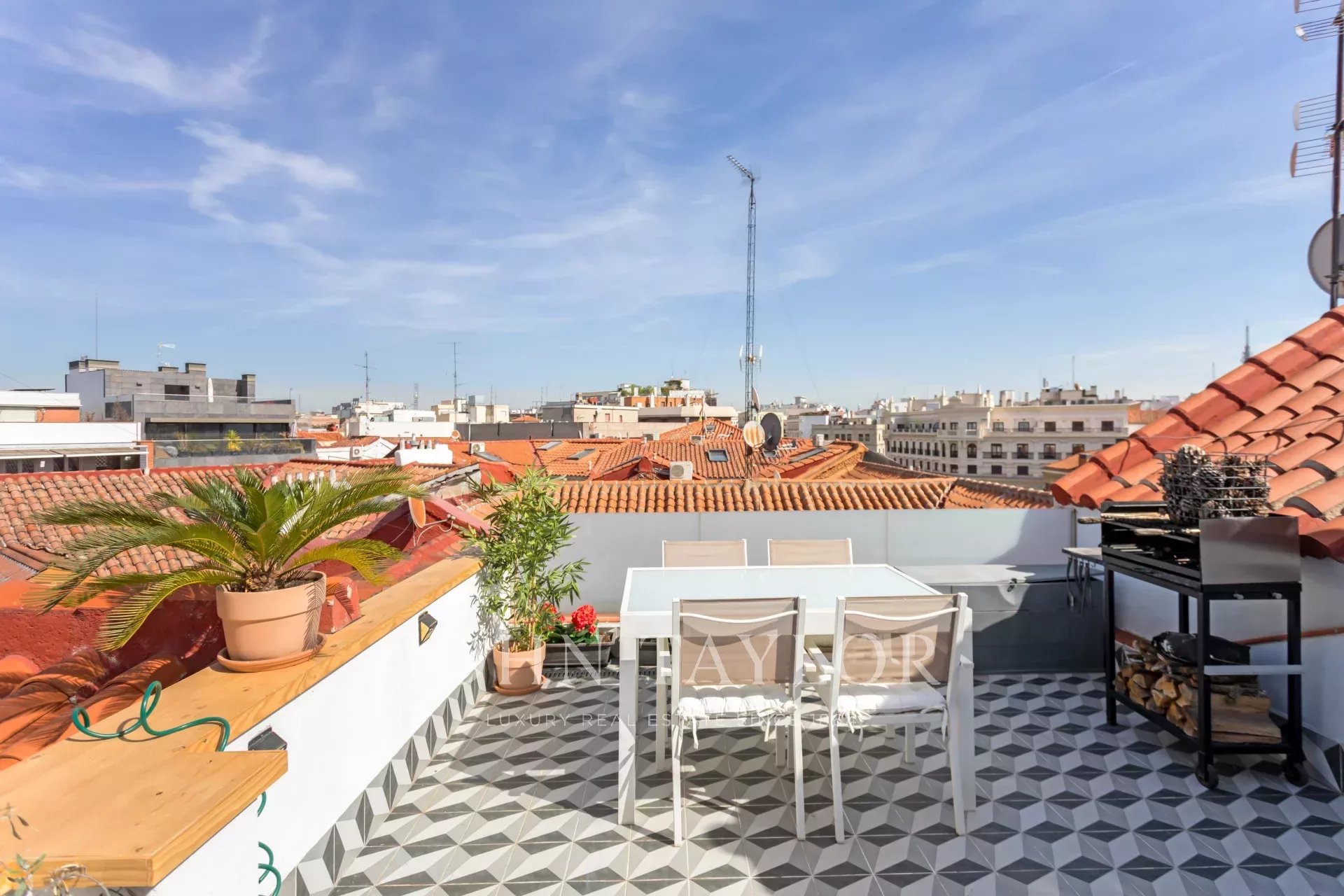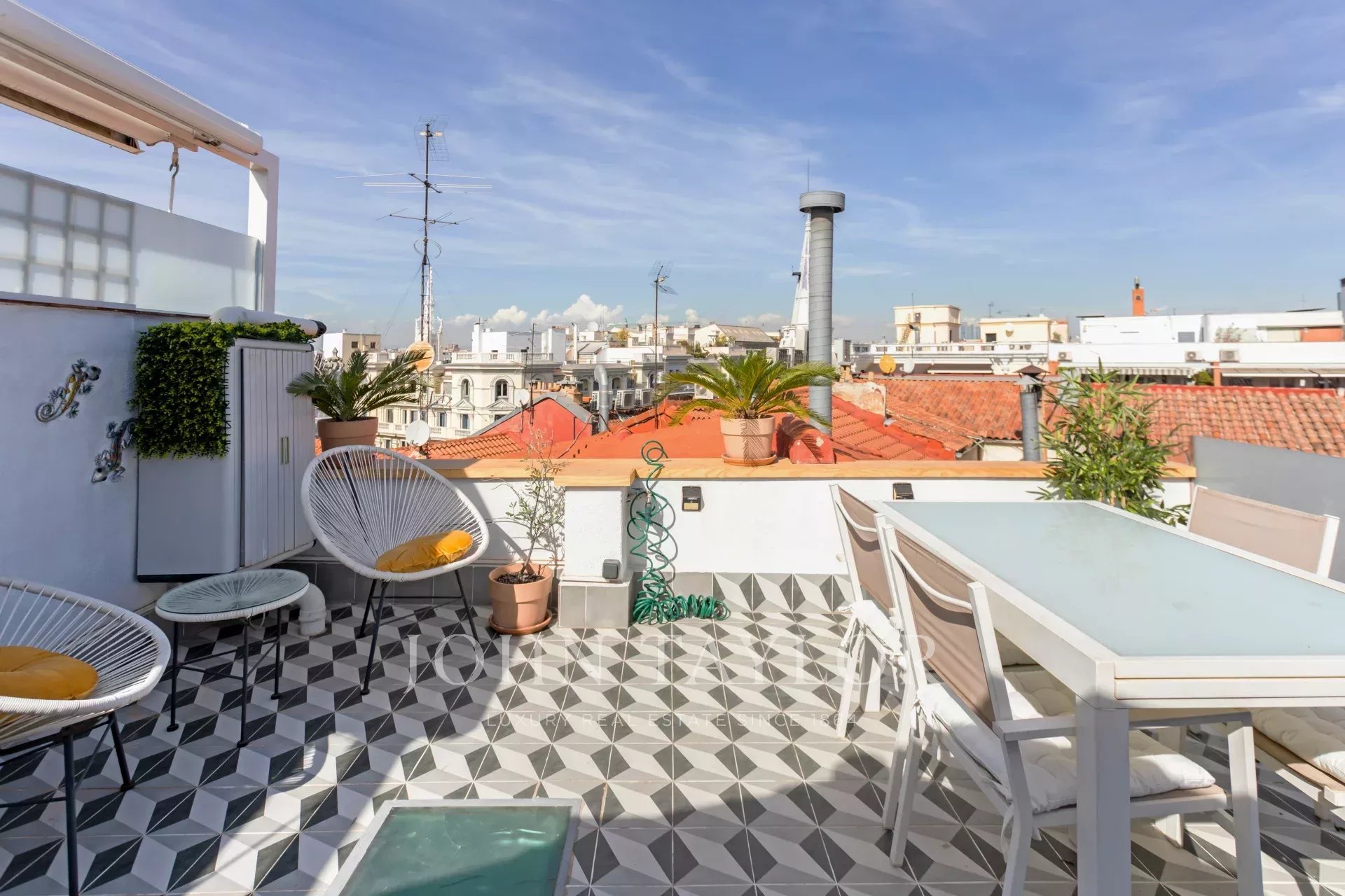 Questo duplex si distingue per la sua spettacolare terrazza, che si erge imponente sugli edifici vicini, offrendo viste sullo skyline di Madrid con totale privacy e senza rumore, grazie alla sua posizione strategica.