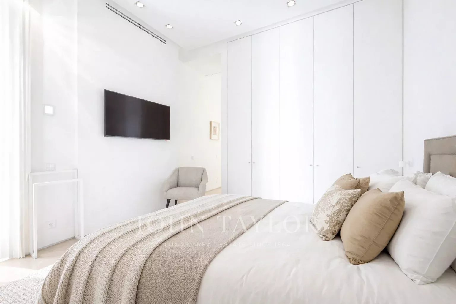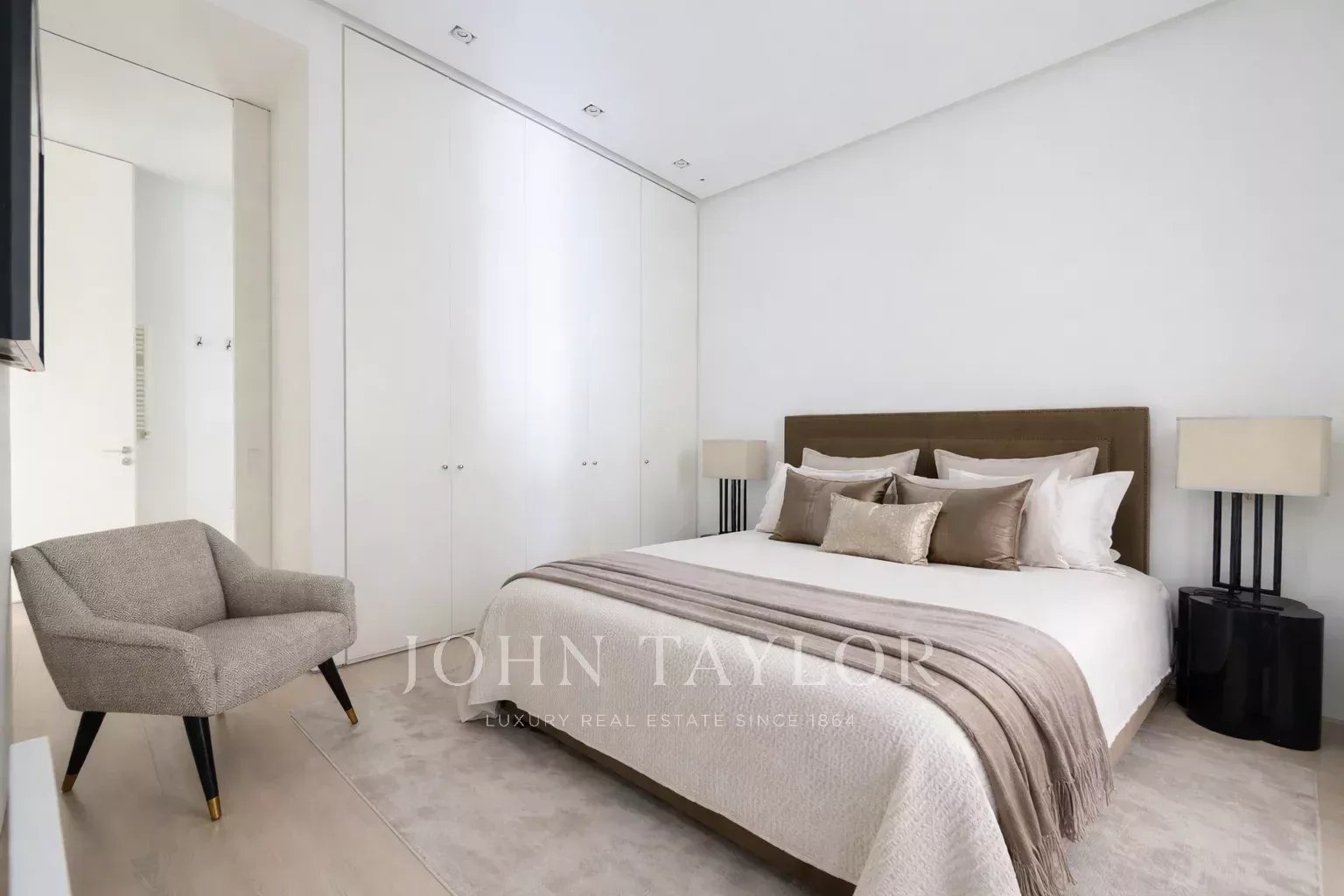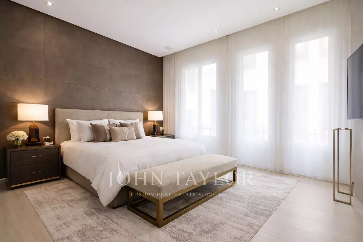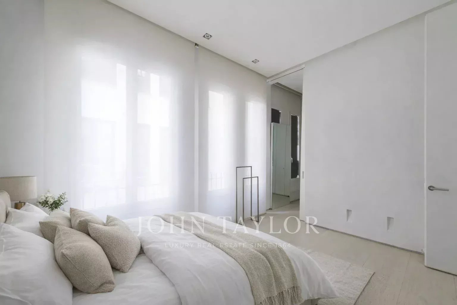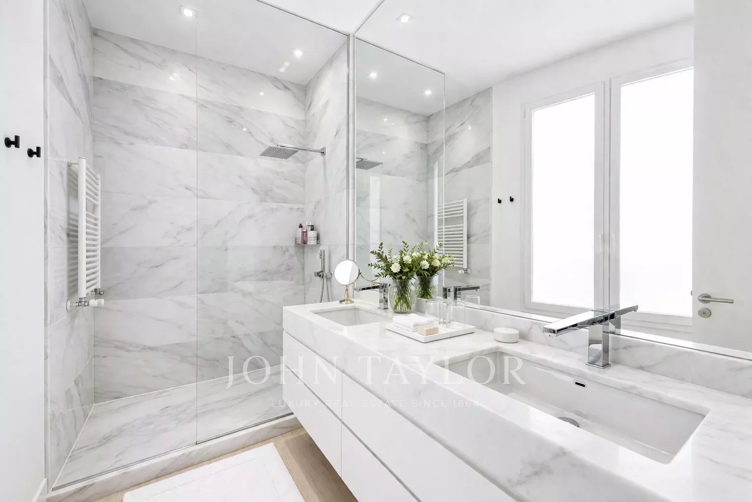 La camera da letto principale è una suite completa, con un ampio spogliatoio e grandi finestre. Il bagno en-suite è uno spazio con personalità, con doppio lavabo in marmo e un'enorme doccia a multigetto.