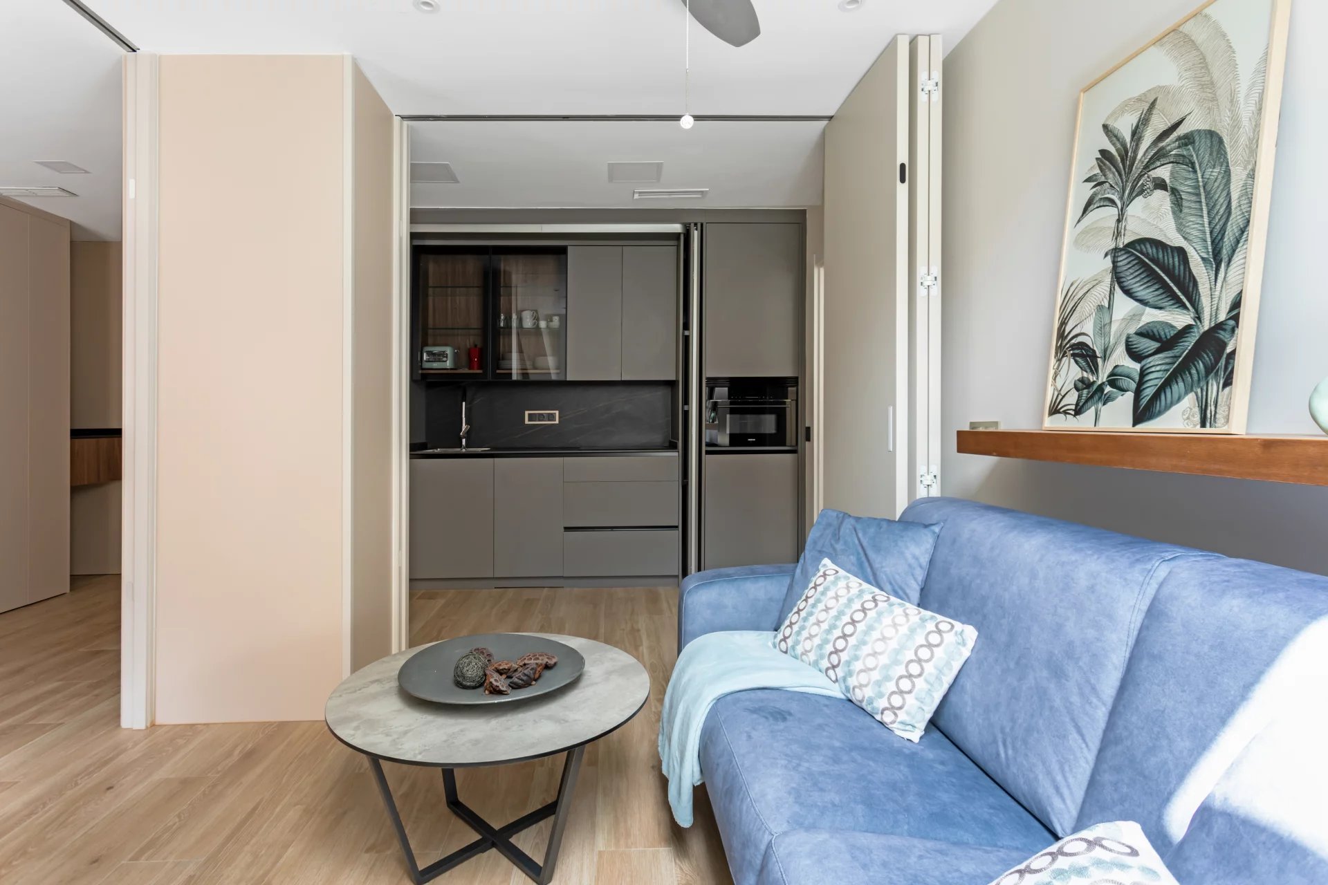 Accanto si trova la cucina a pianta aperta, completamente attrezzata, che può anche essere nascosta dietro porte di legno.