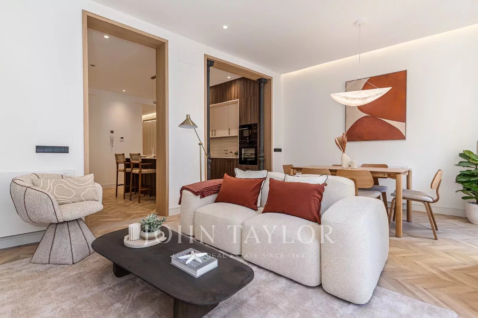 La superficie è di 127 m², organizzati in un ampio e luminoso soggiorno con cucina integrata ed elegante isola centrale che articola lo spazio. La zona pranzo, generosa e ben definita, fa di questo ambiente il vero cuore della casa, ideale sia per la vita quotidiana che per ricevere gli ospiti.