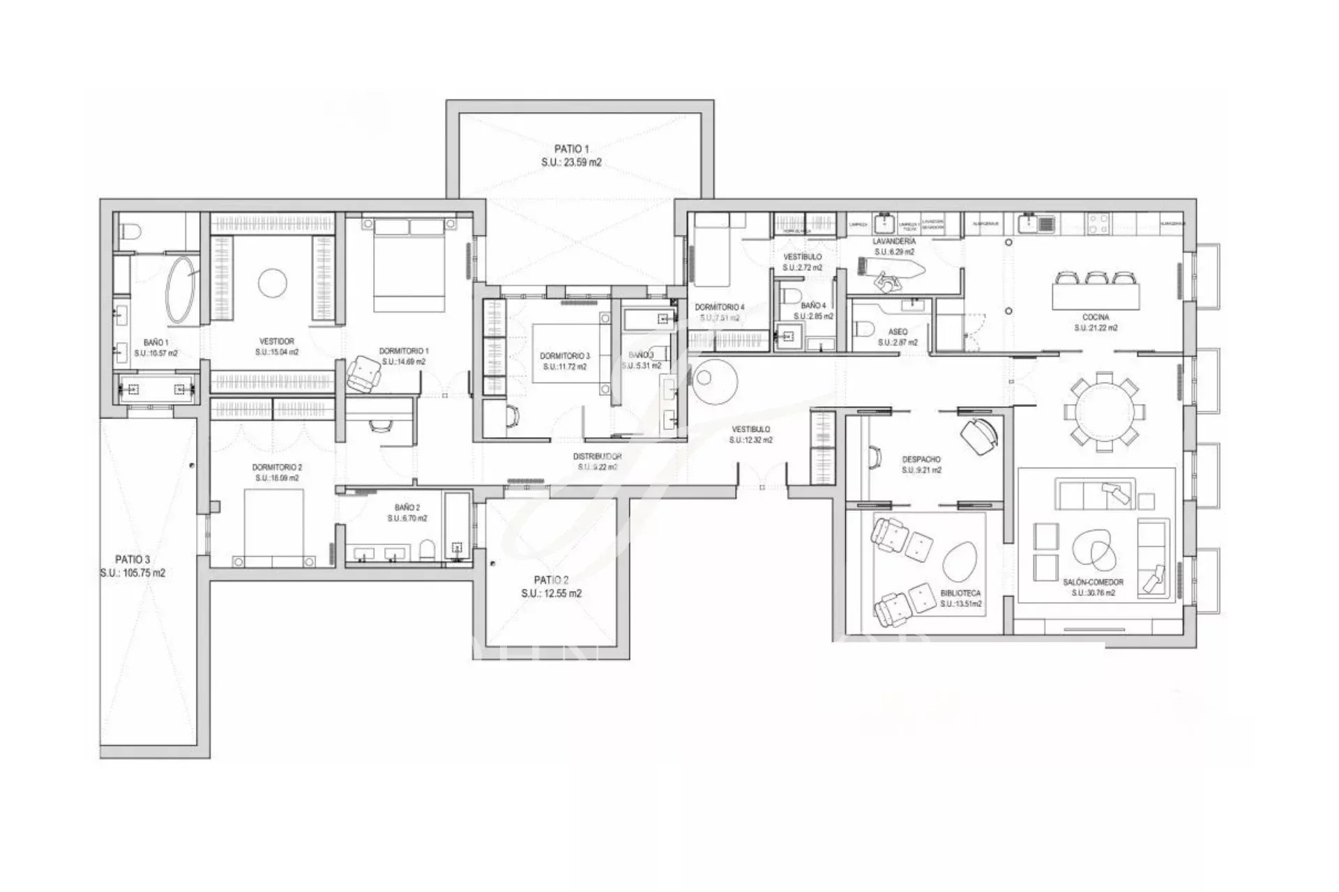 Situato al terzo piano di un classico edificio del 1900 nel ricercato quartiere di Justicia, questo appartamento familiare di 251 m2 è composto da quattro camere da letto con bagno privato, oltre a una zona ufficio, una biblioteca separata e una zona lavanderia completa. Il soggiorno-sala da pranzo e la cucina si trovano sul luminoso esterno, con i suoi 4 balconi che si affacciano sulla strada e i suoi alti soffitti con modanature.