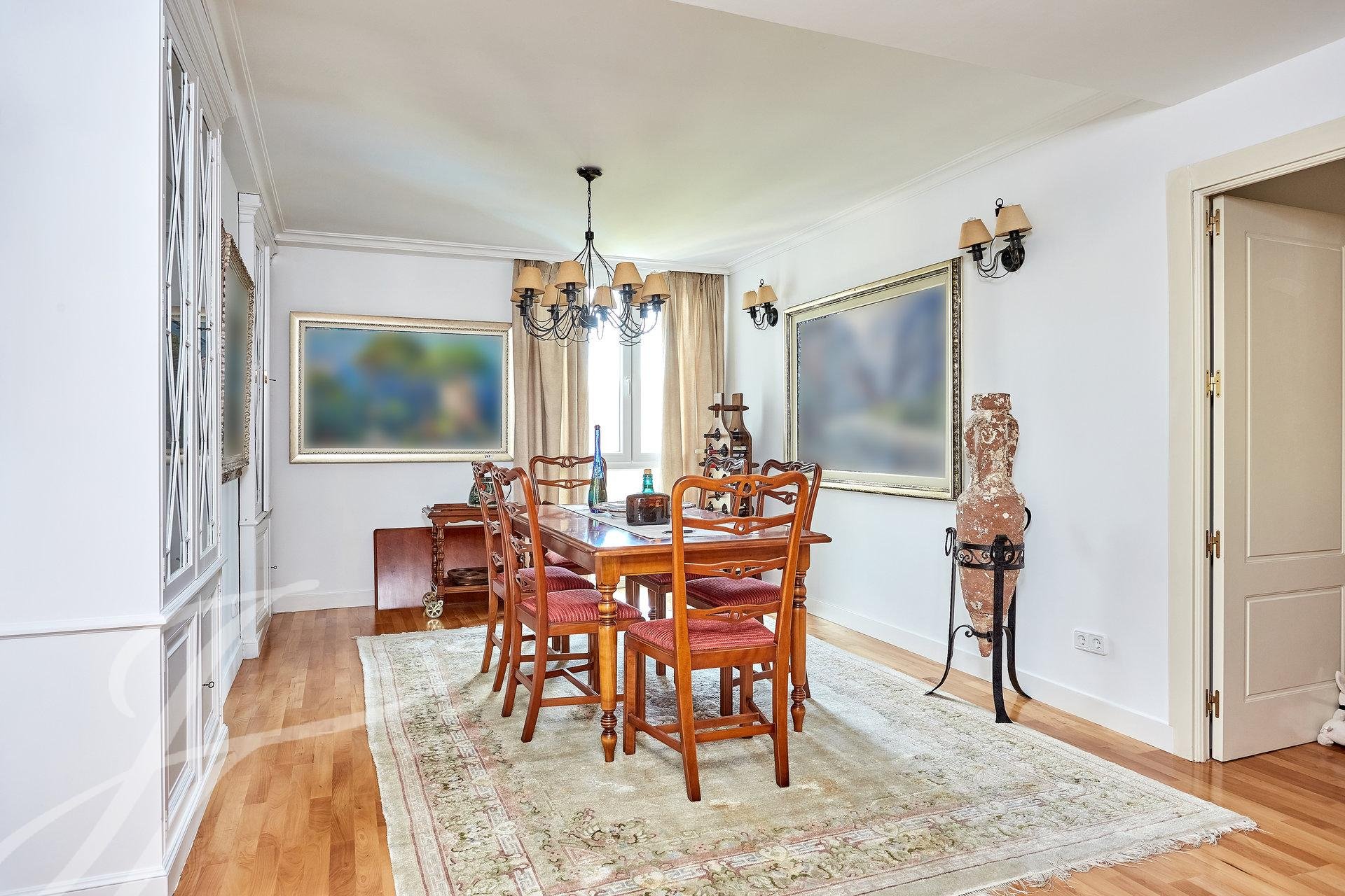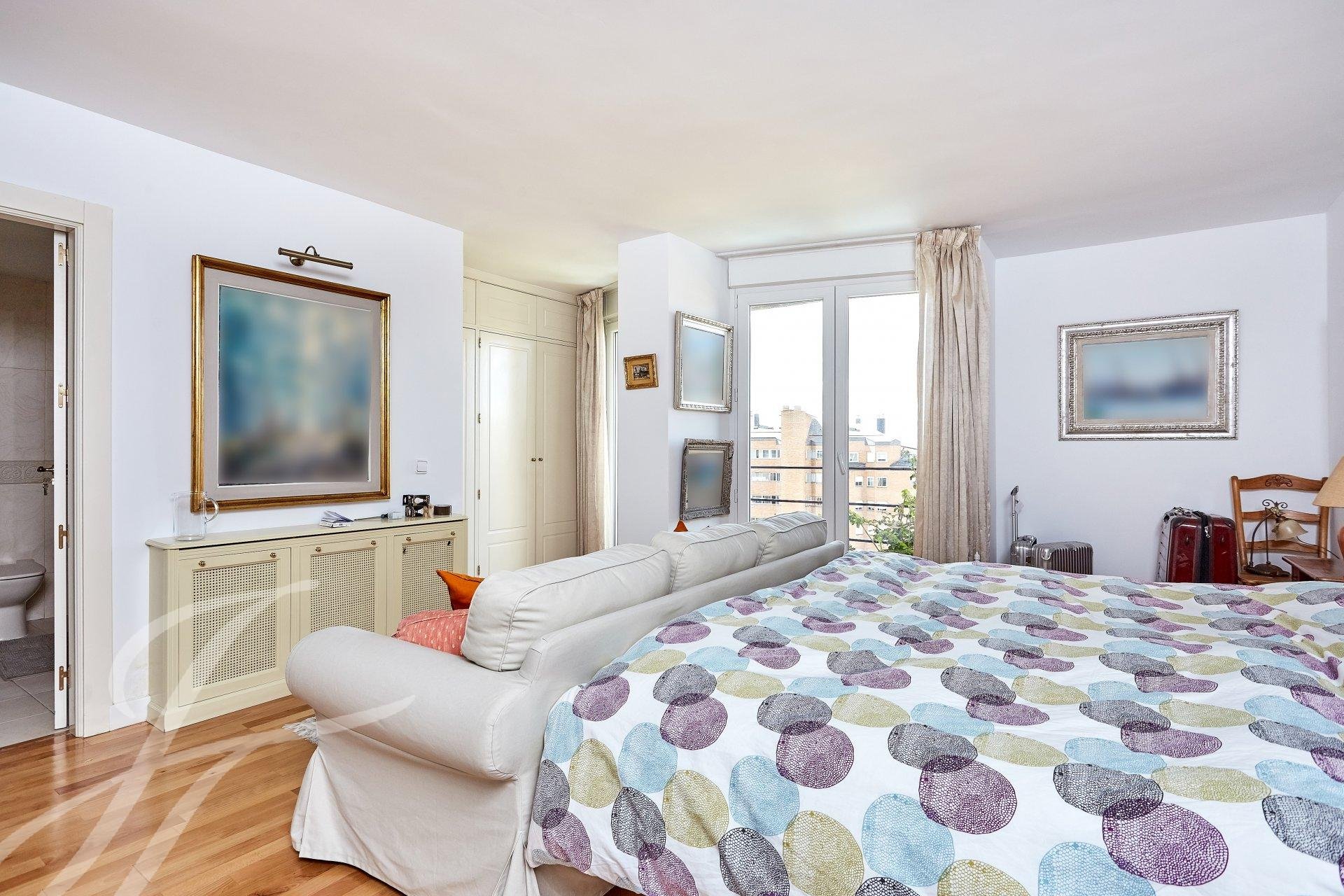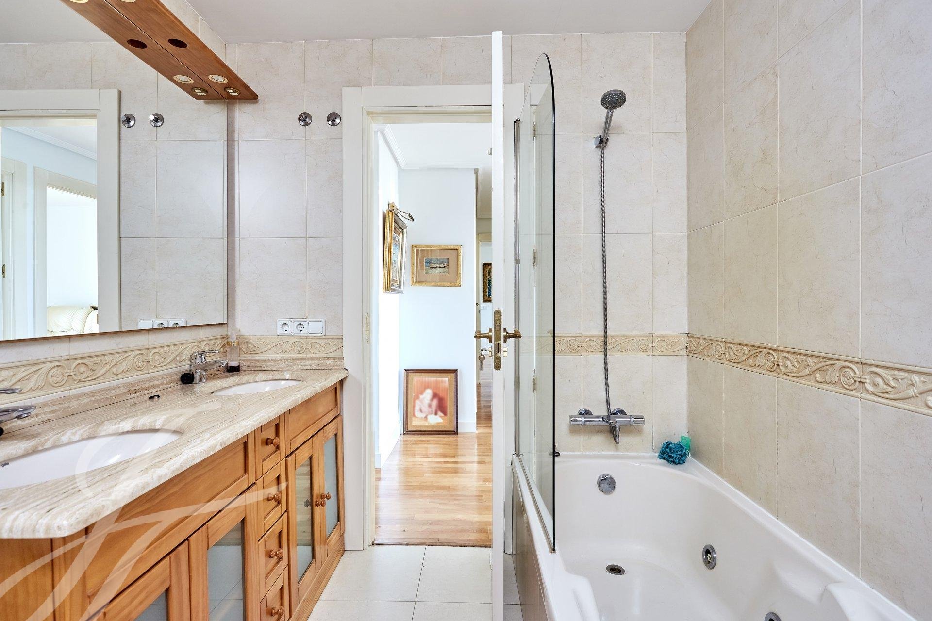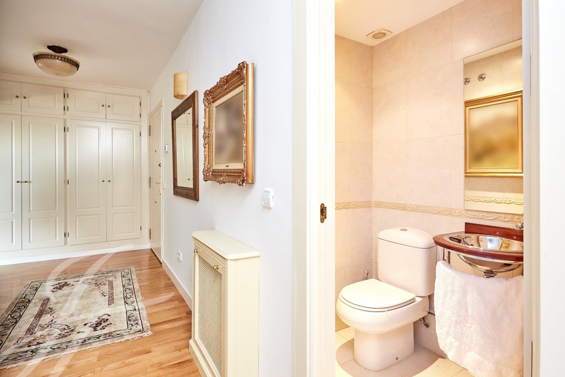 Si entra nella proprietà attraverso un luminoso ingresso con guardaroba, che dà accesso a una stanza attualmente utilizzata come ufficio personale. Entriamo in un ampio soggiorno con tre stanze con grandi finestre, una delle quali con camino. La vista e la luminosità di queste stanze sono eccellenti, grazie al loro orientamento a sud. Passiamo alla zona notte, dove troviamo la camera da letto principale (originariamente due) con spogliatoio, bagno privato in marmo e una piccola terrazza, oltre a due camere da letto con accesso a un'altra terrazza, servite da un bagno.