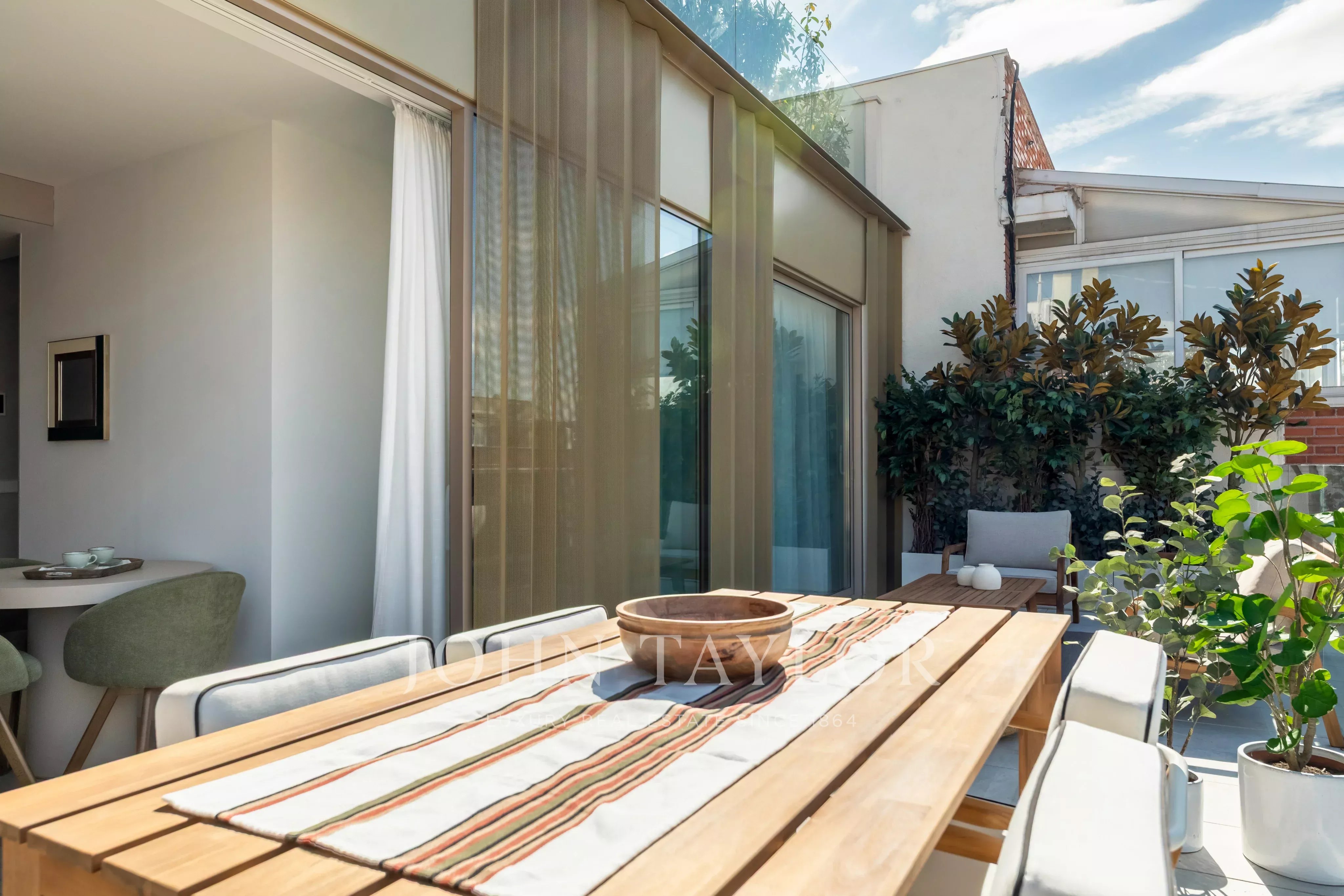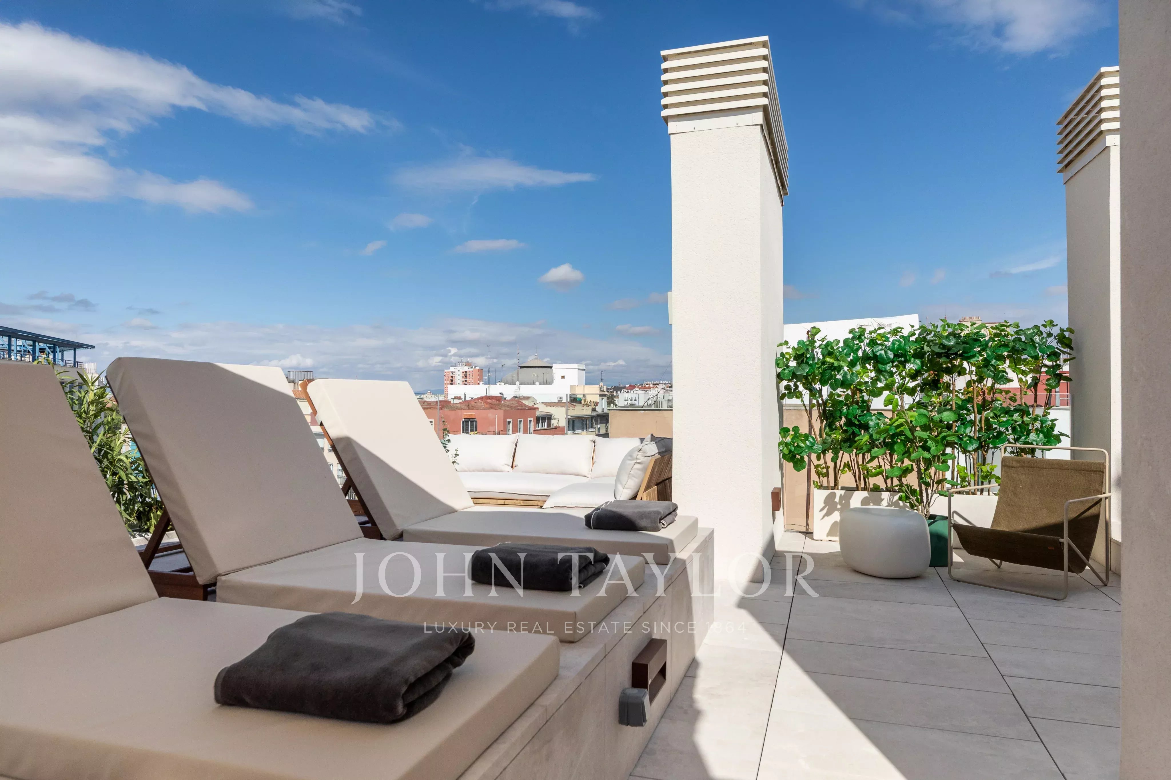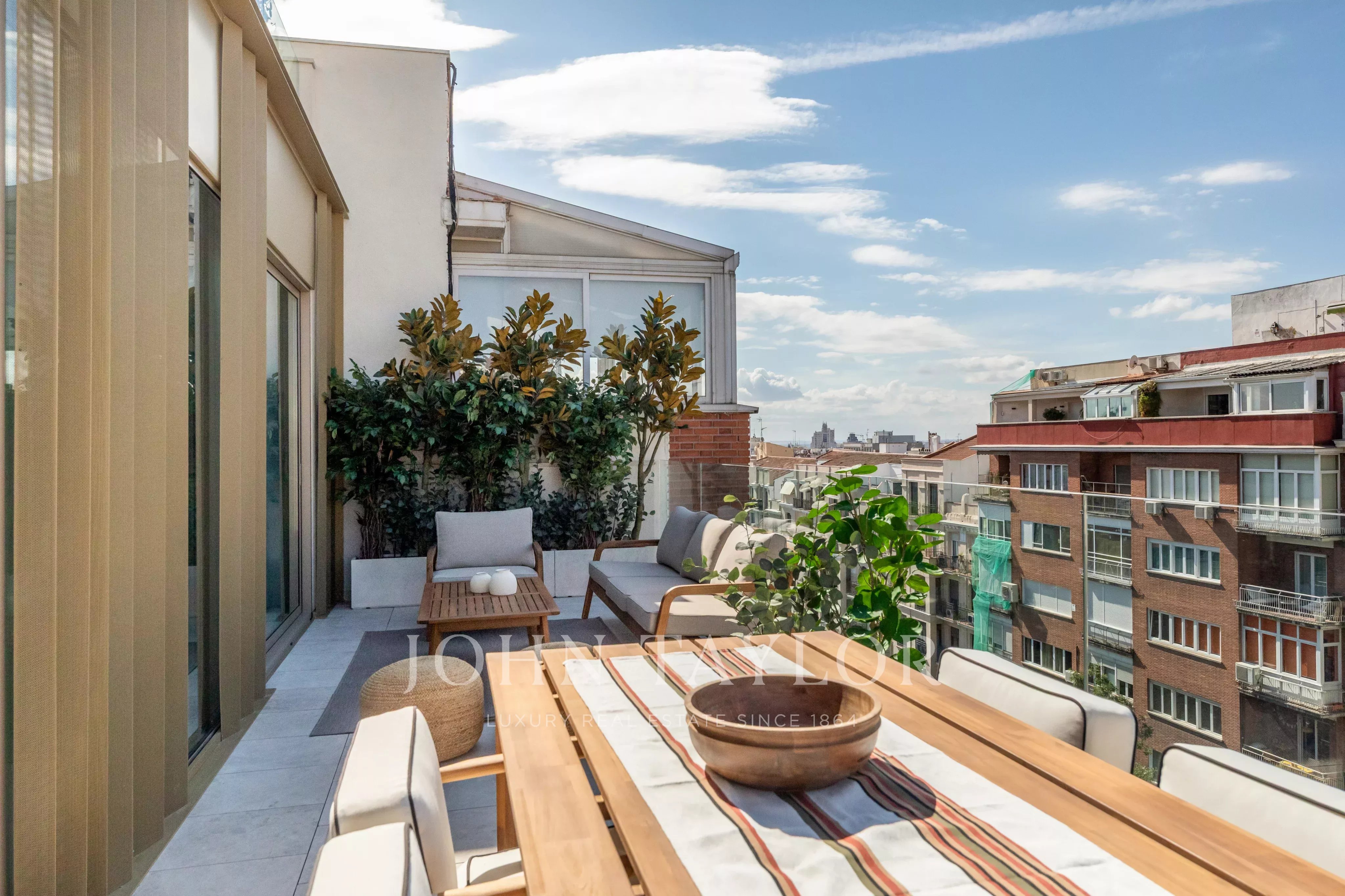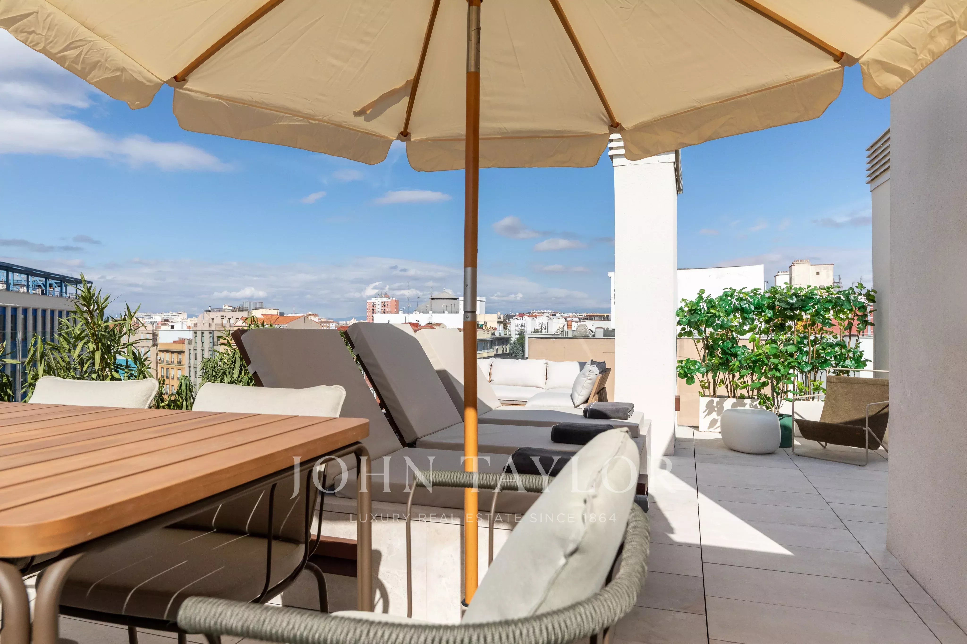 Nuovissimo attico duplex al sesto piano, con una superficie di 175 m² nel quartiere Chamberí di Almagro, Madrid, offre una perfetta combinazione di comfort e tecnologia moderna.