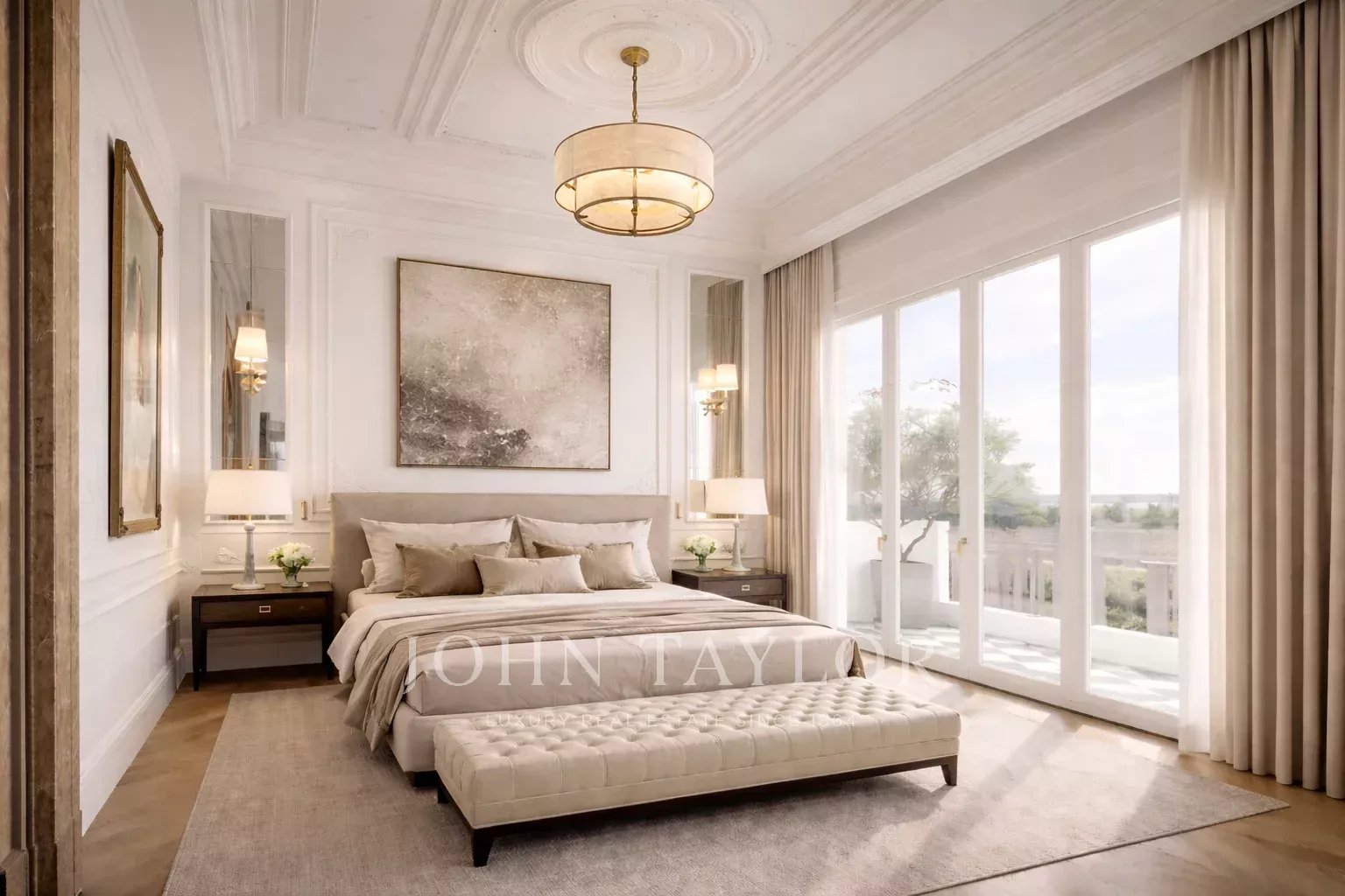 La zona notte consente di sviluppare tre ampi camere da letto matrimoniali en suite, ognuna con il proprio bagno, offrendo molteplici possibilità di ridistribuzione secondo le esigenze del futuro proprietario. La proprietà si completa con una zona di servizio a doppia altezza, con accesso indipendente, offrendo funzionalità e privacy.