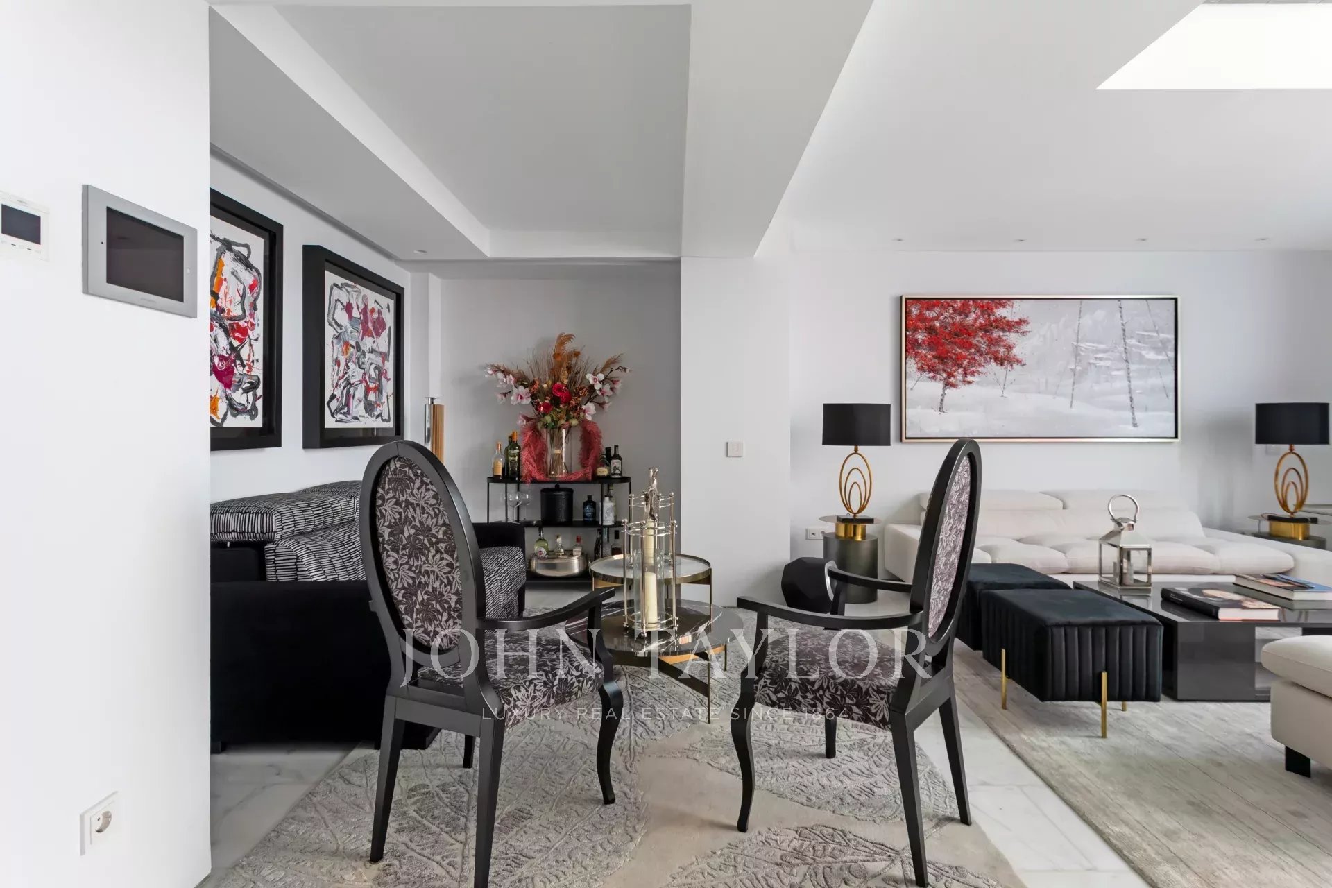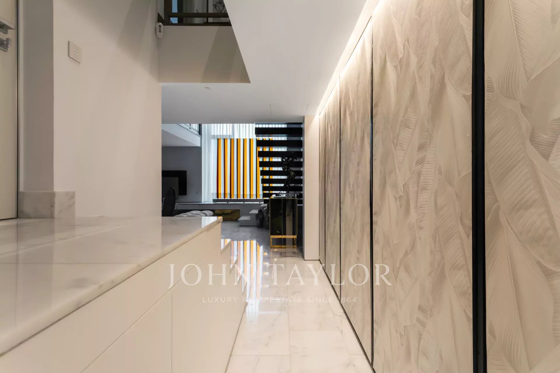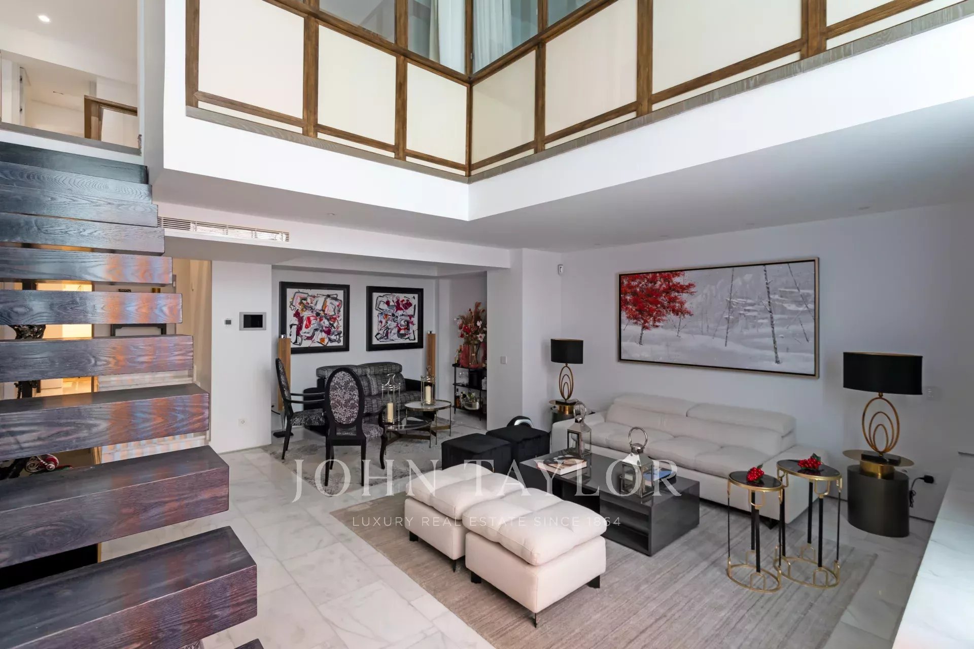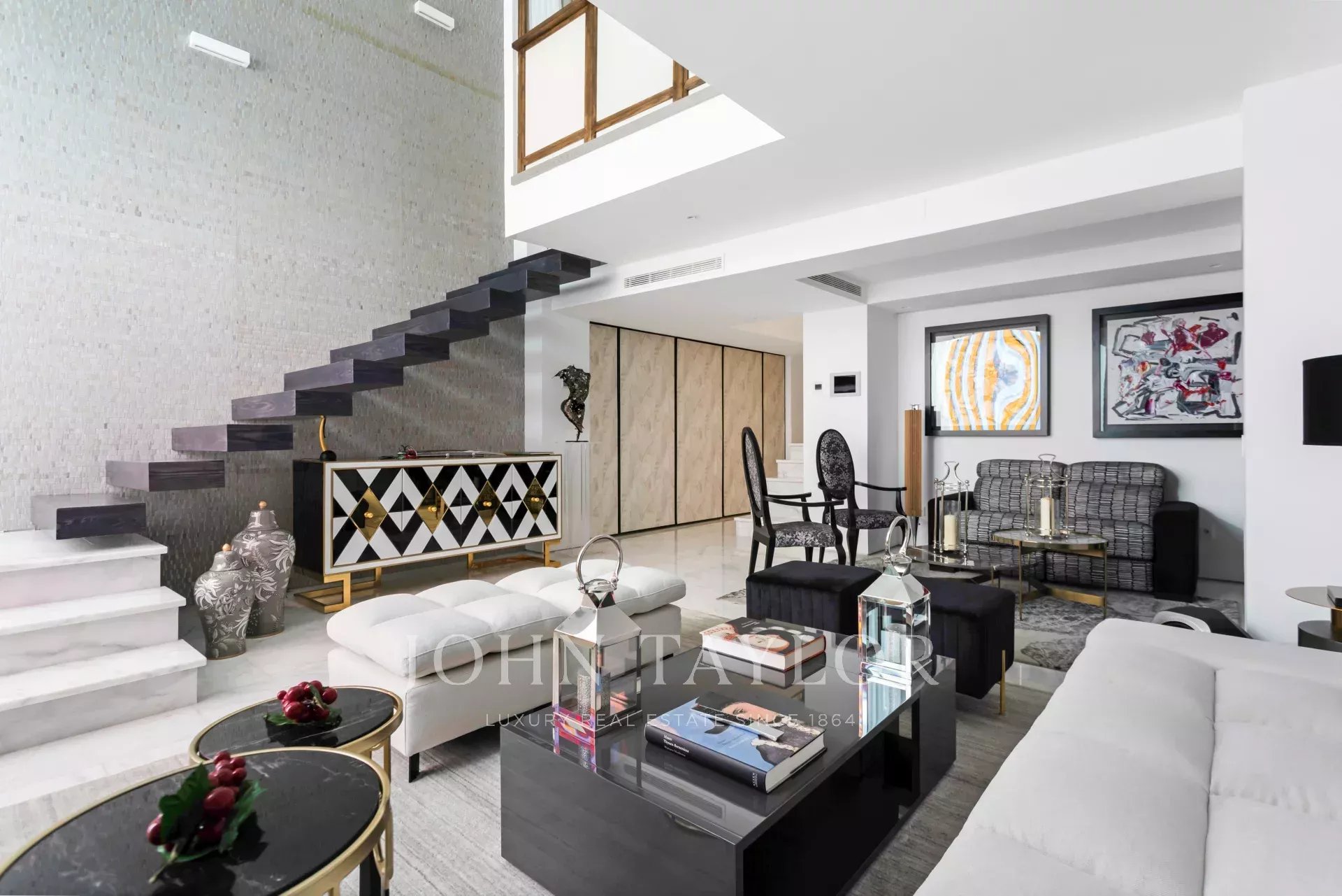 Al piano di accesso un ampio ingresso conduce a un soggiorno a doppia altezza composto da due stanze e con una splendida e luminosa finestra esposta a sud. Decorato con una favolosa opera d'arte di Carlos Eduardo Cruz-Díez non inclusa nel prezzo della casa. L'impianto audio è Bang & Olufsen. Su questo stesso piano sala da pranzo, cucina attrezzata con elettrodomestici di alta gamma e bagno per gli ospiti.