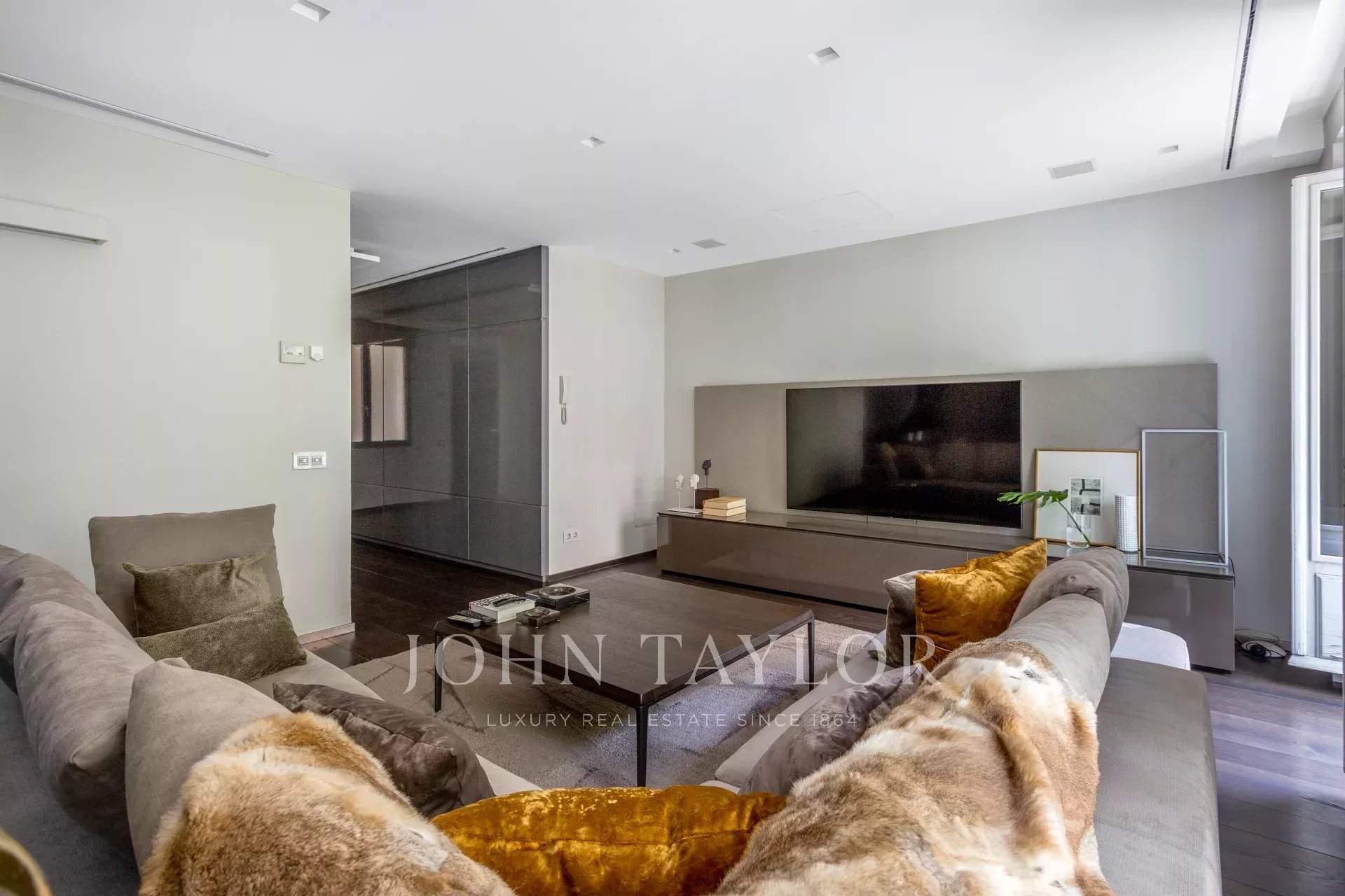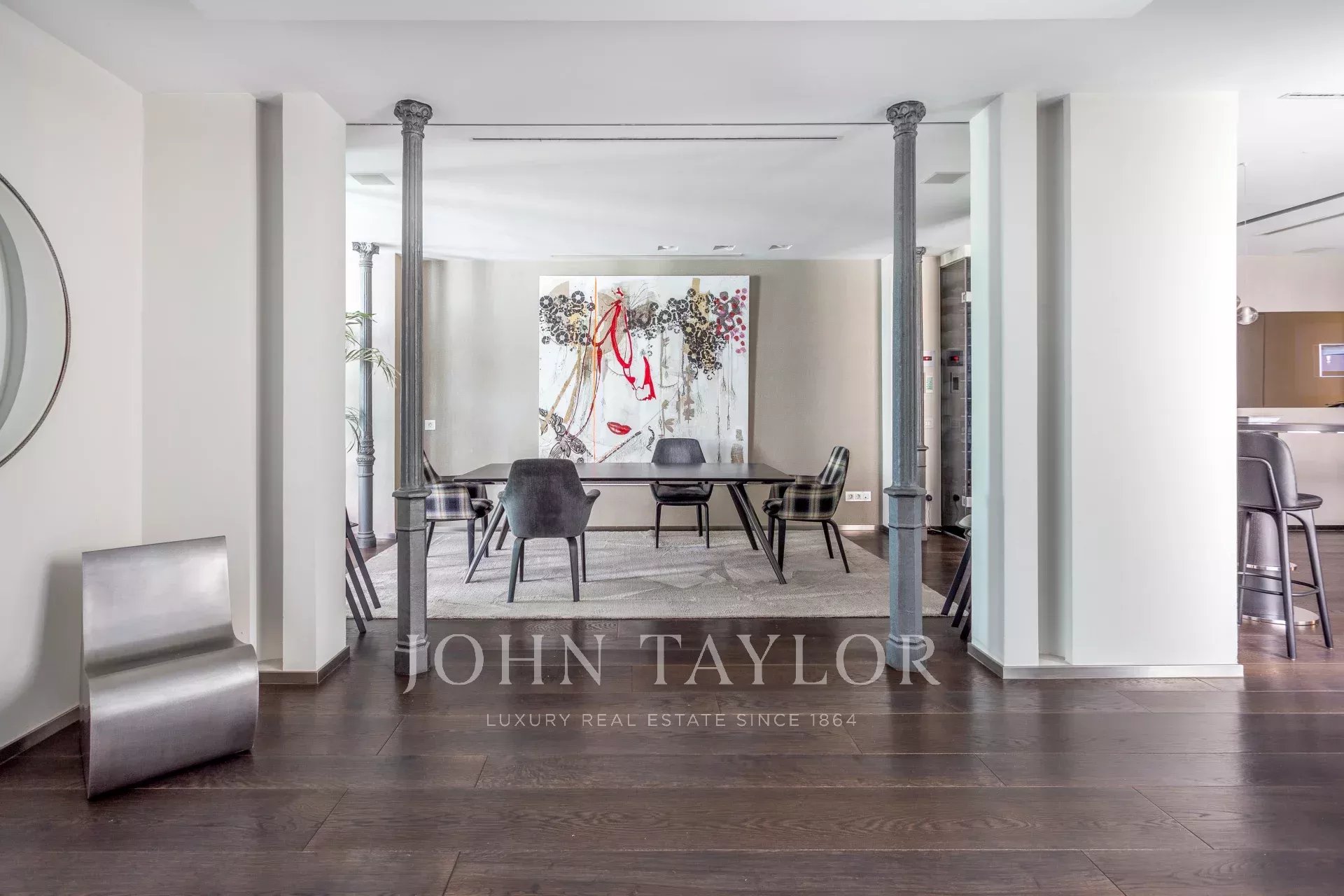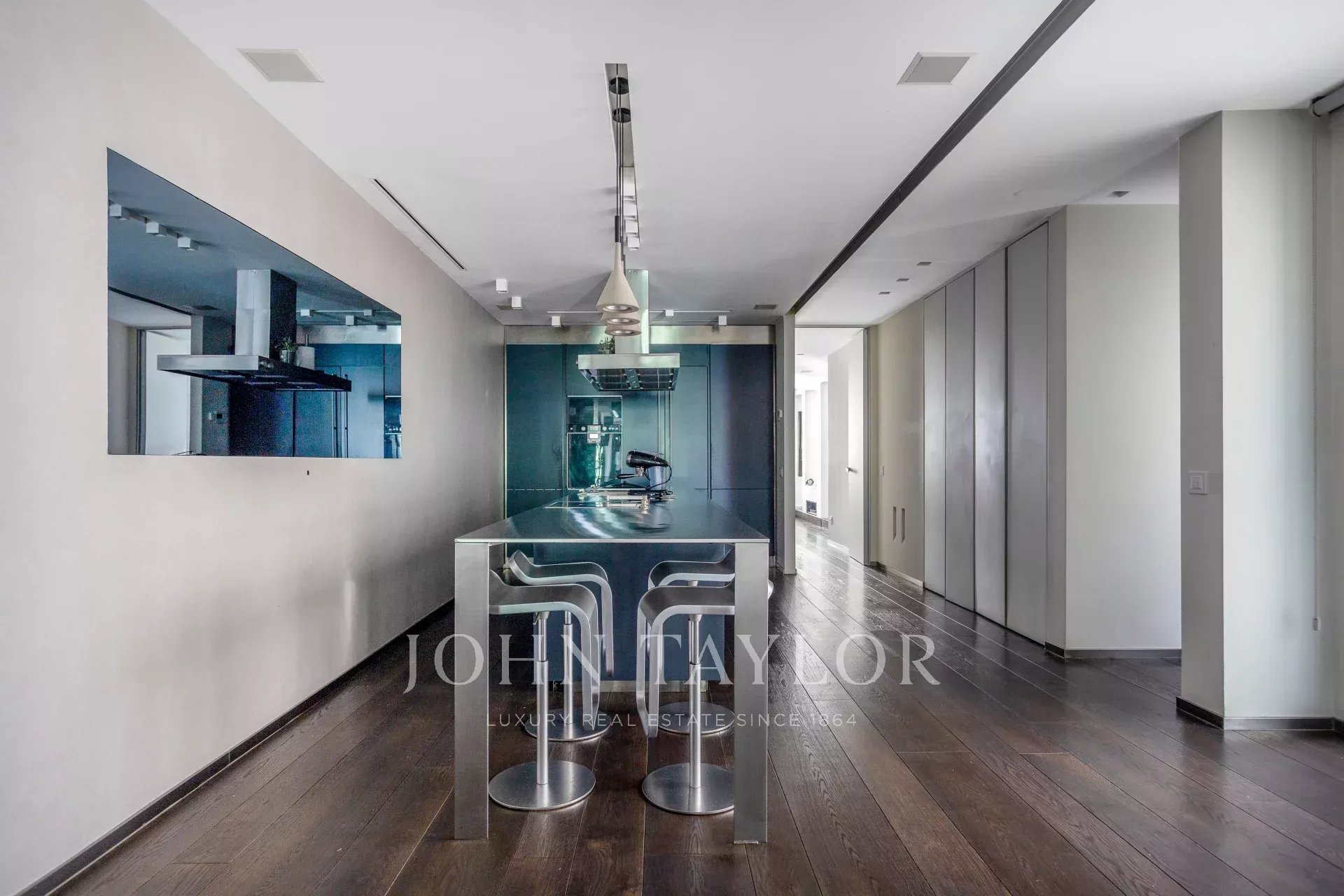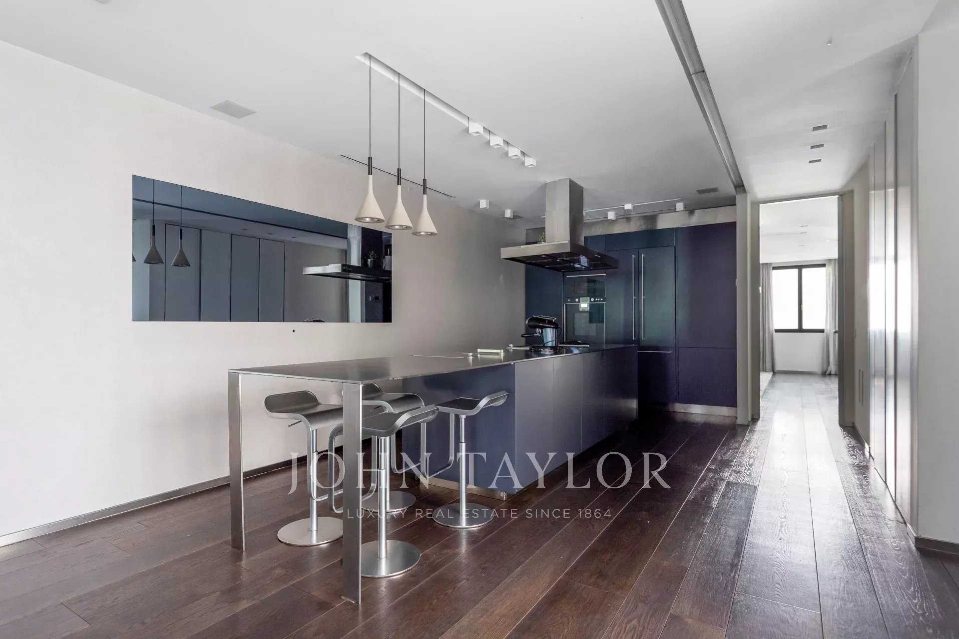 L'appartamento dispone di uno spazio sociale aperto con una zona giorno con due balconi e un punto di vista sulla strada, un'ampia sala da pranzo, un bagno per gli ospiti e una moderna cucina Gaggenau completamente attrezzata con i migliori elettrodomestici.
