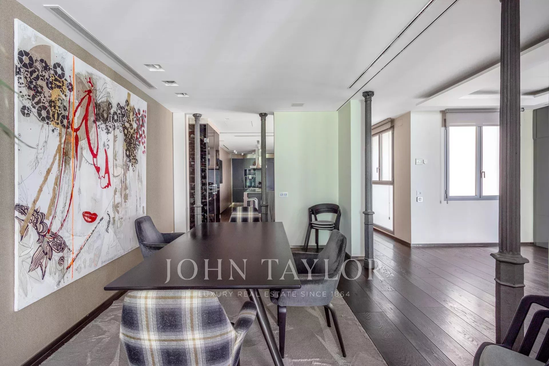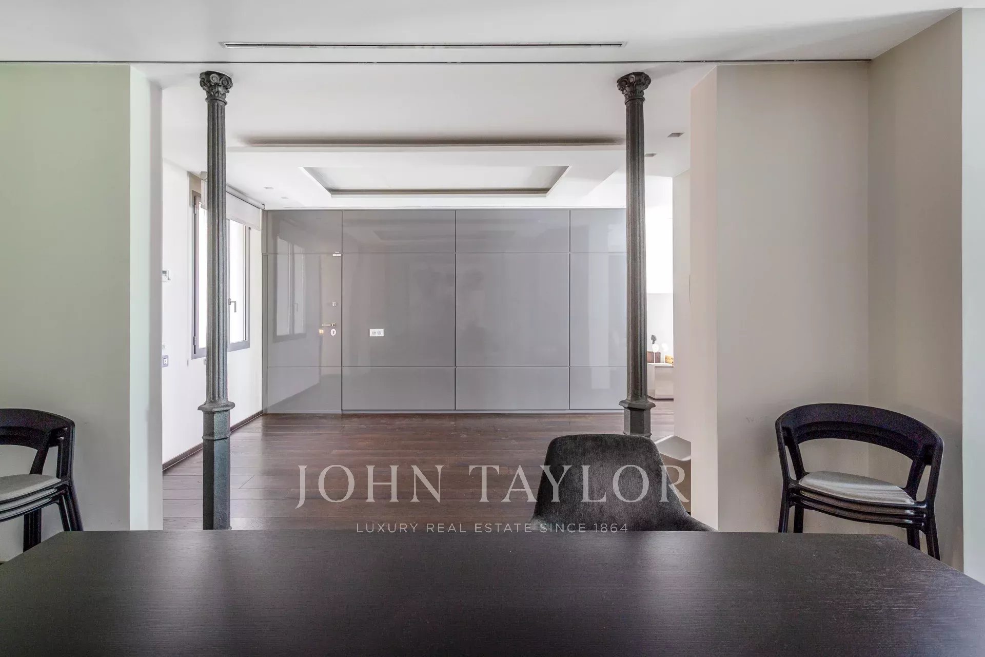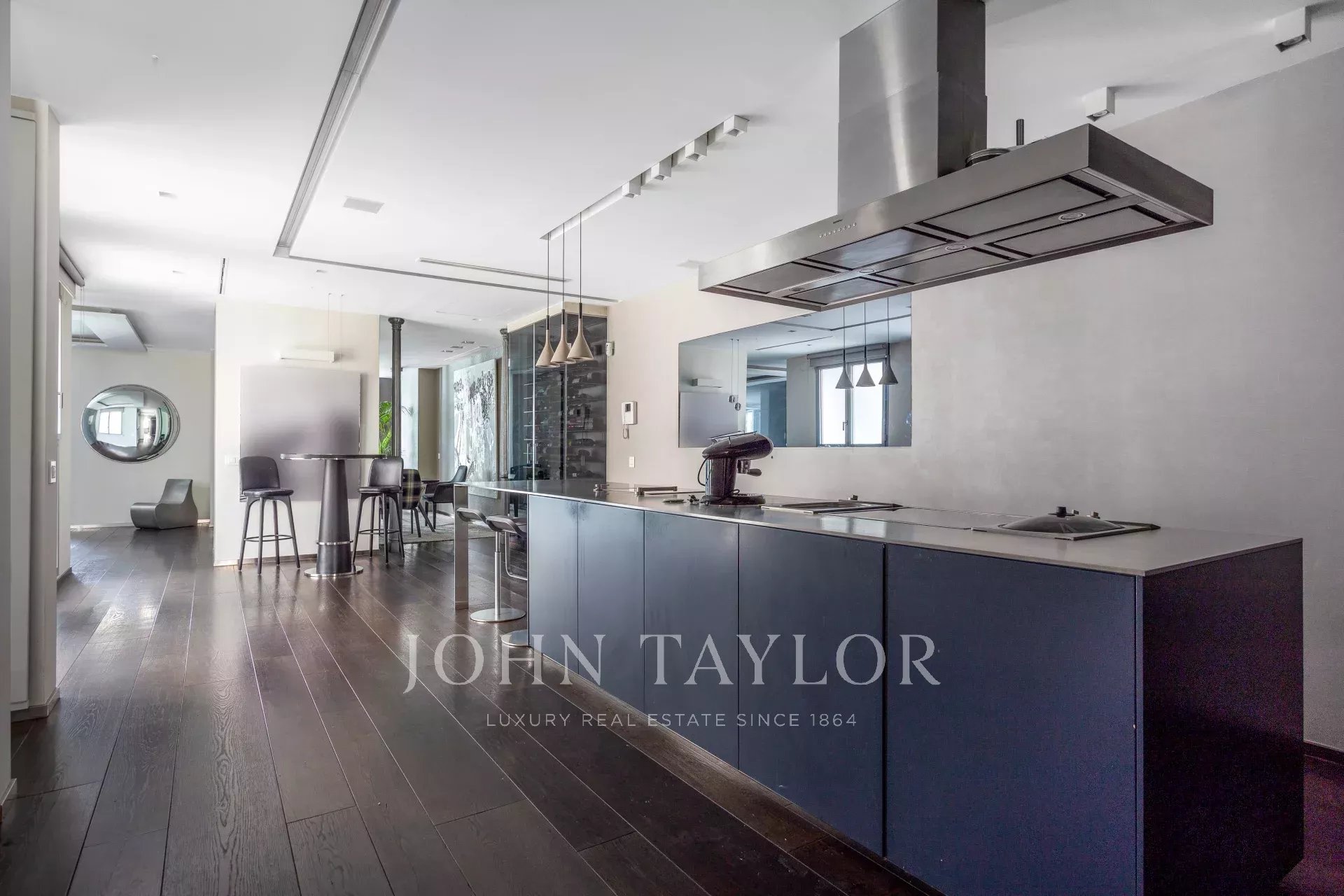 L'appartamento dispone di uno spazio sociale aperto con una zona giorno con due balconi e un punto di vista sulla strada, un'ampia sala da pranzo, un bagno per gli ospiti e una moderna cucina Gaggenau completamente attrezzata con i migliori elettrodomestici.