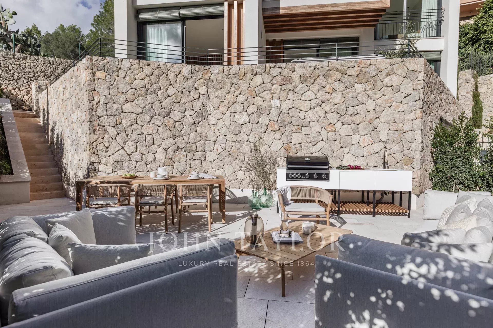 Completamente arredato con pezzi italiani su misura di Barzaghi Salotti ed Ethimo, ogni spazio riflette un'eccezionale maestria. Tutti i lavori di falegnameria - tra cui cucine, armadi e bagni - sono stati realizzati a mano da artigiani maiorchini, garantendo precisione e qualità.