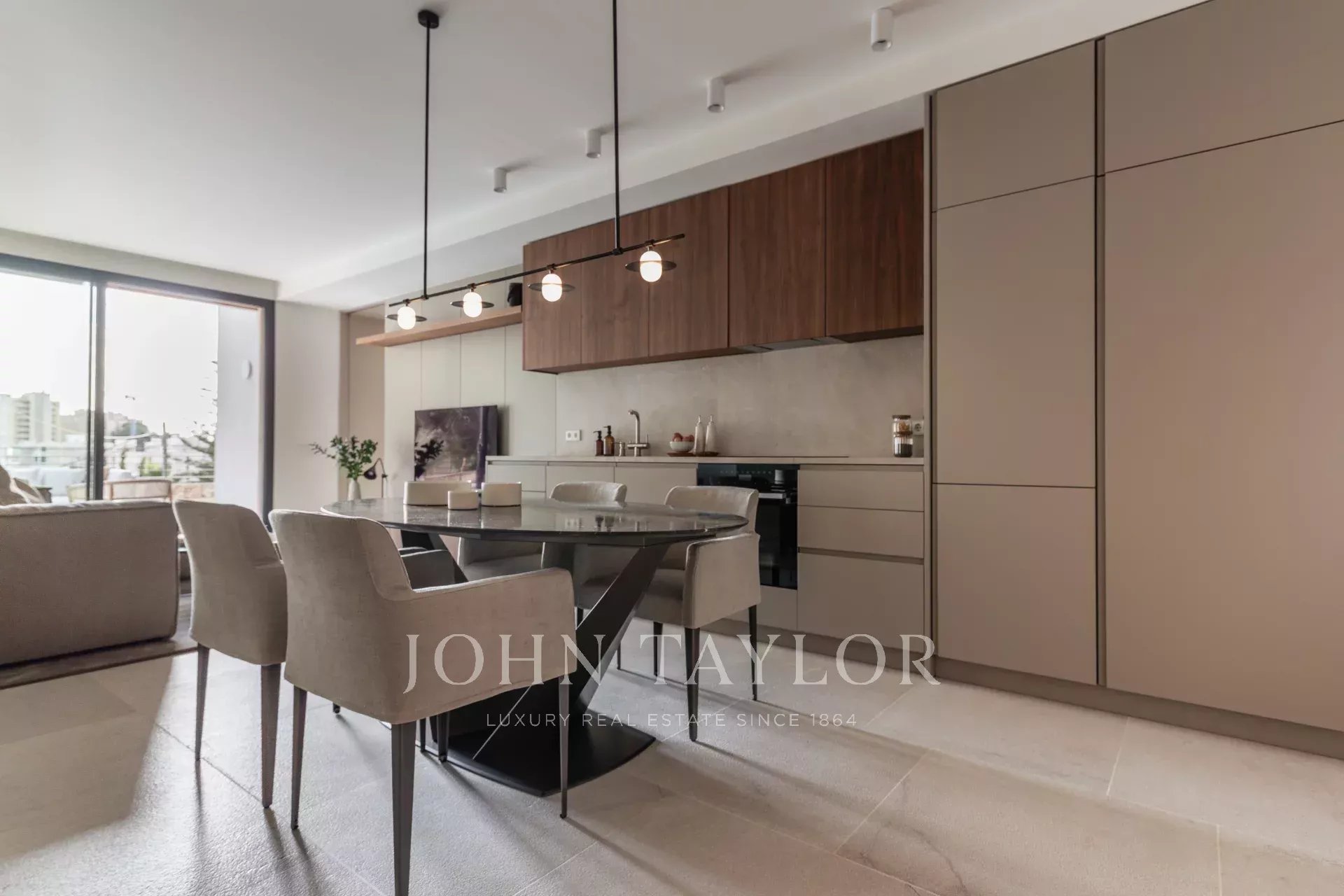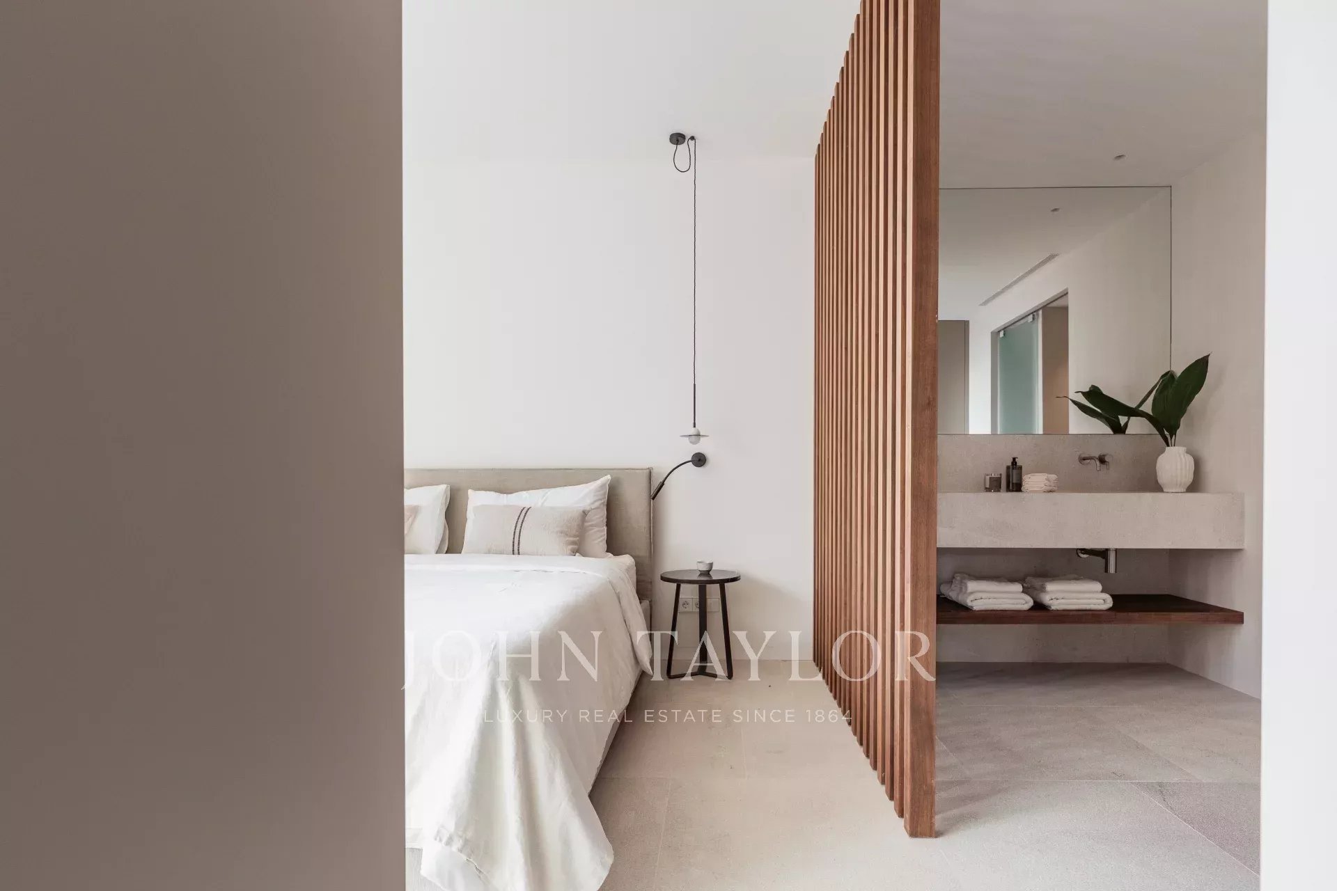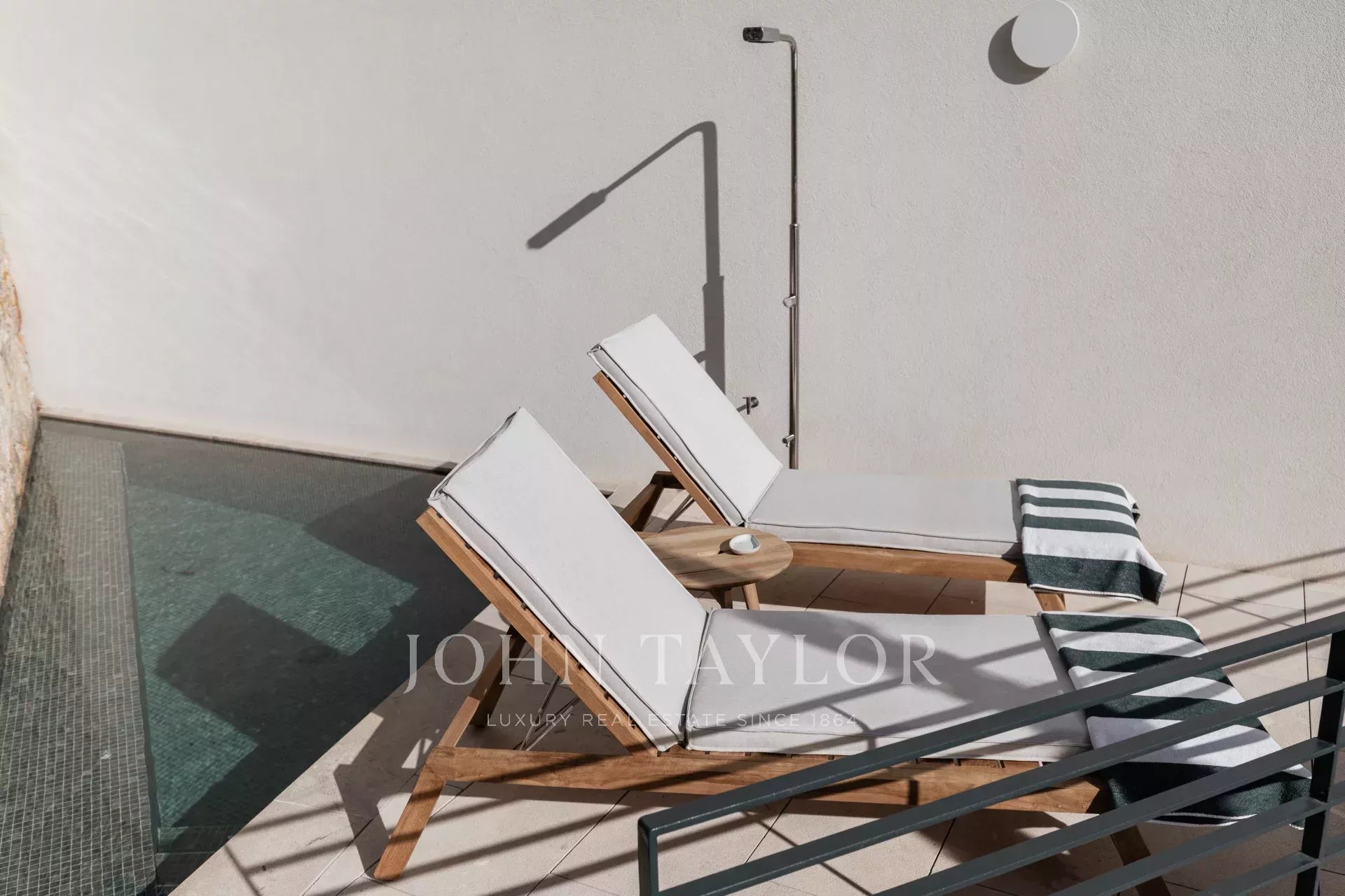 Questo appartamento al primo piano dispone di una suite padronale con bagno privato, di una seconda camera da letto e di un bagno, di una cucina a pianta aperta, di una sala da pranzo e di un soggiorno con accesso diretto alla spaziosa terrazza privata di 113 m2 e alla zona piscina, che conduce al giardino di 50 m2. La proprietà è completata da una lavanderia privata e da un magazzino.