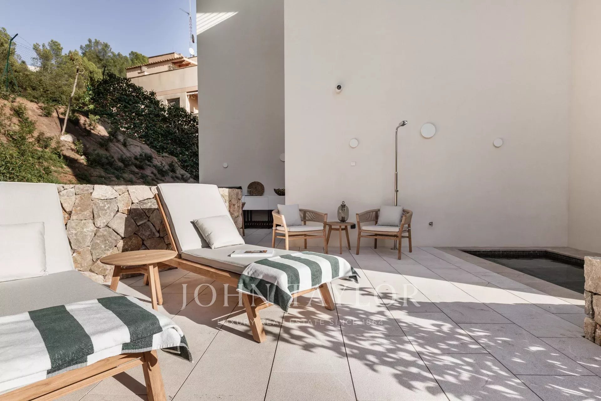 Completamente arredata con pezzi italiani su misura di Barzaghi Salotti ed Ethimo, ogni spazio riflette un'eccezionale maestria. Tutti i lavori di falegnameria, comprese le cucine, gli armadi e i bagni, sono stati realizzati a mano da artigiani di Maiorca, garantendo precisione e qualità.