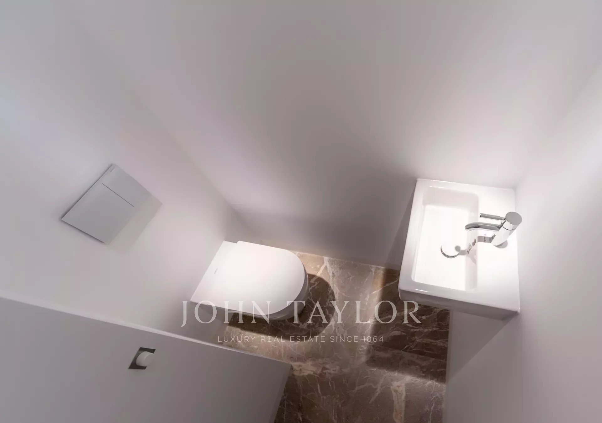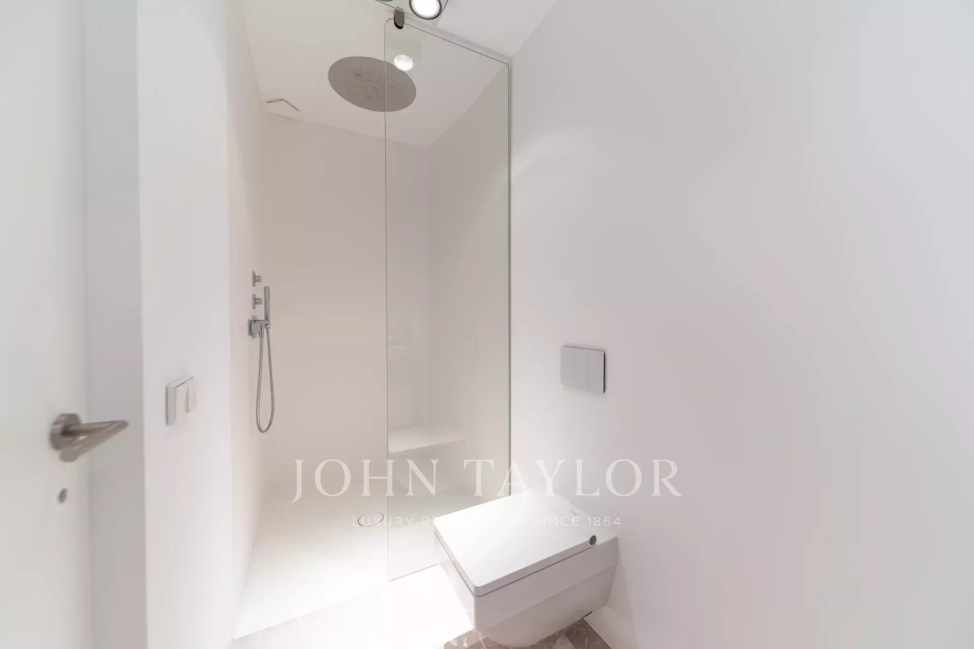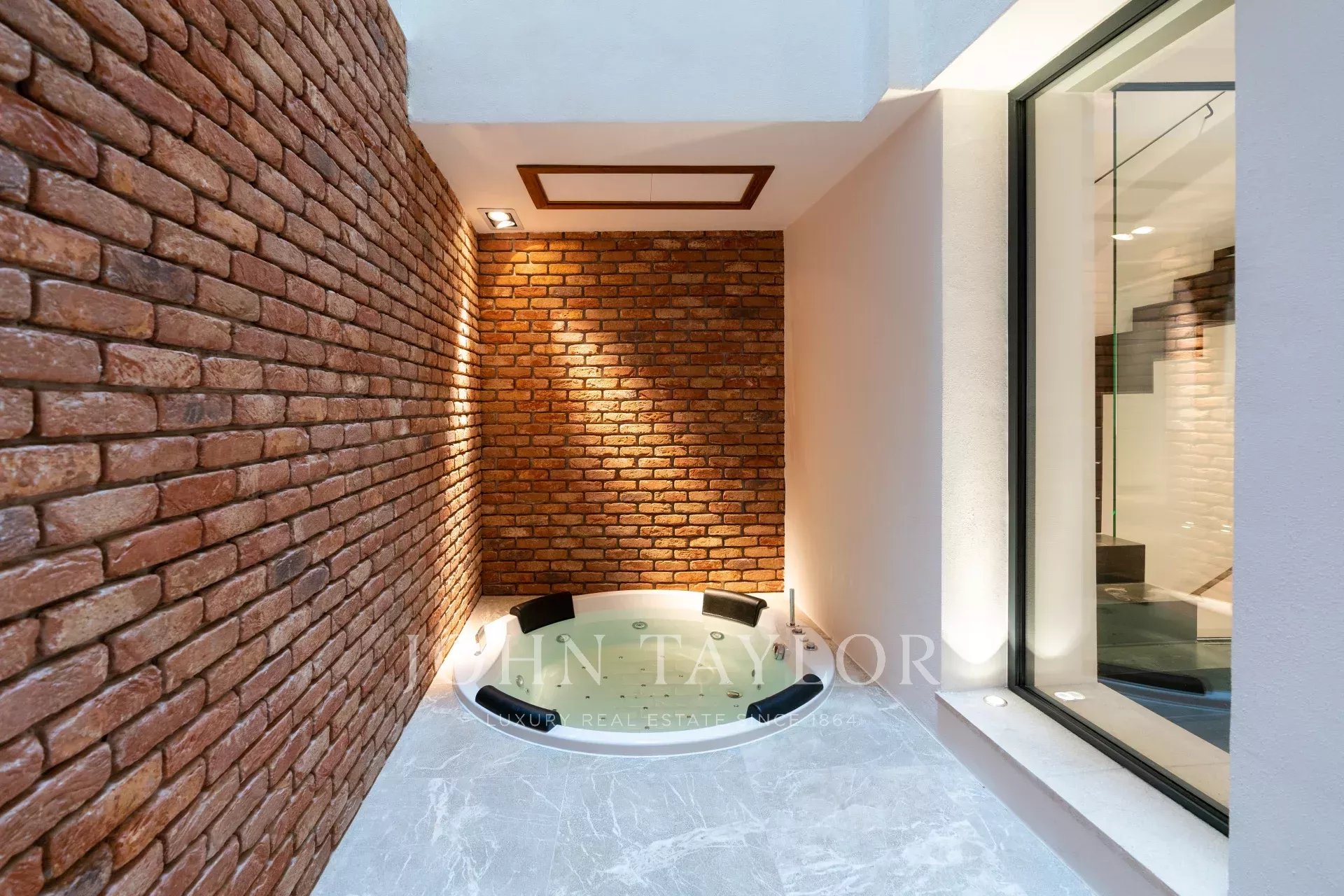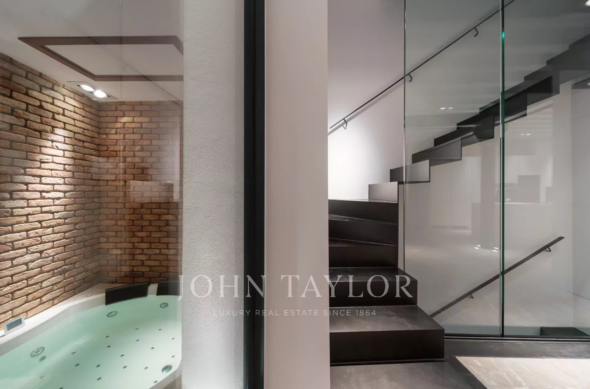 Una suggestiva scala in ferro nero, racchiusa da balaustre in vetro, conduce al livello superiore, dove si trovano due generose camere da letto con bagno privato. Gli eleganti pavimenti in legno a spina di pesce e gli armadietti a muro su misura combinano il fascino autentico con la raffinatezza contemporanea.