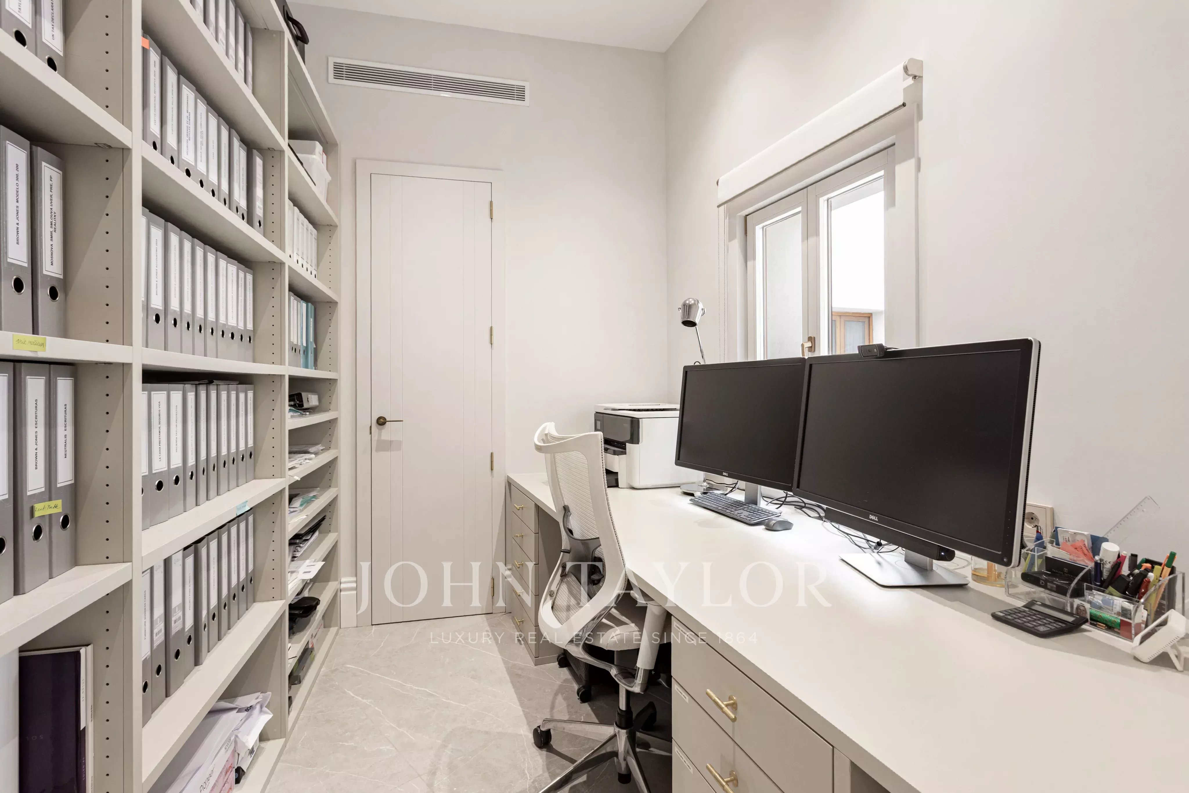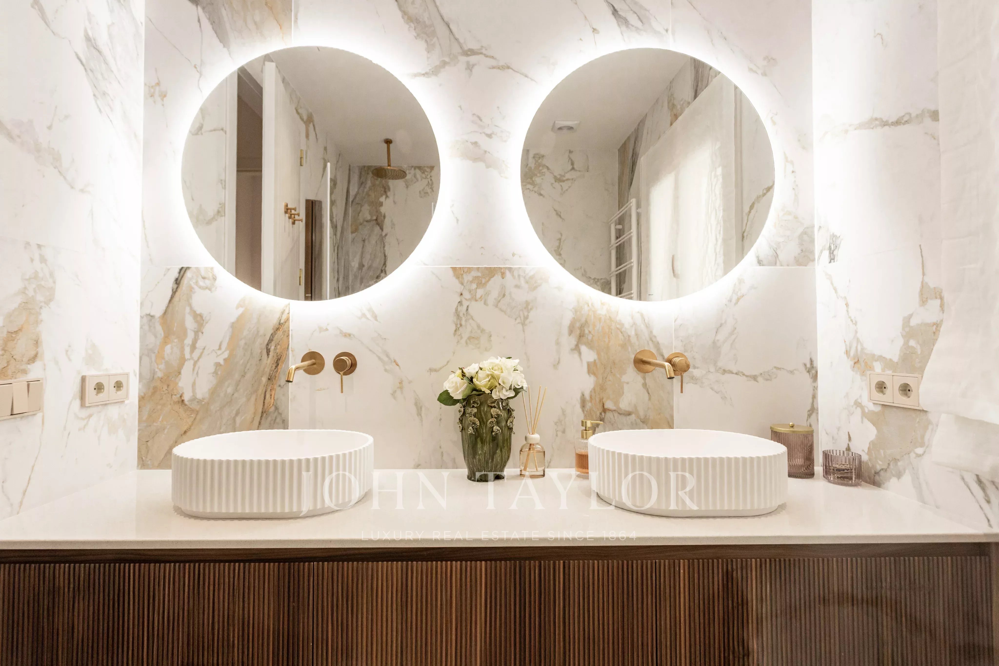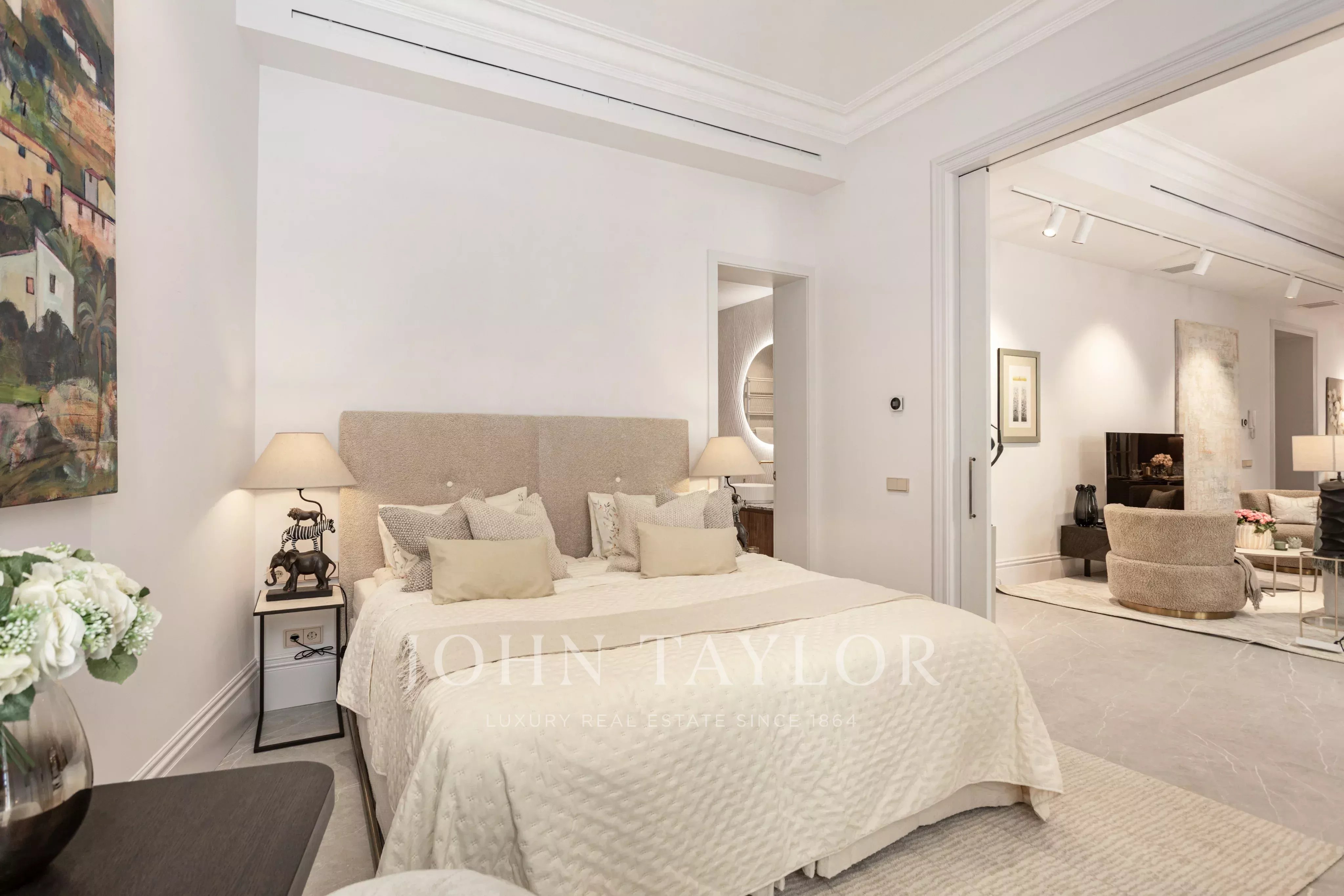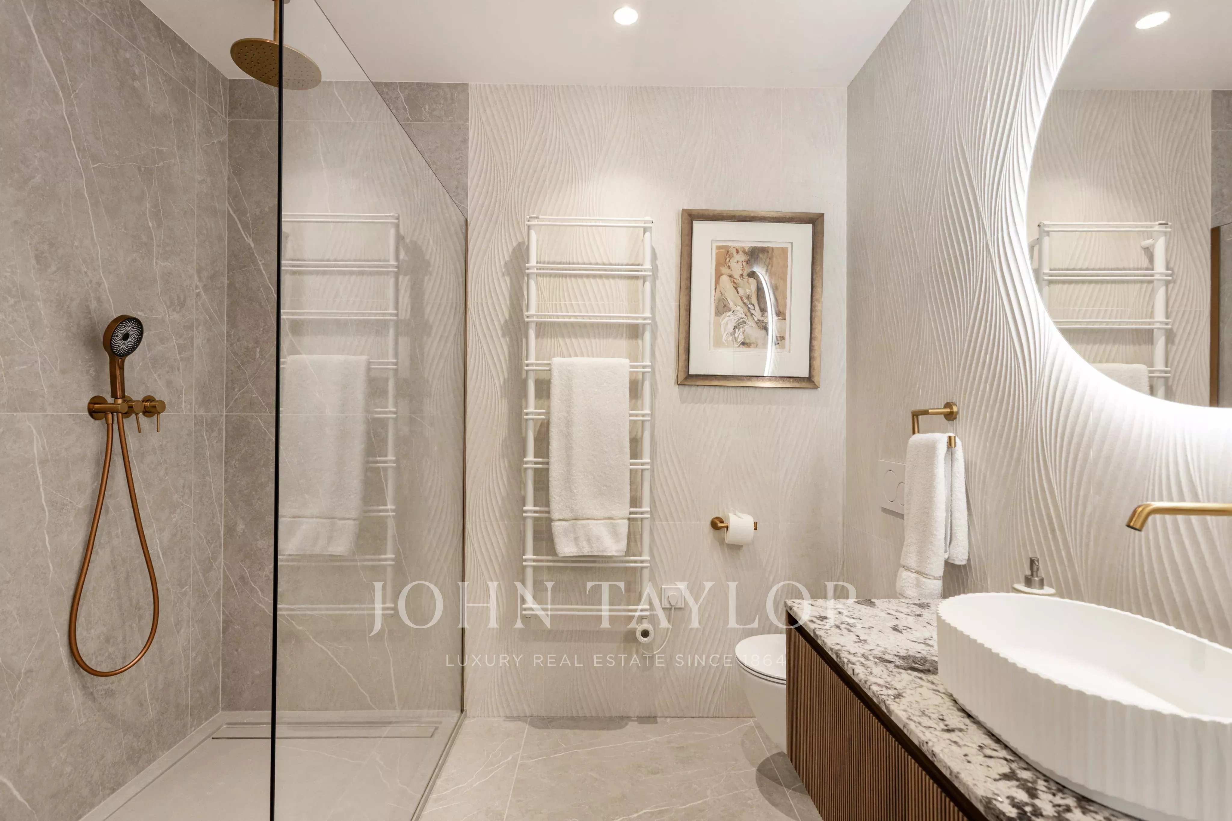 Offre un design d'interni impeccabile, una cucina a pianta aperta molto spaziosa completamente attrezzata, zona pranzo e soggiorno eleganti, con molta luce naturale grazie alle sue finestre dal pavimento al soffitto. Un incantevole balcone francese aggiunge eleganza e carattere all'appartamento. L'appartamento dispone di due camere da letto grandi, ognuna con bagno privato. Inoltre, c'è un ufficio e una lavanderia. Una perfetta combinazione di comfort, stile e posizione privilegiata.