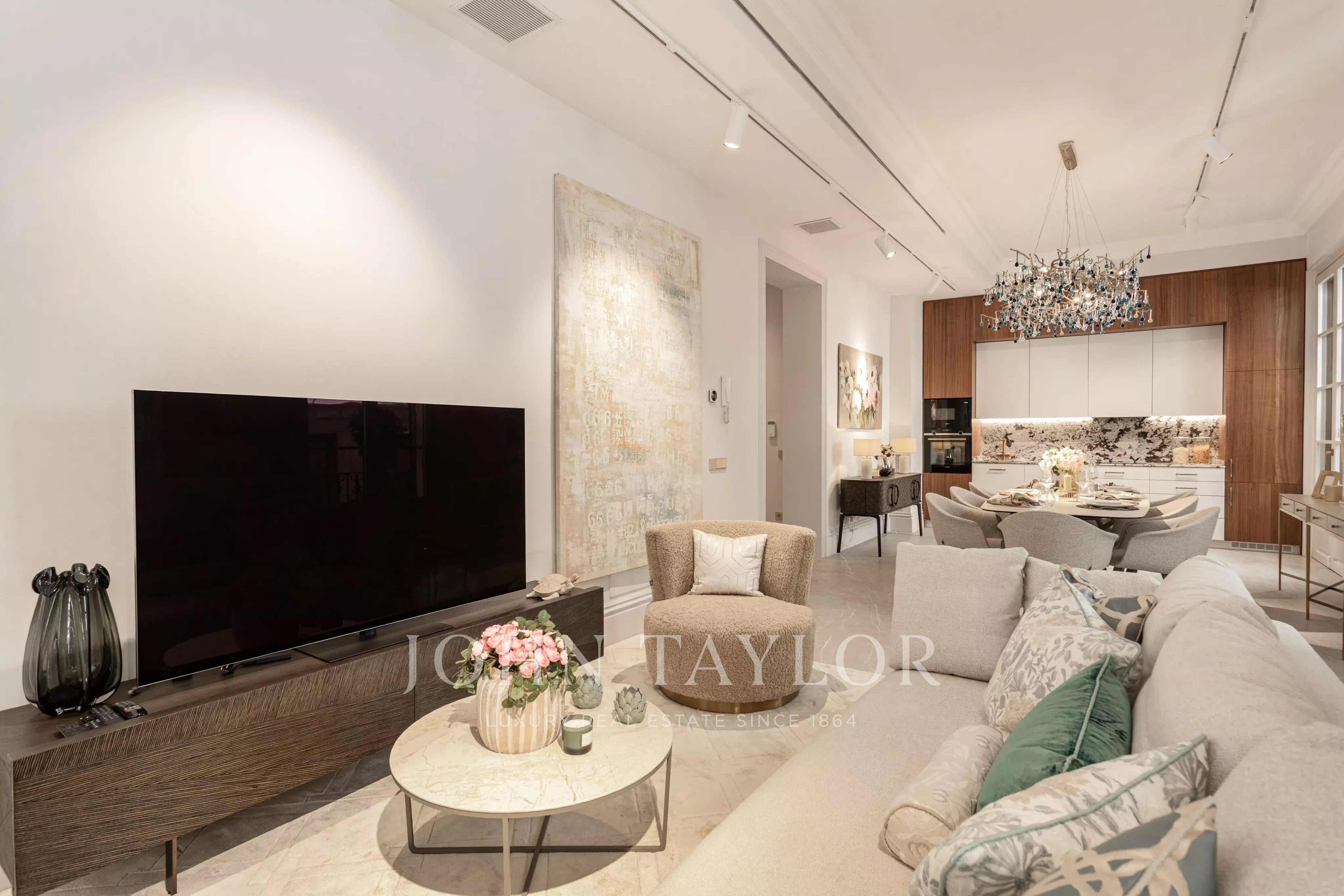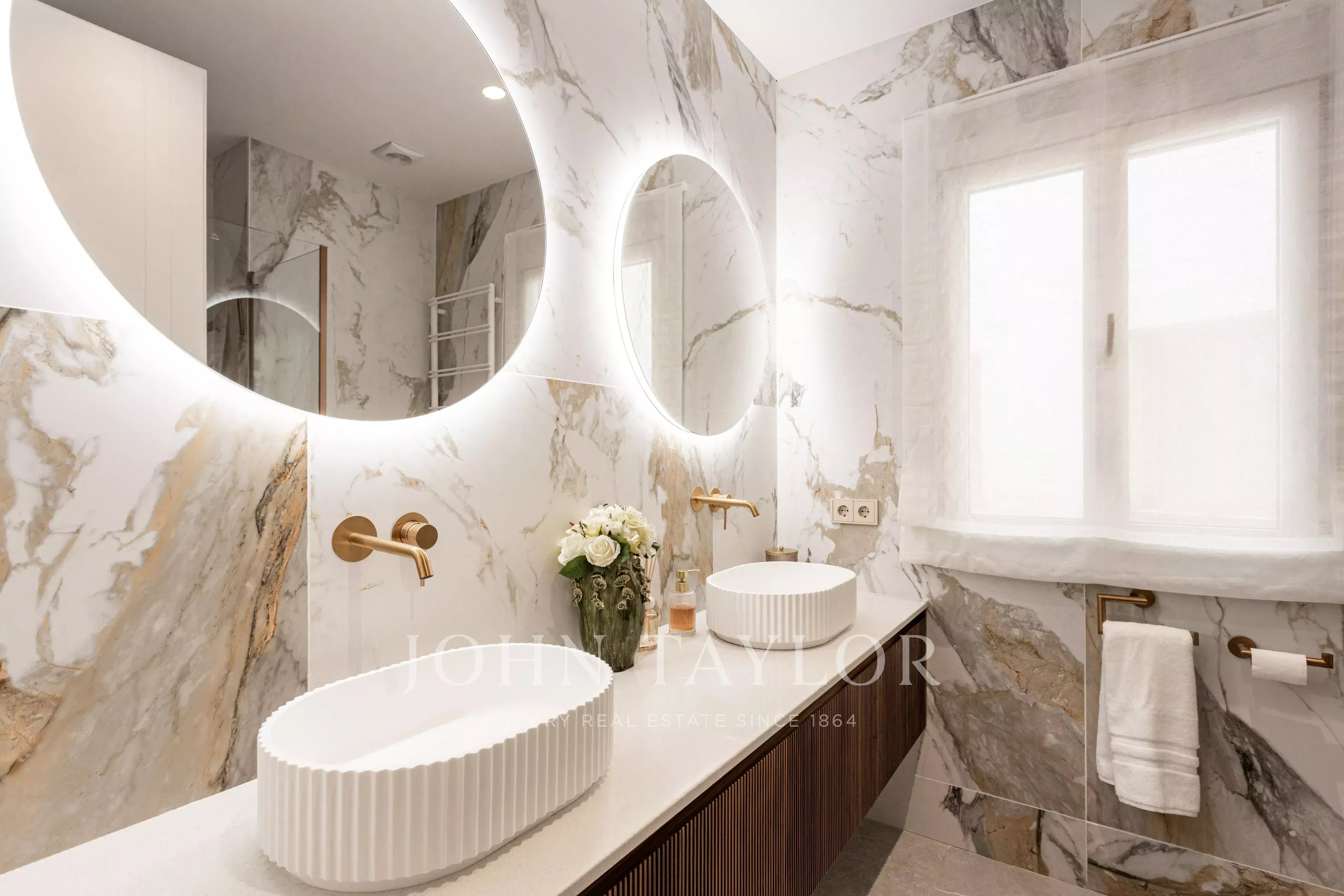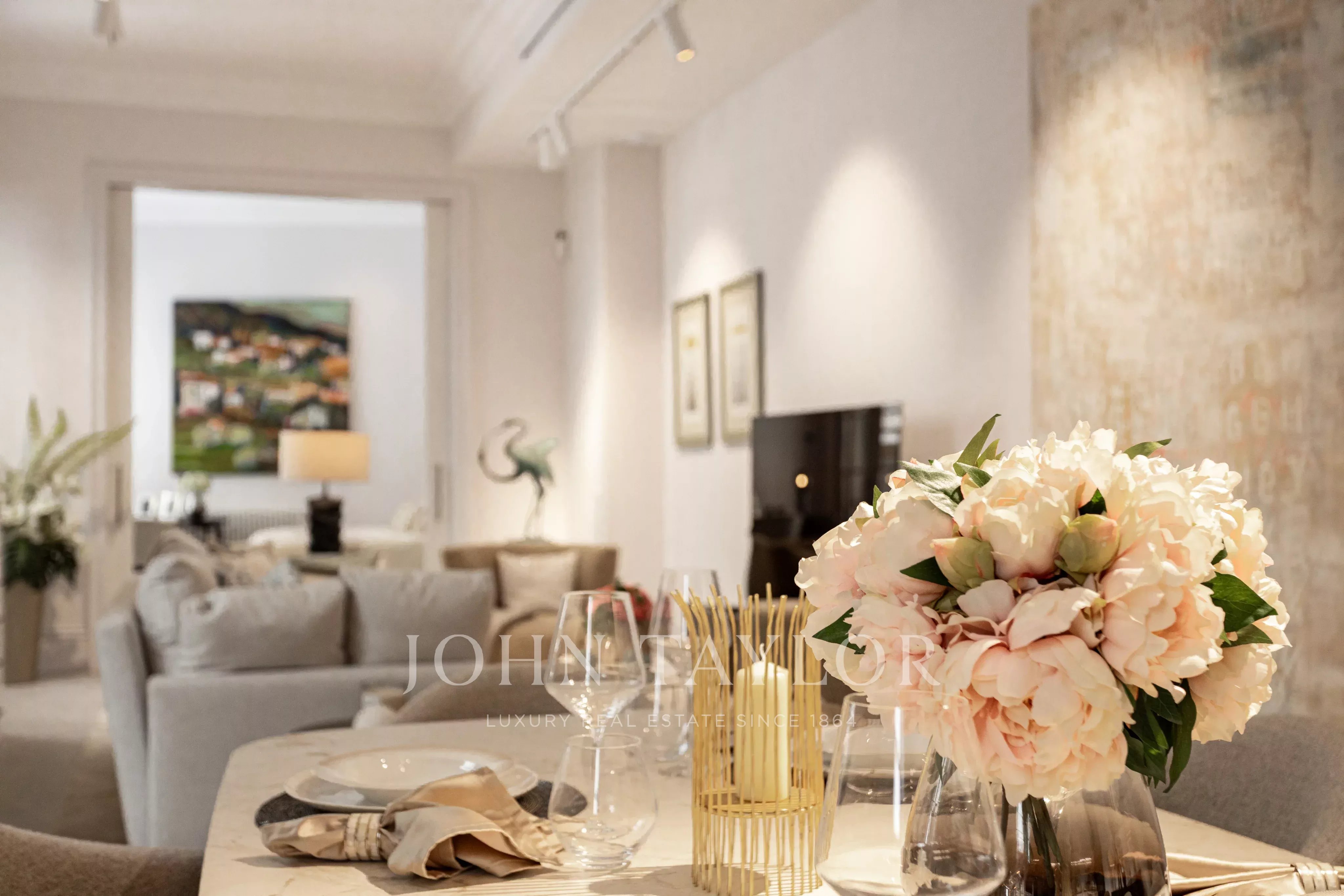 Offre un design d'interni impeccabile, una cucina a pianta aperta molto spaziosa completamente attrezzata, zona pranzo e soggiorno eleganti, con molta luce naturale grazie alle sue finestre dal pavimento al soffitto. Un incantevole balcone francese aggiunge eleganza e carattere all'appartamento. L'appartamento dispone di due camere da letto grandi, ognuna con bagno privato. Inoltre, c'è un ufficio e una lavanderia. Una perfetta combinazione di comfort, stile e posizione privilegiata.