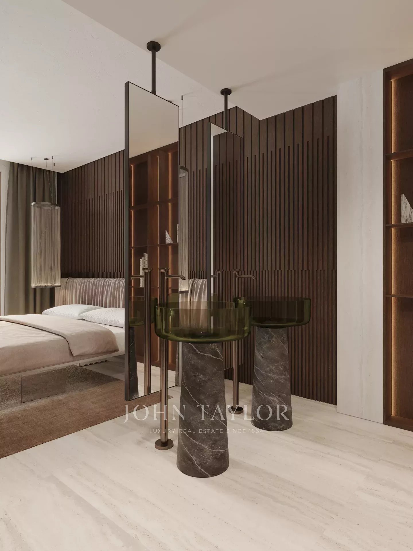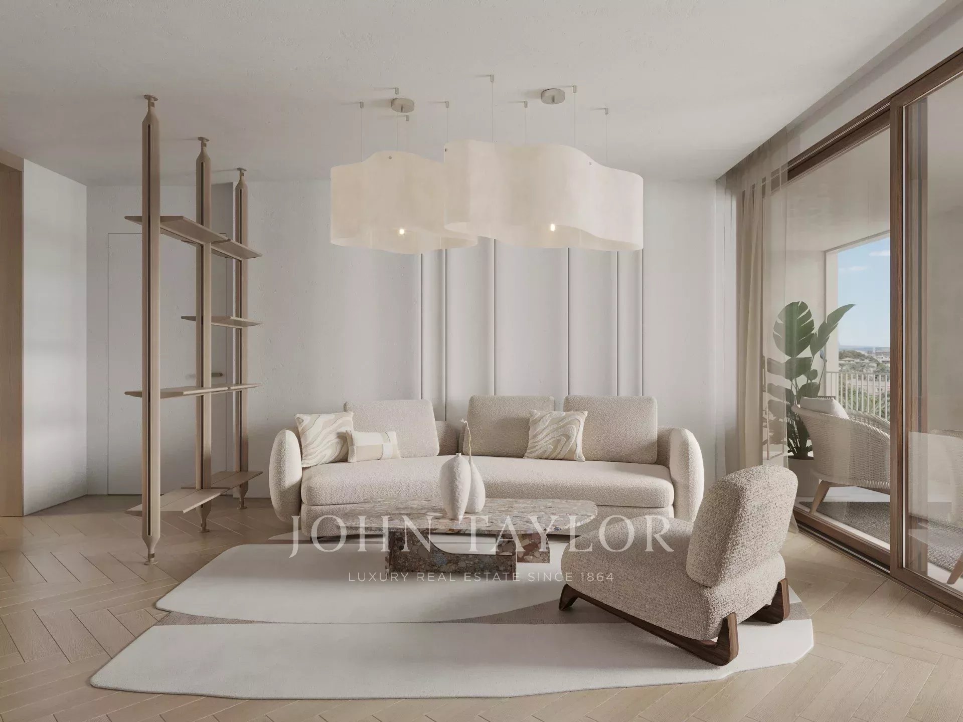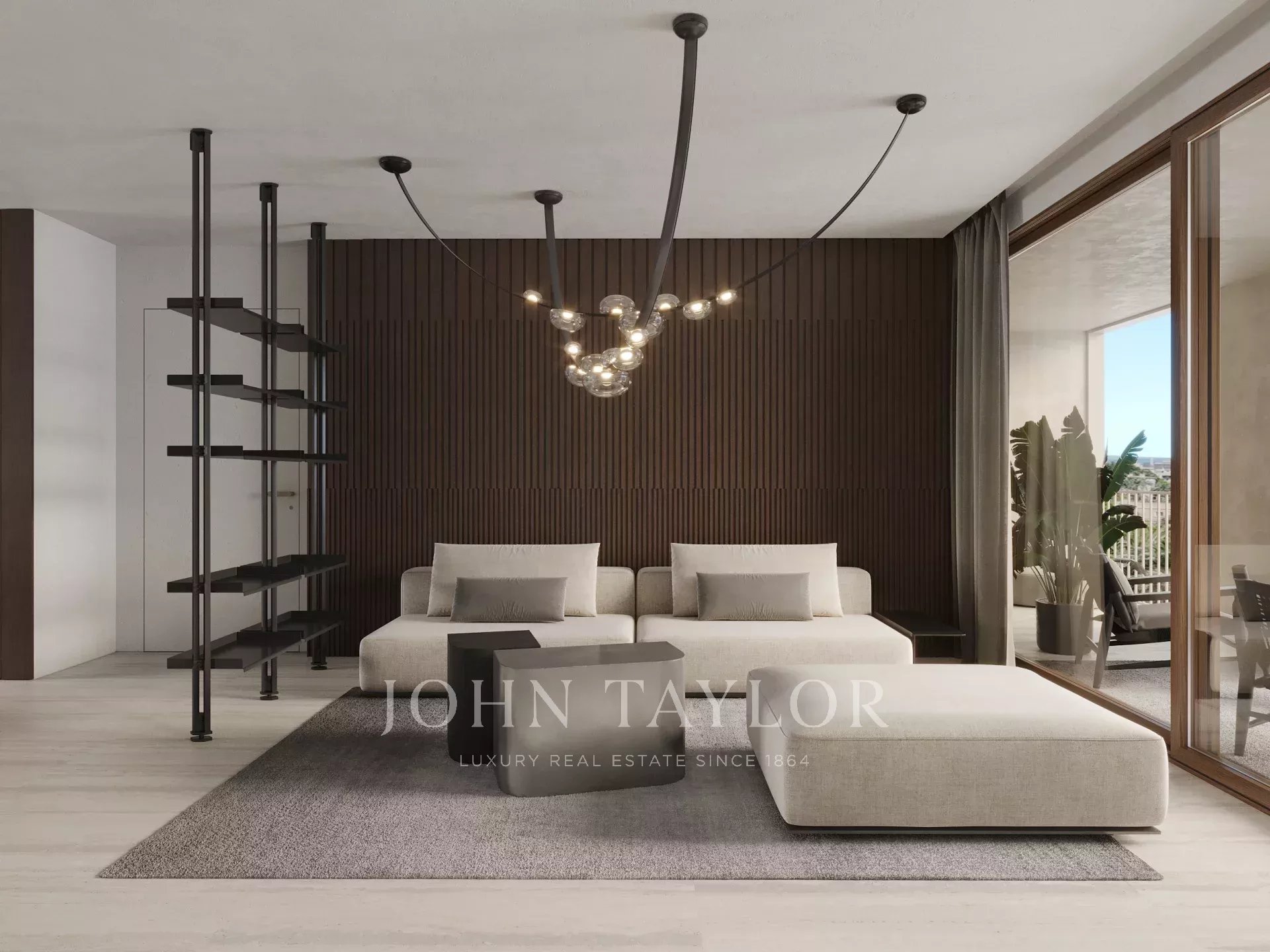 Questo appartamento al primo piano offre una disposizione a pianta aperta con una cucina completamente attrezzata, una zona pranzo e un soggiorno con finestre a tutta altezza che assicurano la massima luce naturale e che conducono all'accogliente portico coperto, creando un flusso confortevole in tutto l'appartamento. È completo di due camere da letto e due bagni (1 en suite). La superficie interna totale è di 95 m² con una terrazza coperta di 7 m².