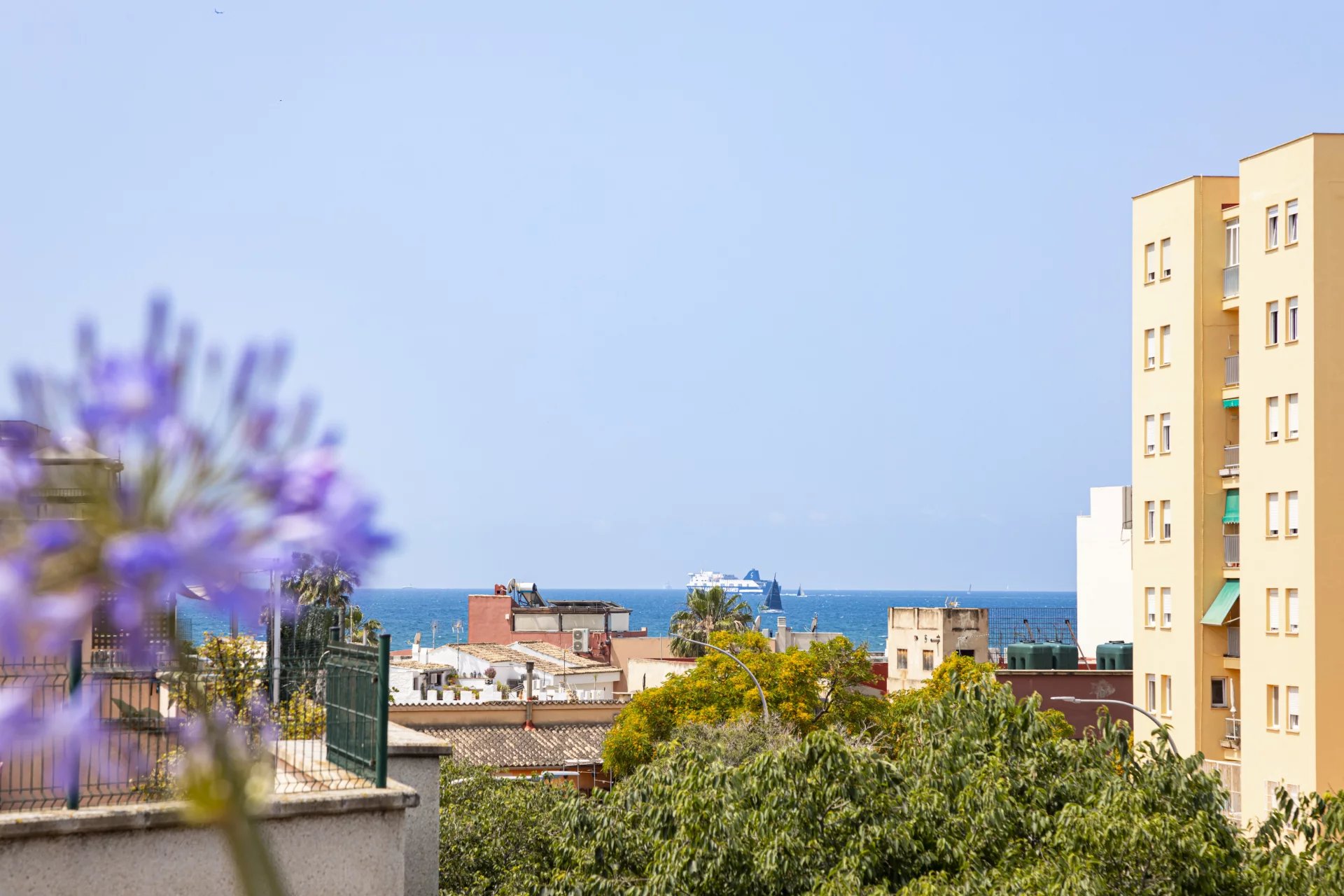 Gli interni comprendono un soggiorno e una zona pranzo open-concept con ampie finestre che inondano lo spazio di luce naturale. La camera da letto principale è spaziosa, mentre la seconda camera da letto è attualmente utilizzata come home office, offrendo flessibilità per il lavoro a distanza. Dalla terrazza inferiore si gode di una vista parziale sul mare e di un'atmosfera tranquilla a pochi passi dal Mediterraneo.