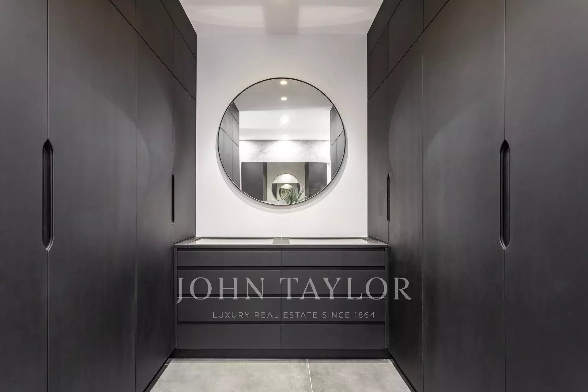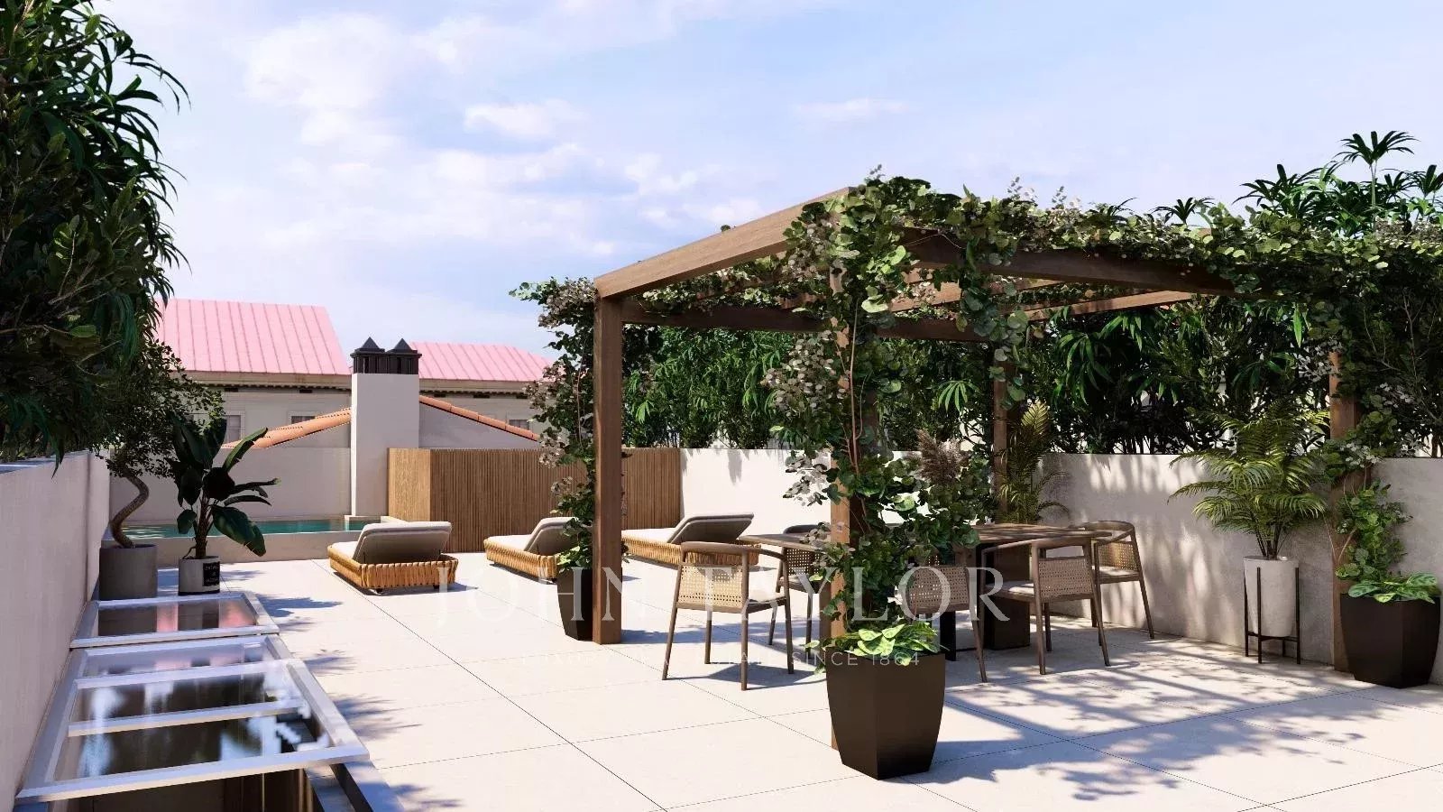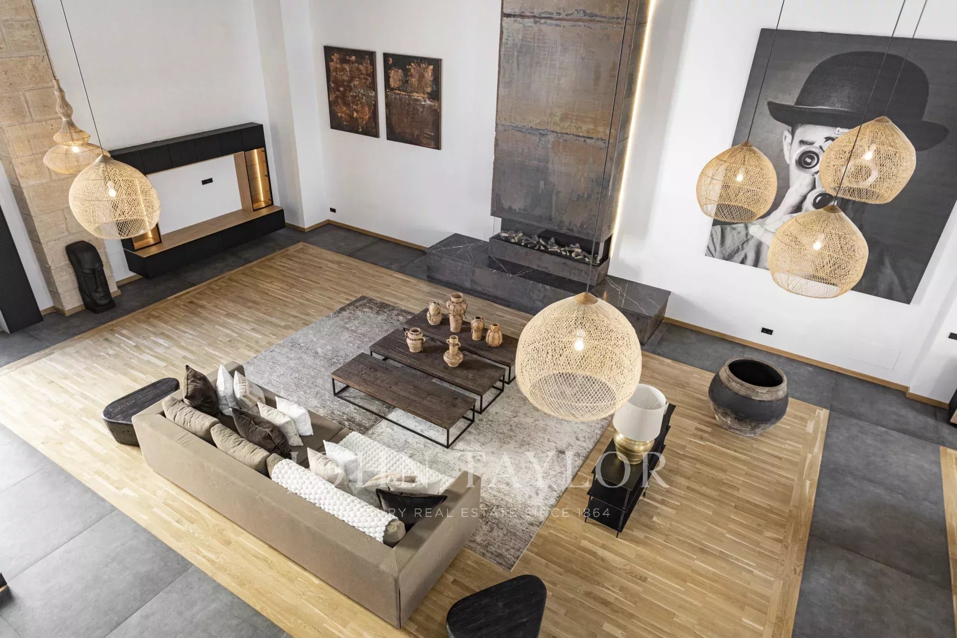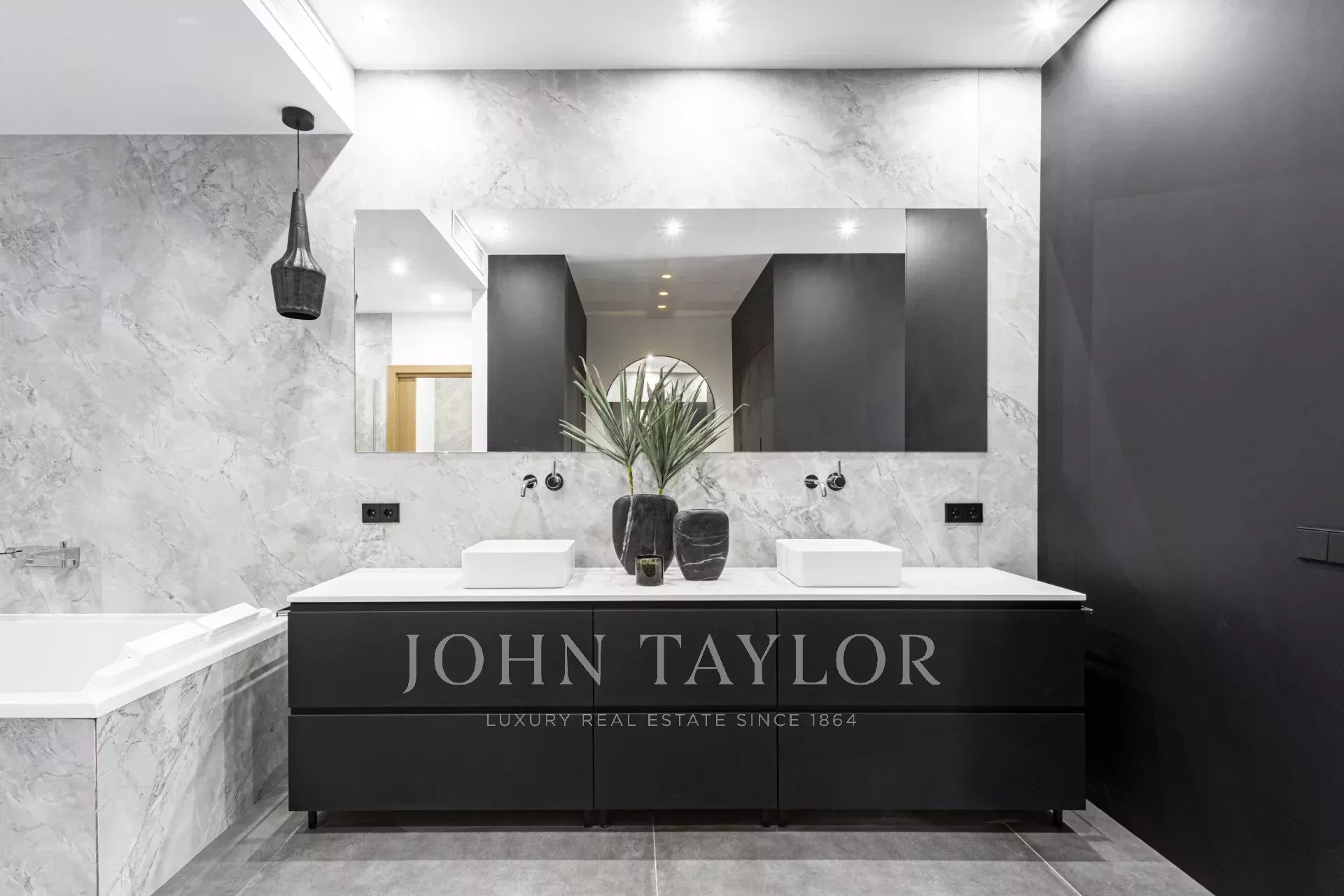 La camera da letto principale, con zona spogliatoio e bagno privato, garantisce il massimo comfort di vita su un unico piano. Al primo piano si accede tramite le "scale galleggianti" alle altre due camere da letto, entrambe con bagno privato, e a un'ulteriore area salotto. La terrazza sul tetto di 100 mq è senza dubbio il fiore all'occhiello, con una cucina esterna, una zona pranzo e un'area lounge completate dal dolce suono della fontana d'acqua. La proprietà dispone di parcheggio esterno, riscaldamento a pavimento, aria condizionata centralizzata e viene venduta arredata.