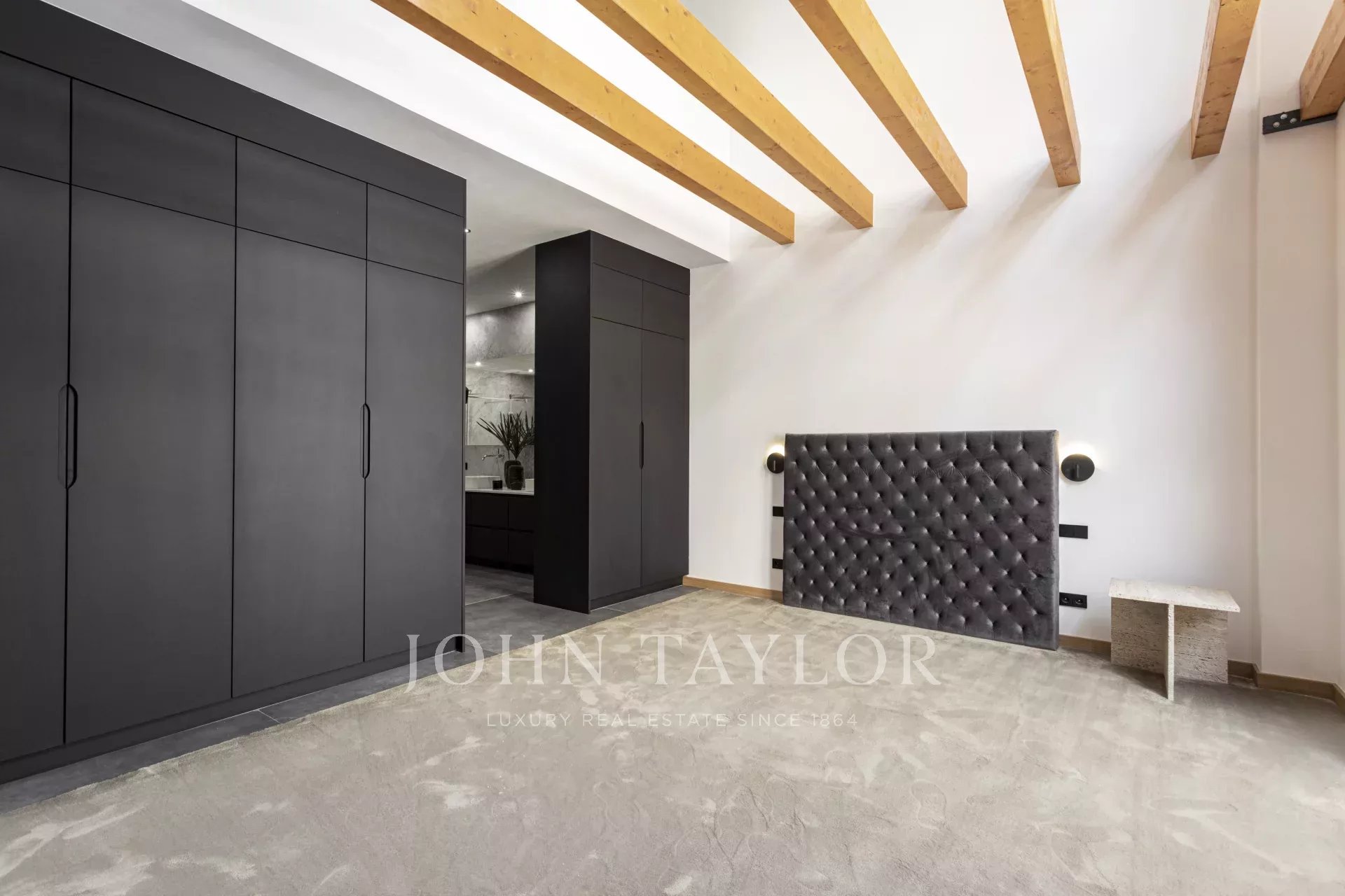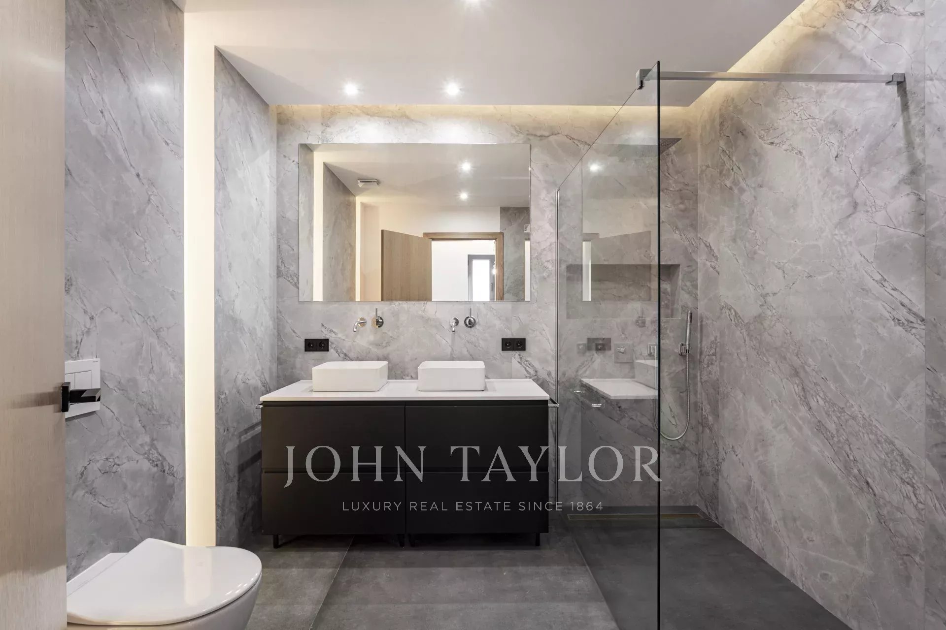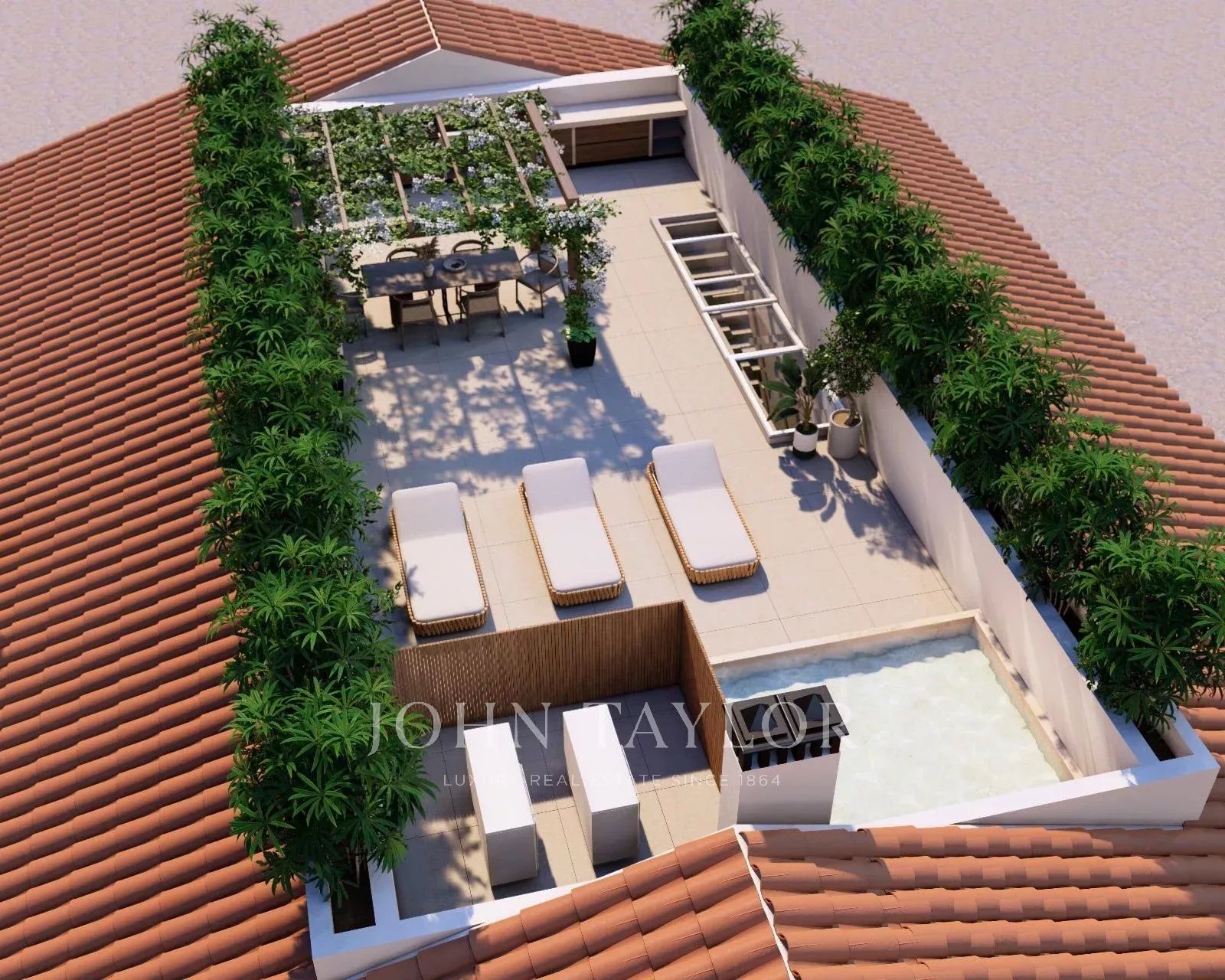 La camera da letto principale, con zona spogliatoio e bagno privato, garantisce il massimo comfort di vita su un unico piano. Al primo piano si accede tramite le "scale galleggianti" alle altre due camere da letto, entrambe con bagno privato, e a un'ulteriore area salotto. La terrazza sul tetto di 100 mq è senza dubbio il fiore all'occhiello, con una cucina esterna, una zona pranzo e un'area lounge completate dal dolce suono della fontana d'acqua. La proprietà dispone di parcheggio esterno, riscaldamento a pavimento, aria condizionata centralizzata e viene venduta arredata.