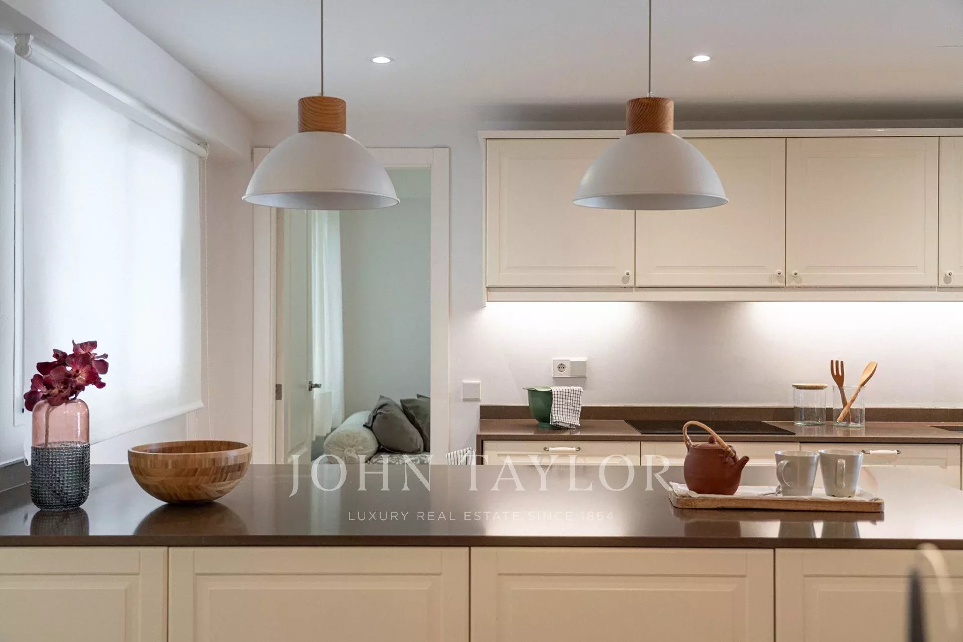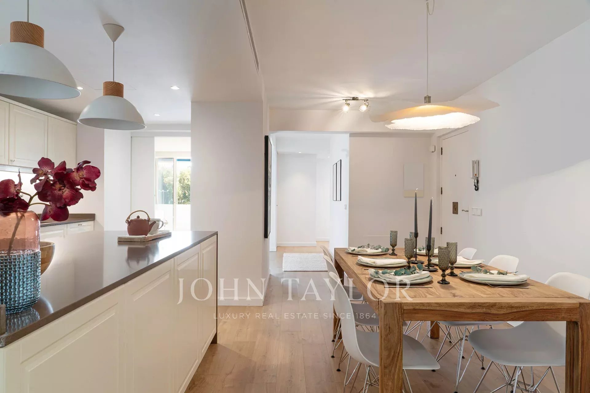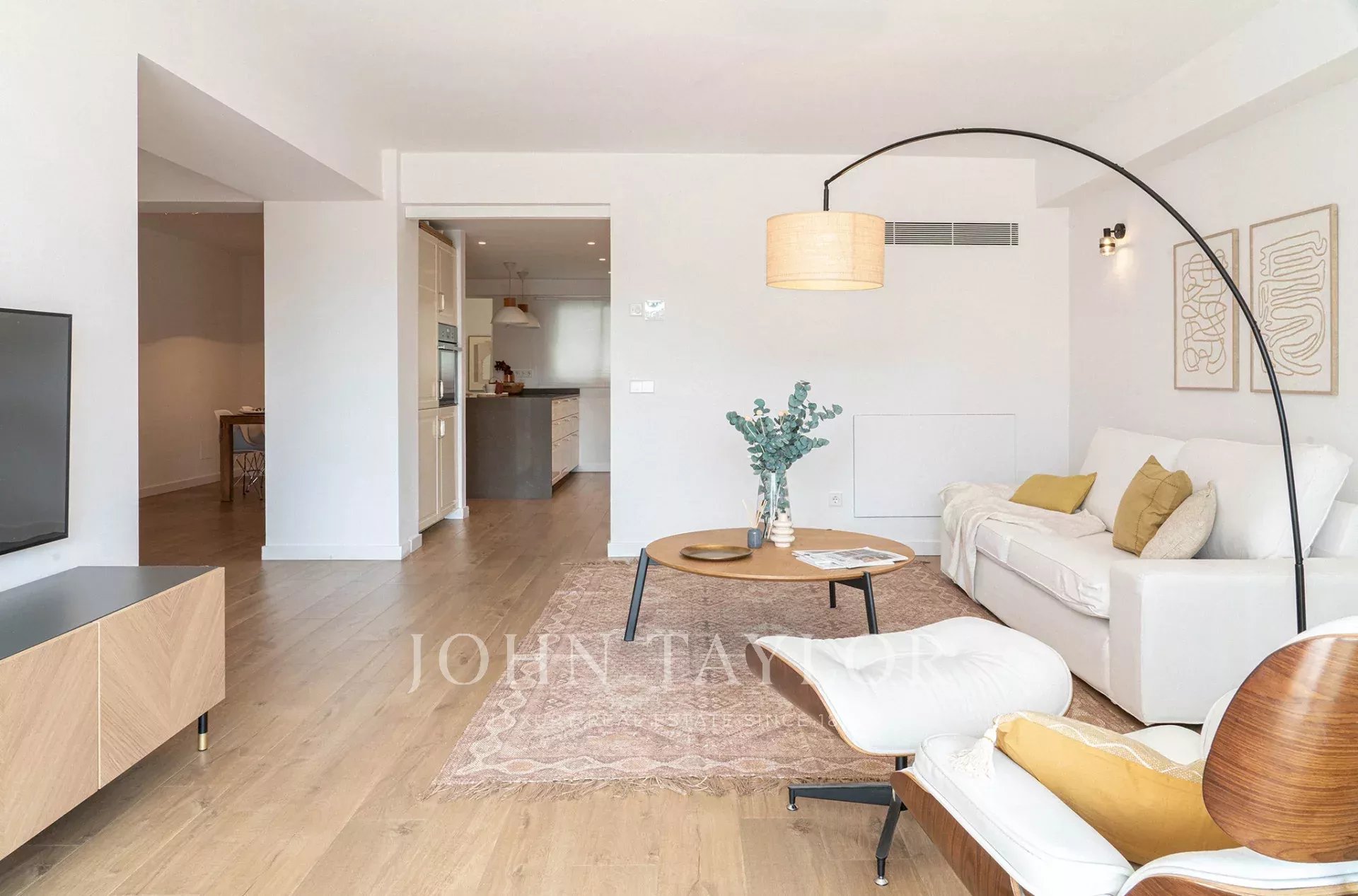 La proprietà offre 150 m² di spazio abitativo, tra cui una terrazza di 6 m², un luminoso soggiorno-sala da pranzo, una cucina completamente attrezzata con zona ufficio e lavanderia, due camere matrimoniali, una camera singola e tre bagni. La suite padronale è caratterizzata da ampie finestre, vista aperta ed elegante bagno in camera.