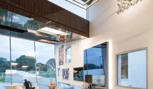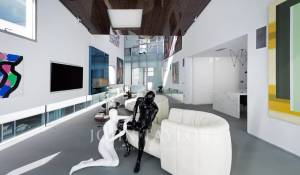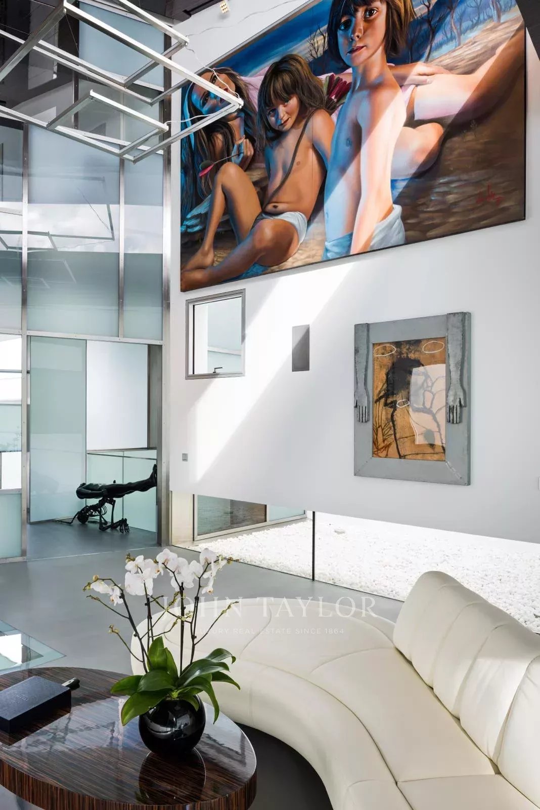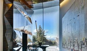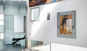tra il mondo impersonale e dinamico dell'esterno e l'universo confortevole e piacevole dell'interno. Il gorgoglio dell'acqua ci indica la strada. All'ingresso si trova uno spazio espositivo. Una sala continua a doppia altezza in acciaio e vetro che nasconde l'accesso alle stanze.