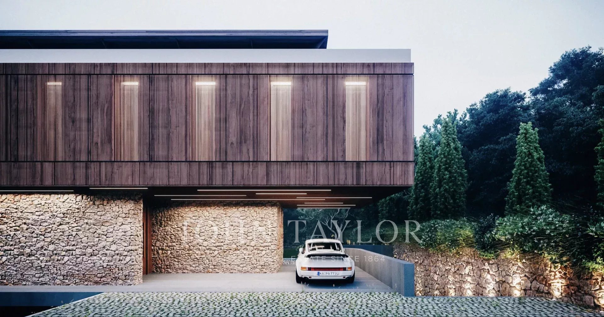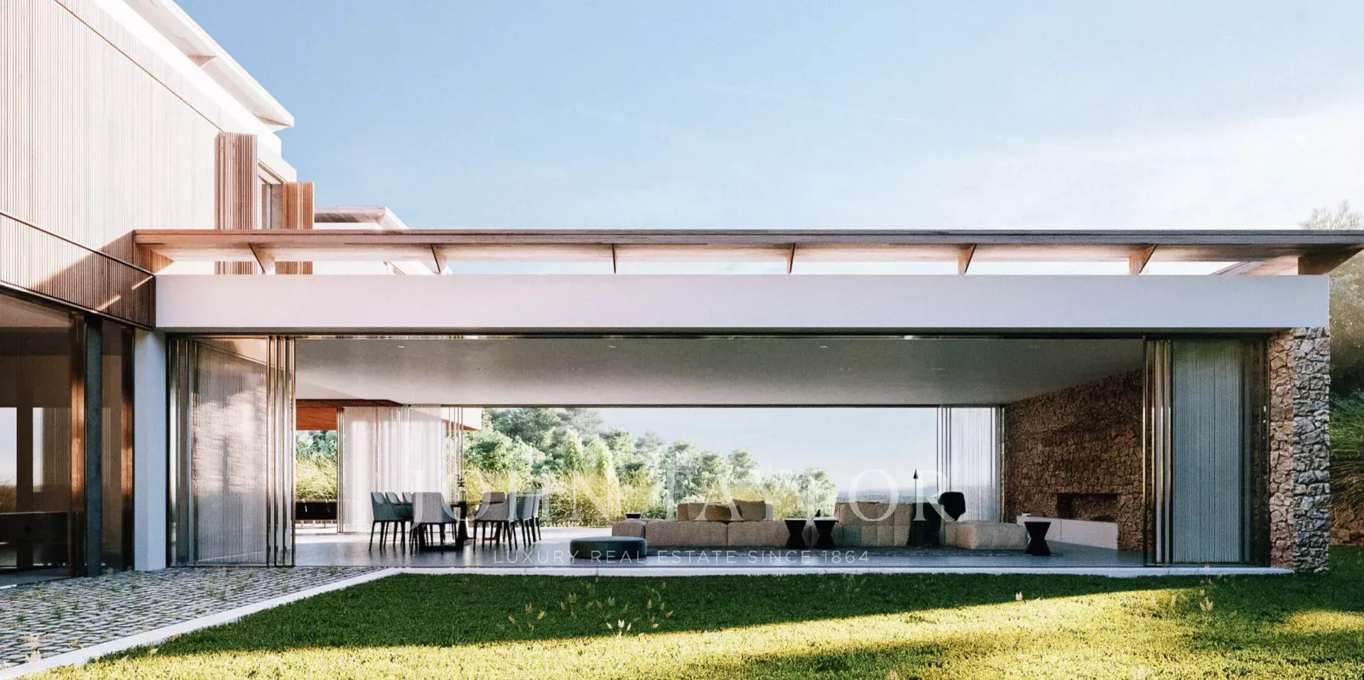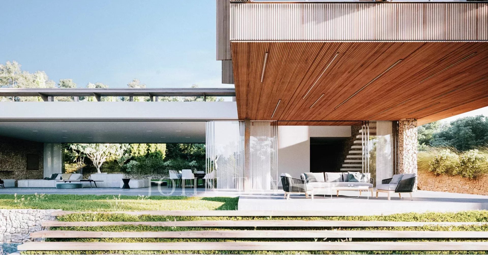 All’interno, le finiture combinano microcemento, legno e bambù, con pavimenti dai toni neutri che valorizzano l’architettura e ampie superfici vetrate che collegano gli interni al paesaggio circostante. La carpenteria esterna in alluminio con effetto corten integra sistemi scorrevoli in vetro, mentre gli interni includono porte a tutta altezza, armadi a muro e dettagli eleganti.