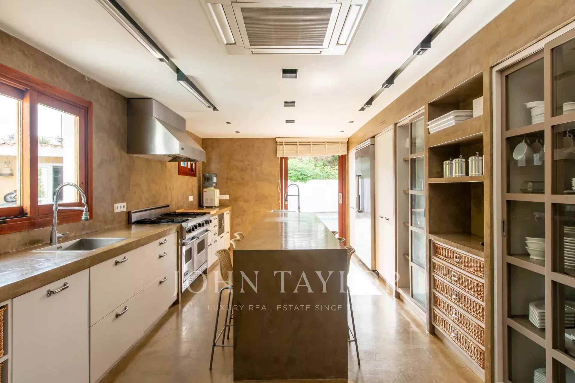 Cucina moderna con isola centrale, aperta sul soggiorno da un lato e collegata direttamente con la piscina e il portico dall’altro.