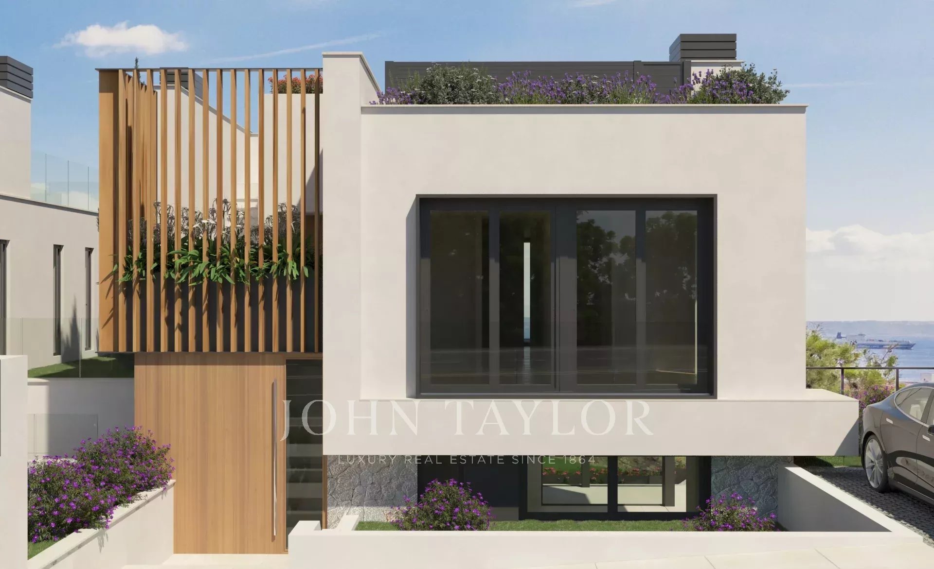 Vivete il meglio dello stile di vita mediterraneo in questa spaziosa villa con giardino e piscina privati, ampie terrazze e vista sul mare dal piano terra, dal piano superiore e dalla soleggiata terrazza sul tetto. Il garage sotterraneo comune offre due posti auto e un ampio ripostiglio per ogni villa. Per un uso più frequente c'è anche un parcheggio esterno a livello della strada accanto all'ingresso della casa.