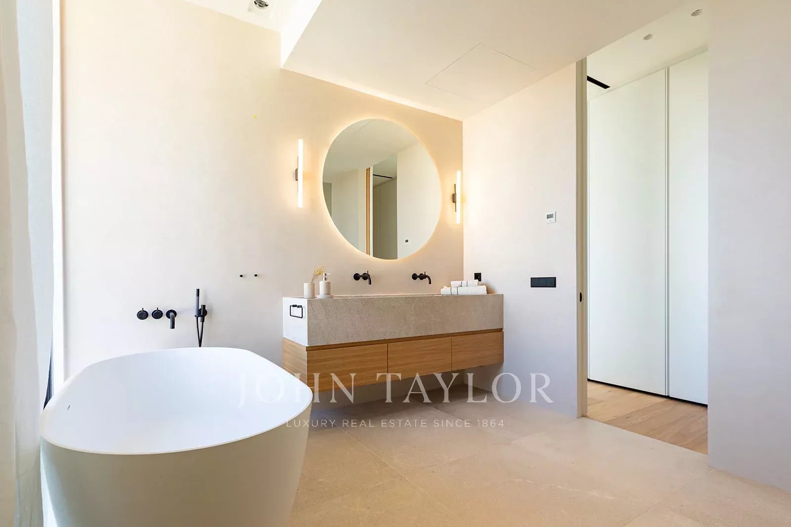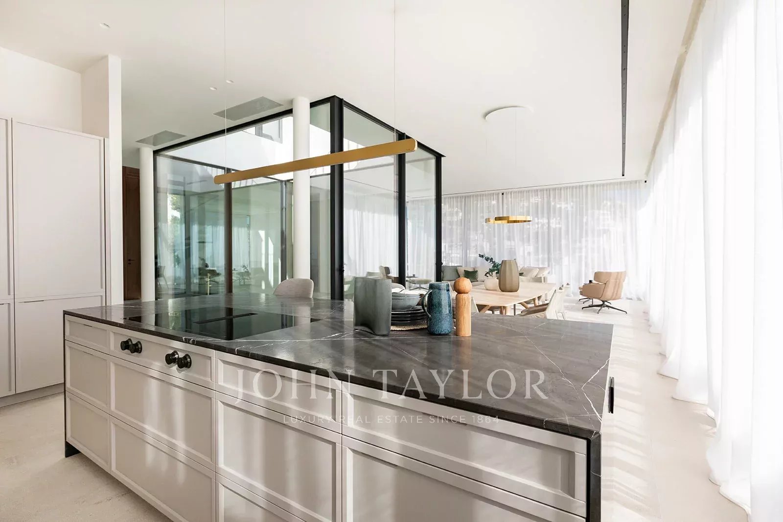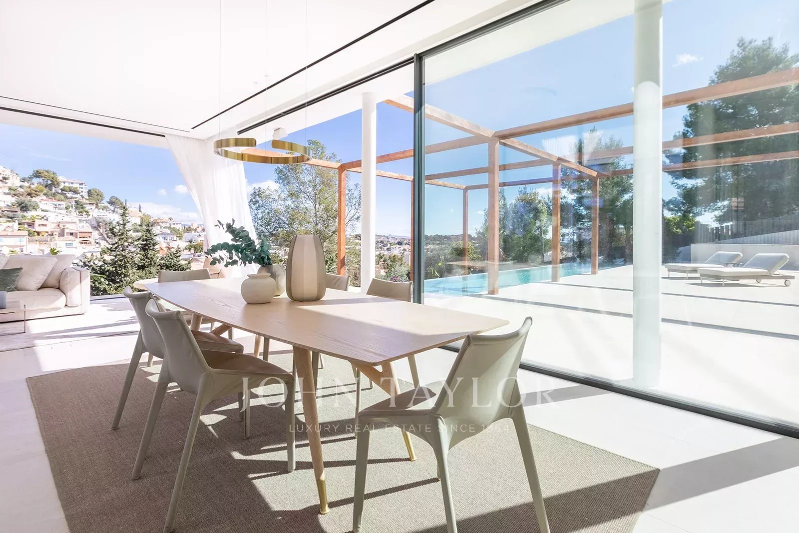Questa villa contemporanea vanta oltre 400 metri quadrati di spazi abitativi sofisticati che sfumano i confini tra interno ed esterno. I punti salienti di questa eccezionale proprietà includono una piscina privata, ampie terrazze, un atrio centrale che porta la luce naturale all'interno e un parcheggio sotterraneo per tre auto. Costruita su un terreno in leggera pendenza, la proprietà è circondata da giardini paesaggistici con una piscina a sfioro nel punto più basso, terrazze e zone giorno orientate verso le montagne e un interno open concept. L'atrio pieno di piante è il cuore del piano terra e riempie lo spazio di luce naturale. Da esso si dipartono l'ingresso e la scala, una dispensa/ripostiglio, una camera da letto matrimoniale con bagno privato e un'ampia cucina, sala da pranzo e soggiorno open concept, disposti su livelli divisi che corrispondono alle terrazze esterne. I vetri a tutta altezza lungo un lato della zona giorno si affacciano sulla terrazza e sulle aree salotto, sfruttando al massimo il potenziale di vita all'aperto. Il primo piano, accessibile anche tramite una scala esterna, comprende altre tre camere da letto doppie e bagni. Due di queste si affacciano sull'atrio, assicurando molta luce, e hanno accesso a una terrazza condivisa con vista sulla campagna. La costruzione di prima qualità, i materiali più pregiati e gli elettrodomestici di alta qualità saranno utilizzati in questa moderna casa di Maiorca. L'uso continuo di legni chiari, rivestimenti in pietra naturale e un'abbondanza di vetro sia all'interno che all'esterno, lega questa proprietà dal punto di vista estetico, assicurando che sia calda, luminosa e contemporanea, pur godendo di una vicinanza alla natura e di un facile accesso a Palma e alla costa.
