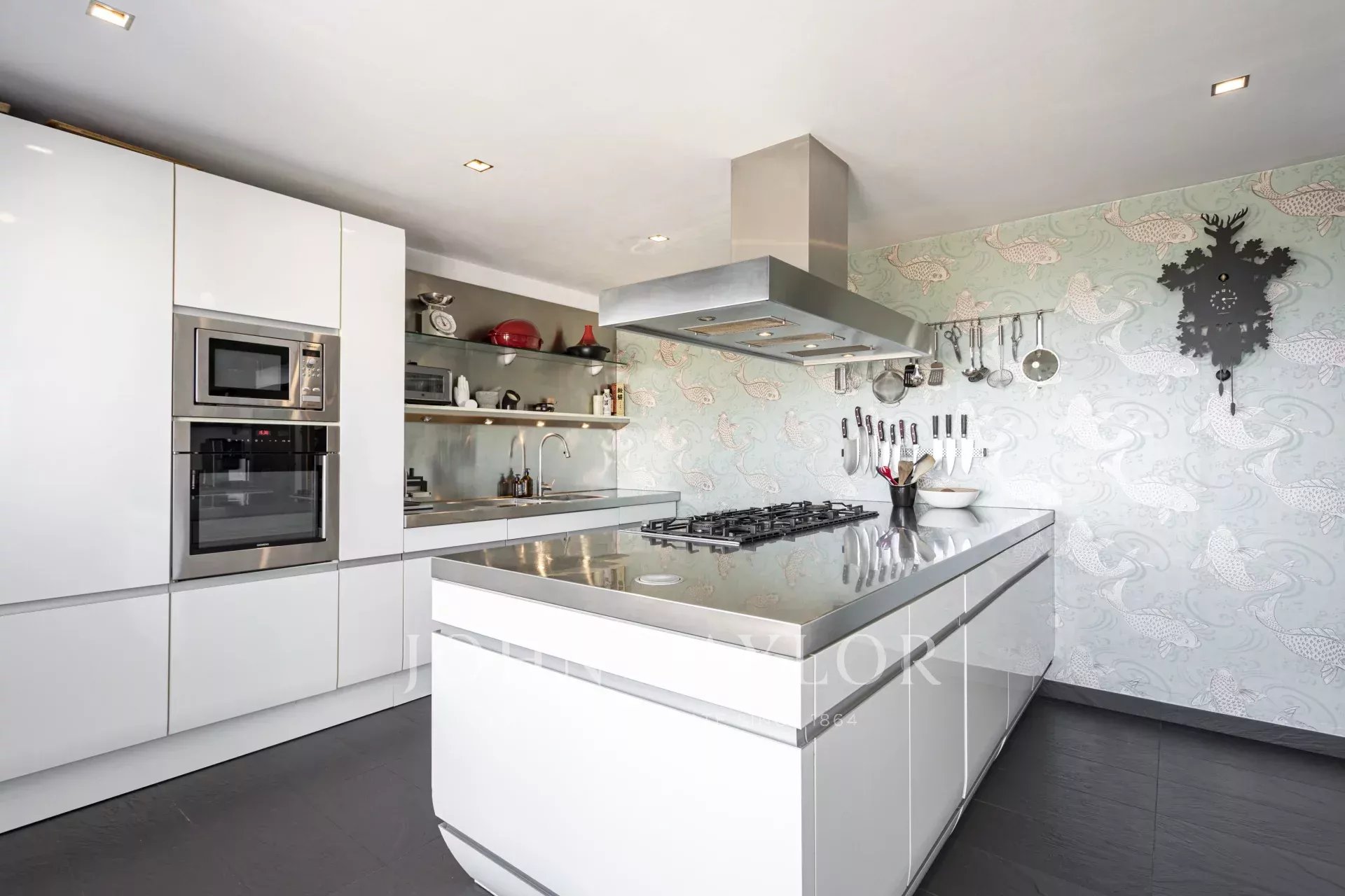 Dotata di aria condizionata canalizzata, riscaldamento centrale, riscaldamento a pavimento nei bagni e pannelli solari, questa è una casa perfetta per vivere tutto l’anno. Il giardino mediterraneo con alberi di agrumi aggiunge il tocco finale — un promemoria che, anche vicino alla città, la natura è sempre presente.