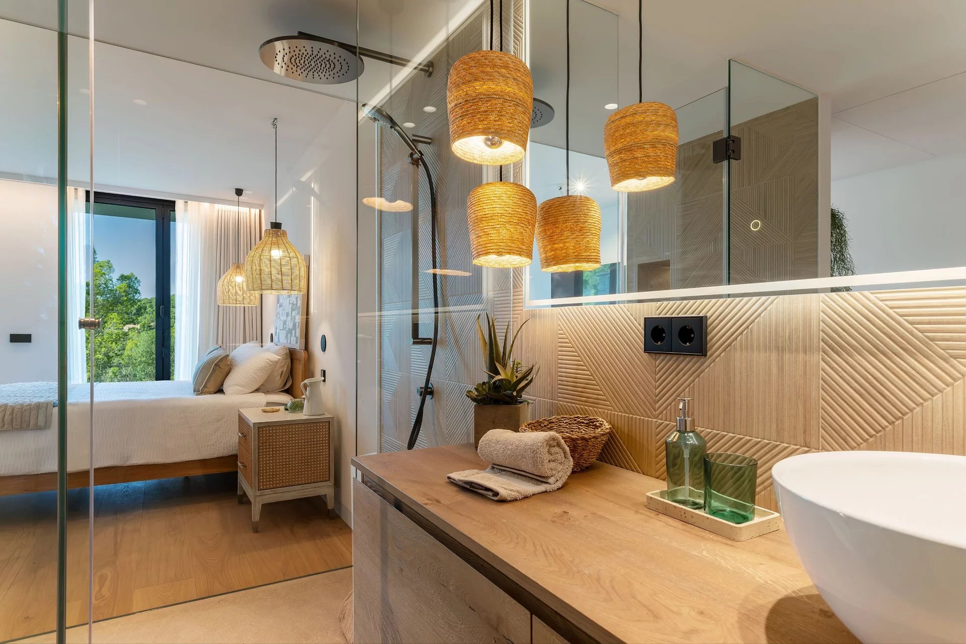 Il design si estende all'esterno con diverse terrazze che sfruttano al massimo il sole di Maiorca, creando spazi di vita all'aperto perfetti per serate stellate o riunioni all'aperto. La piscina a sfioro, come un'oasi di tranquillità, contrasta con il cielo vibrante e fornisce l'ambiente perfetto per rilassarsi, mentre un ufficio privato o una biblioteca con una vista impareggiabile aggiungono un tocco di raffinatezza all'ambiente circostante.