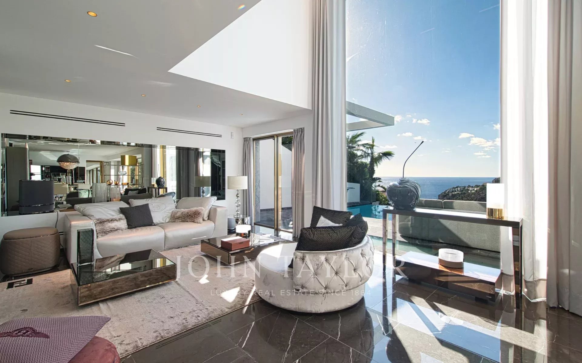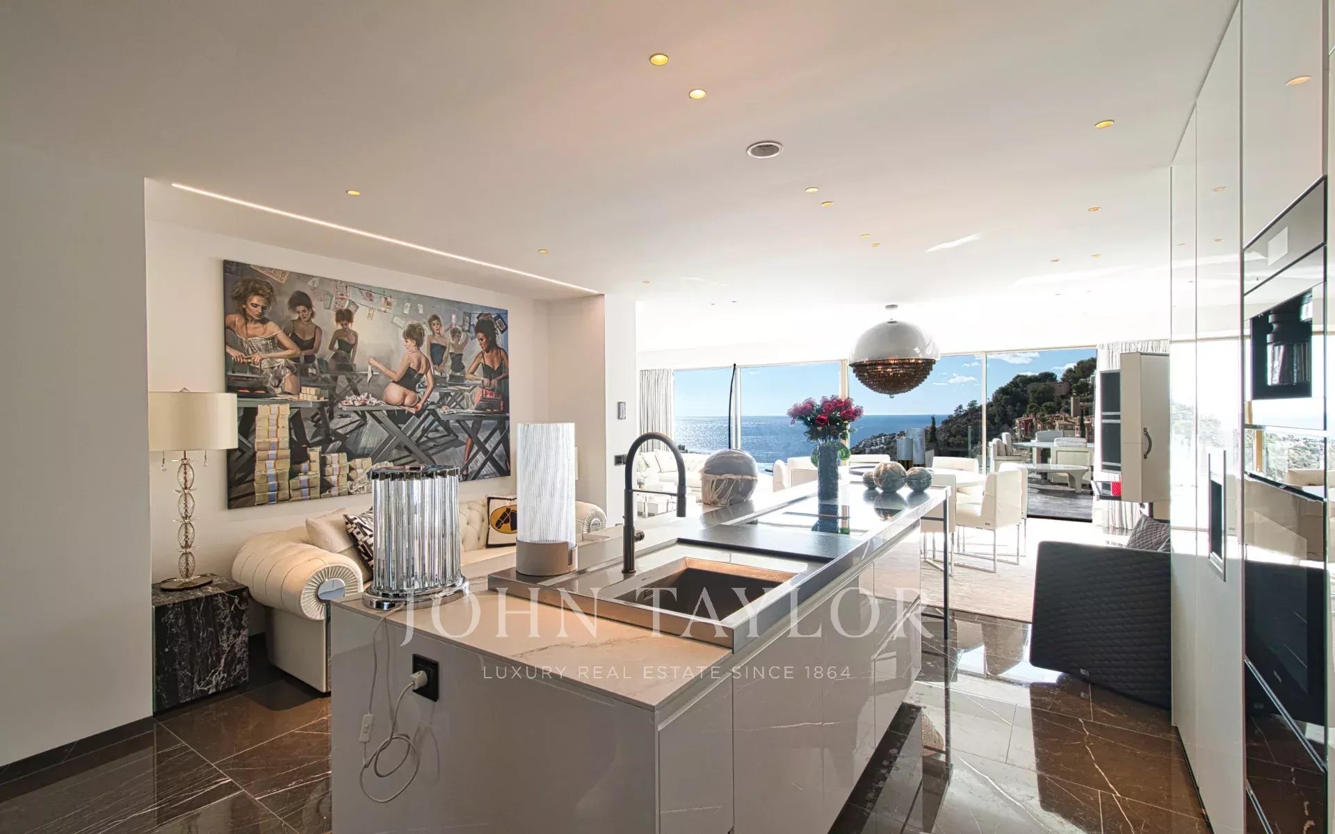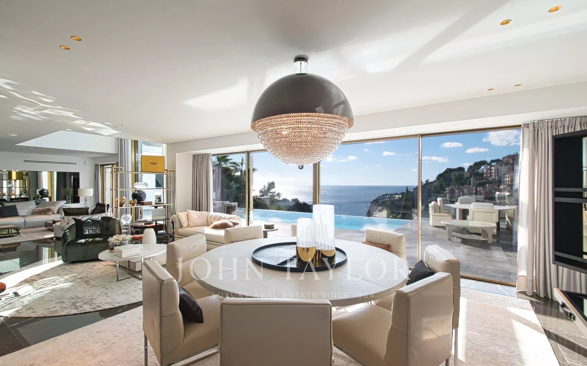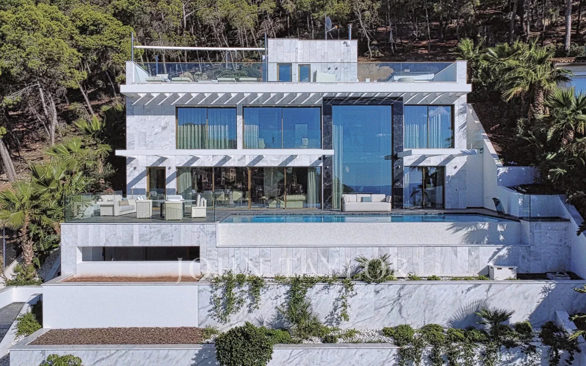 All'interno, 532 m² di ambienti raffinati si sviluppano su tre livelli: un mondo di serena raffinatezza e viste mozzafiato sul mare. Il piano principale si apre su un ampio e luminoso soggiorno con grandi finestre che incorniciano l'orizzonte mediterraneo. Una cucina di design firmata Poliform combina forma e funzionalità con elettrodomestici Miele, Gaggenau e Bora, mentre l'accesso diretto alla terrazza invita a sperimentare la massima fusione tra vita interna ed esterna. La piscina a sfioro sembra fondersi con il mare, creando un'atmosfera di infinita serenità.