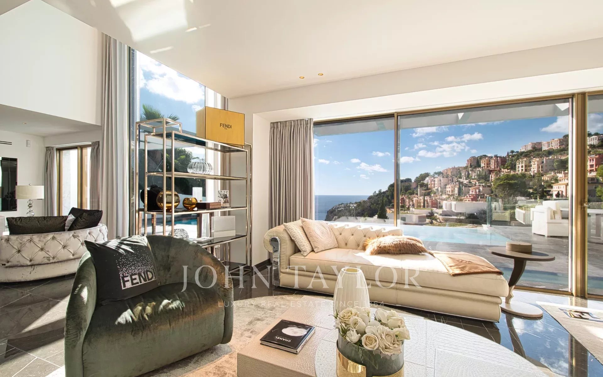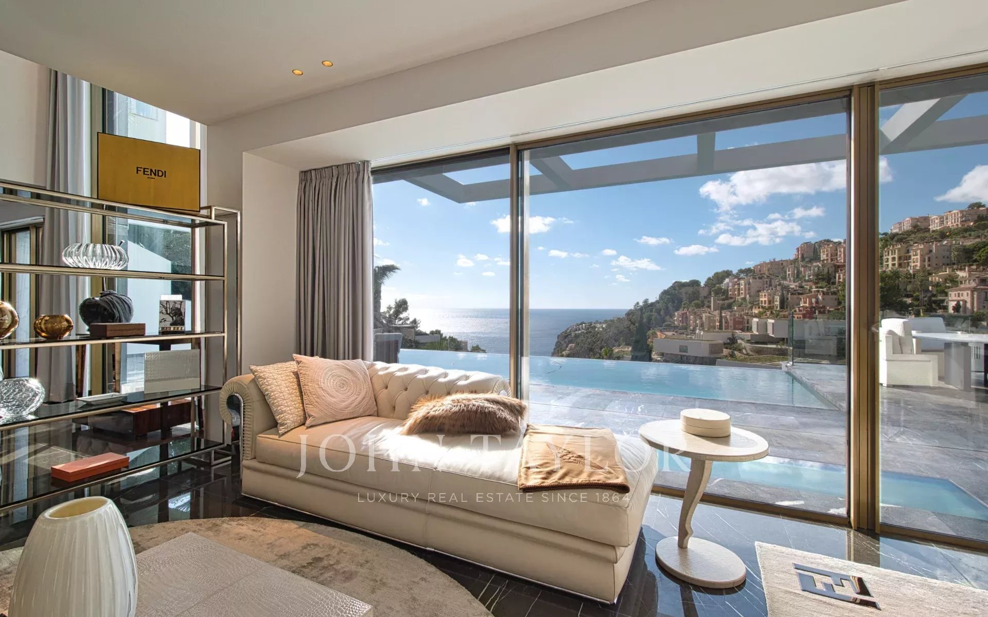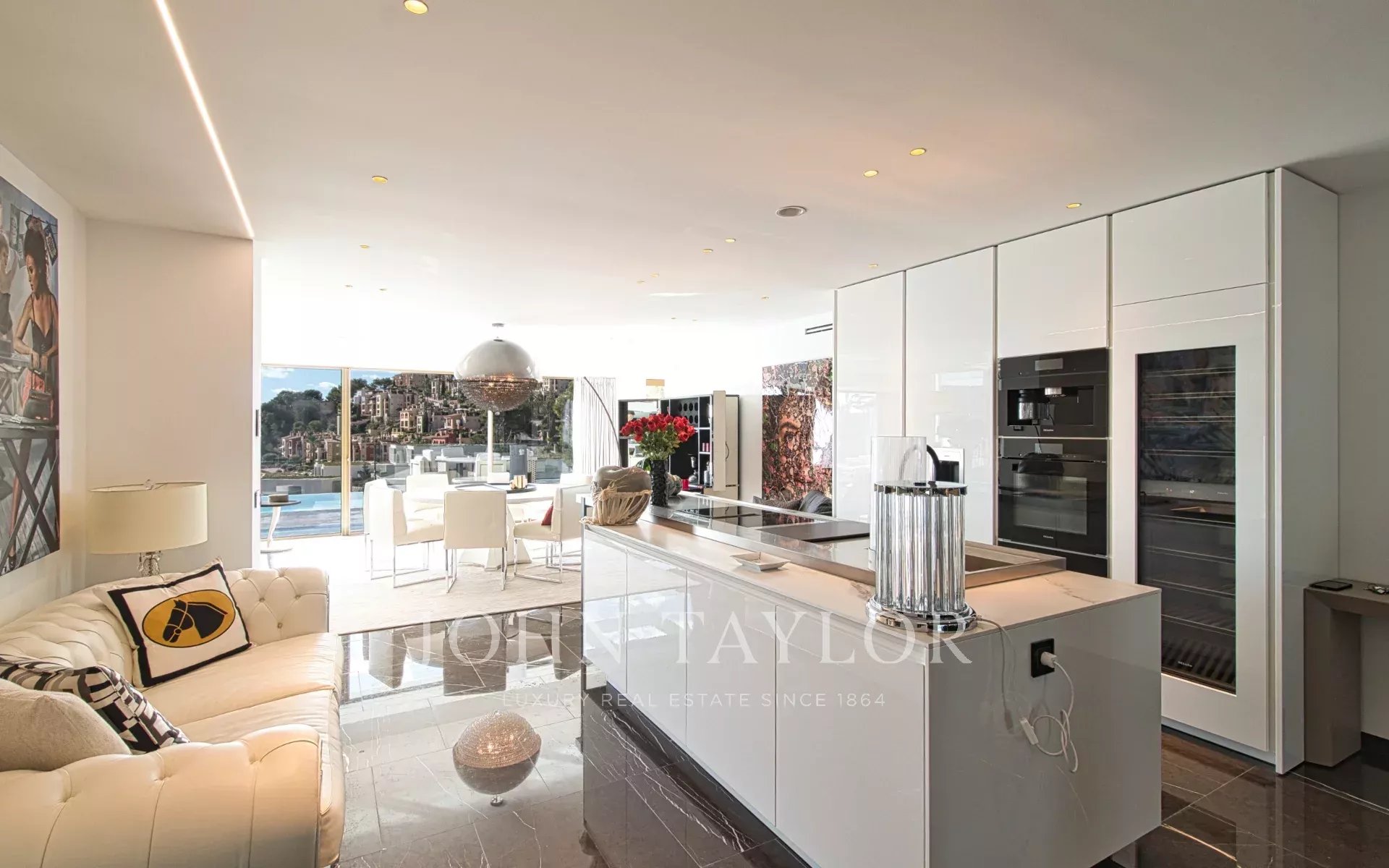 All'interno, 532 m² di ambienti raffinati si sviluppano su tre livelli: un mondo di serena raffinatezza e viste mozzafiato sul mare. Il piano principale si apre su un ampio e luminoso soggiorno con grandi finestre che incorniciano l'orizzonte mediterraneo. Una cucina di design firmata Poliform combina forma e funzionalità con elettrodomestici Miele, Gaggenau e Bora, mentre l'accesso diretto alla terrazza invita a sperimentare la massima fusione tra vita interna ed esterna. La piscina a sfioro sembra fondersi con il mare, creando un'atmosfera di infinita serenità.