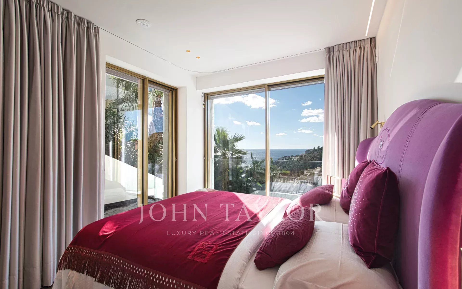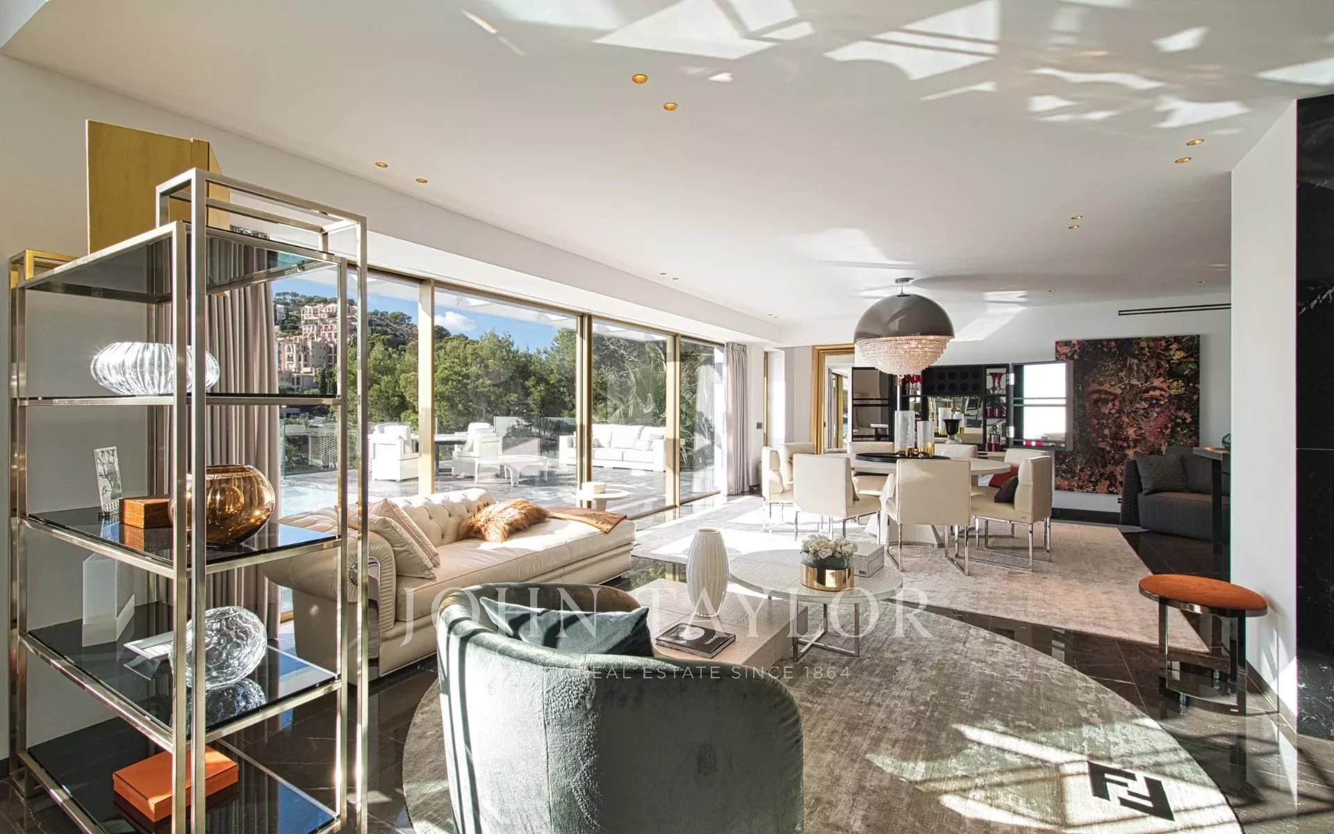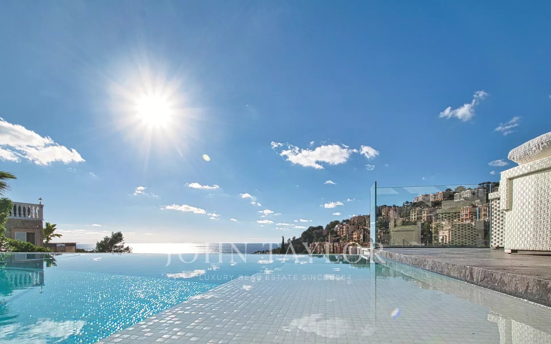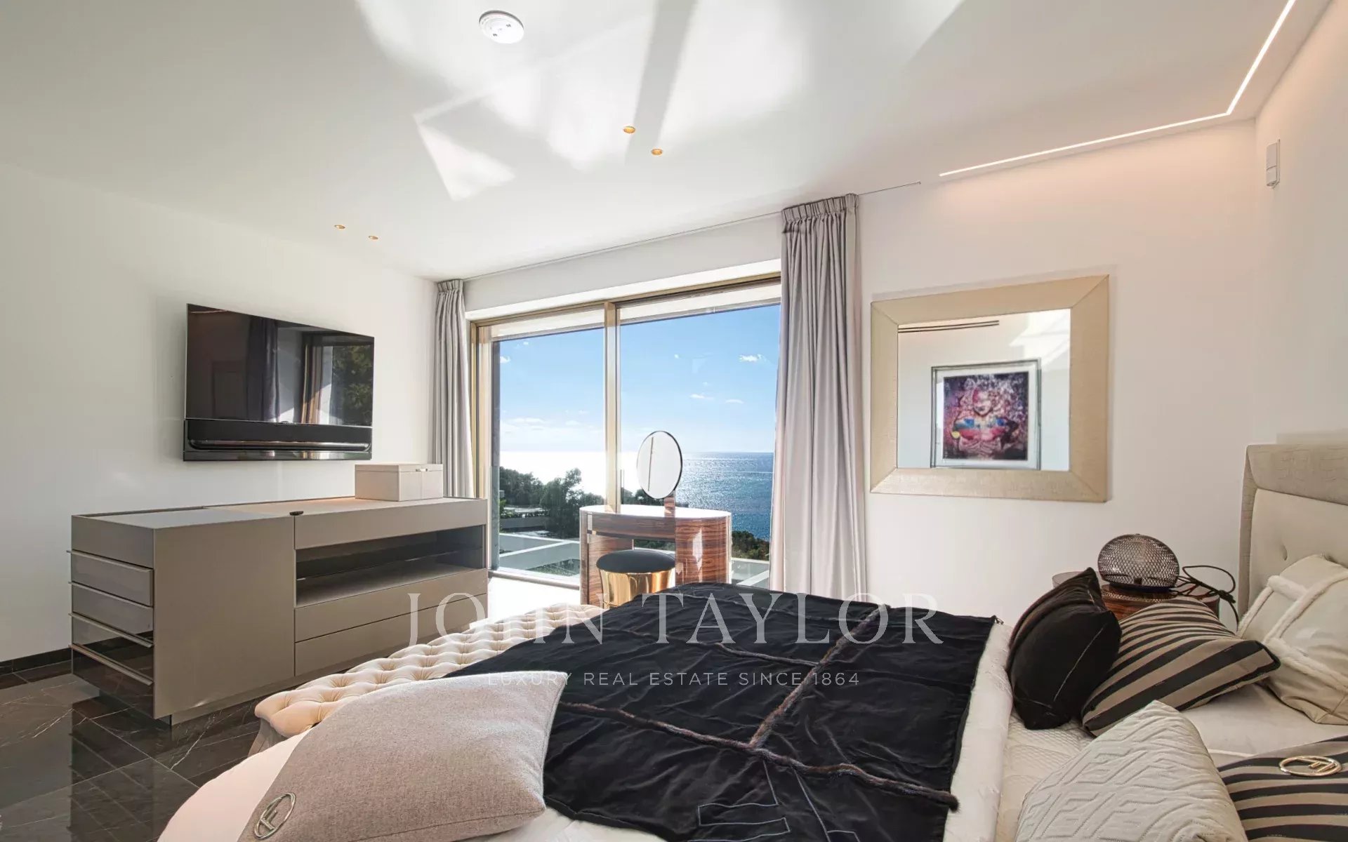 All'interno, 532 m² di ambienti raffinati si sviluppano su tre livelli: un mondo di serena raffinatezza e viste mozzafiato sul mare. Il piano principale si apre su un ampio e luminoso soggiorno con grandi finestre che incorniciano l'orizzonte mediterraneo. Una cucina di design firmata Poliform combina forma e funzionalità con elettrodomestici Miele, Gaggenau e Bora, mentre l'accesso diretto alla terrazza invita a sperimentare la massima fusione tra vita interna ed esterna. La piscina a sfioro sembra fondersi con il mare, creando un'atmosfera di infinita serenità.