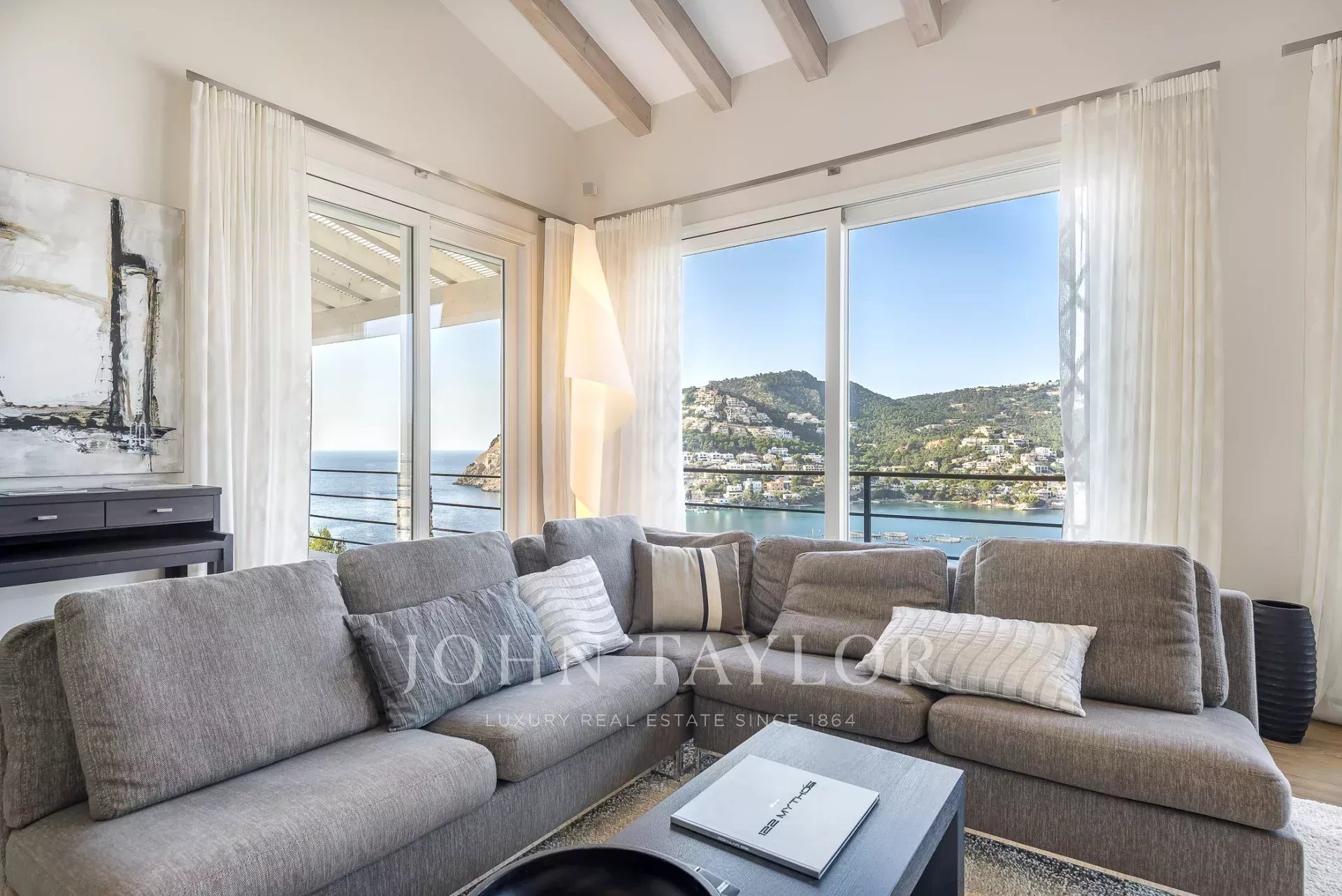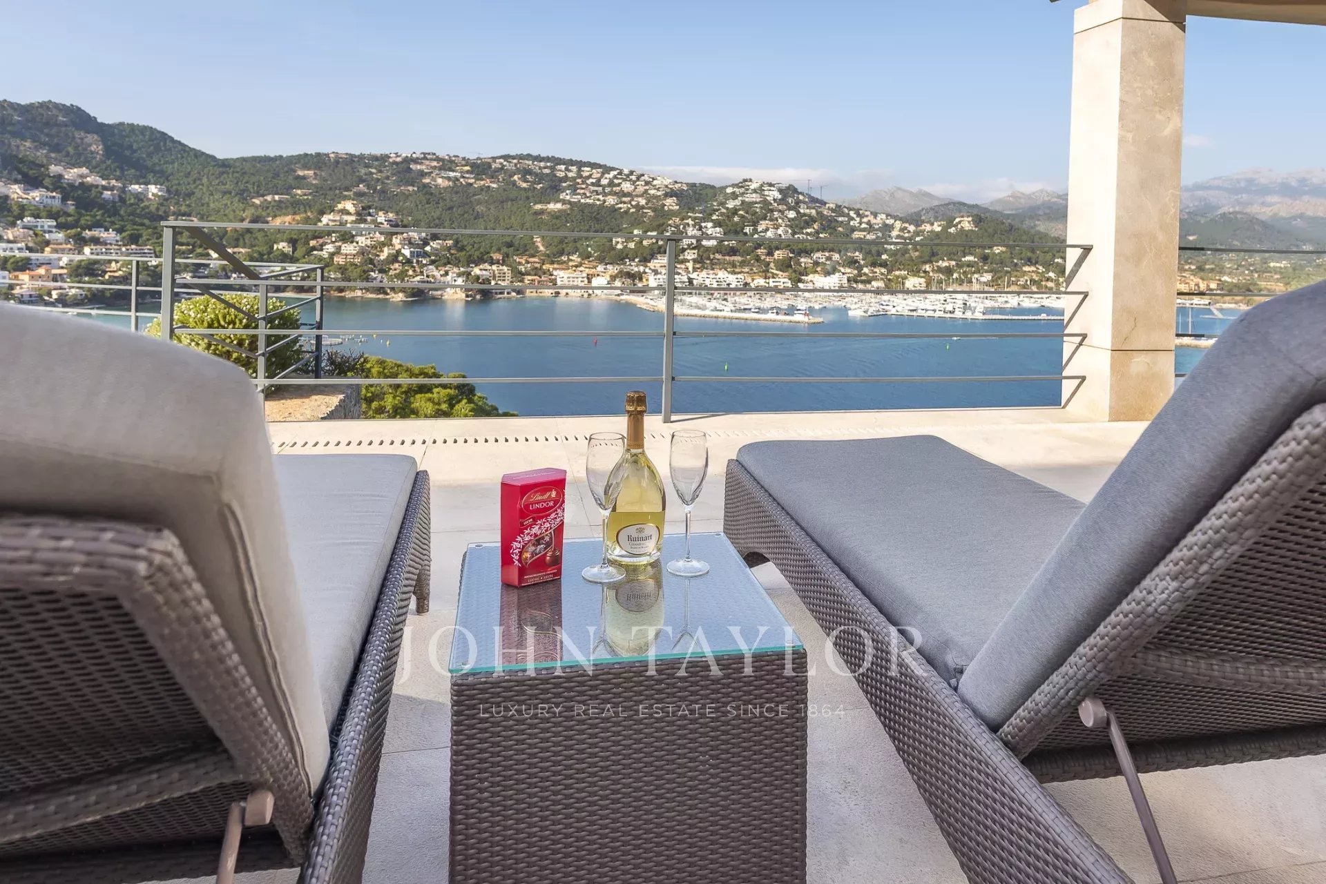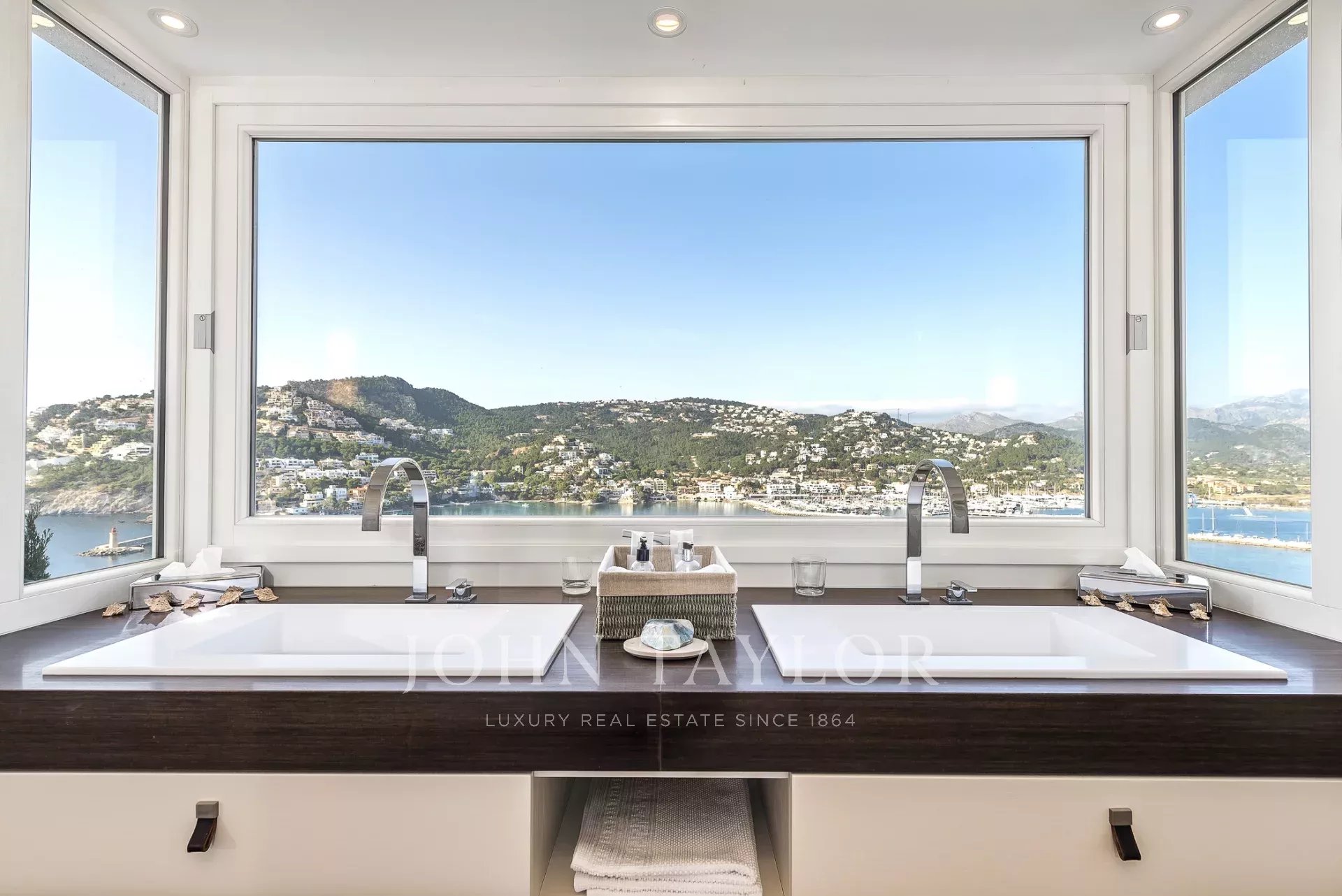 Villa di lusso in posizione privilegiata. In questa villa di recente costruzione, 5 camere da letto con bagno privato sono distribuite su 600 m2 di spazio abitativo. La costruzione e il design moderno attraversano l'intera casa. La cucina a pianta aperta completamente attrezzata non lascia nulla a desiderare. Dalla camera da letto, dall'accogliente zona giorno con camino o dalla cucina, ogni stanza offre una vista mozzafiato sulla baia di Puerto de Andratx e sul porto. All'esterno si trova la piscina a sfioro riscaldata con zona relax e un grande tavolo da pranzo con barbecue. Un'attrazione speciale è la sauna interna, da cui si gode di una magnifica vista sul mare grazie all'ampia vetrata. I tramonti mozzafiato sono garantiti.
