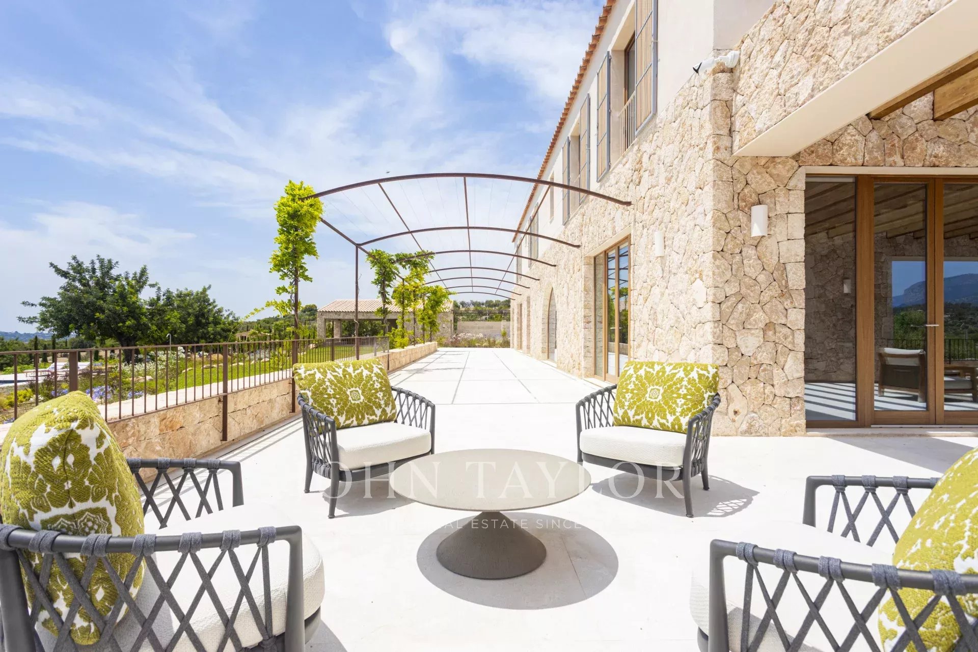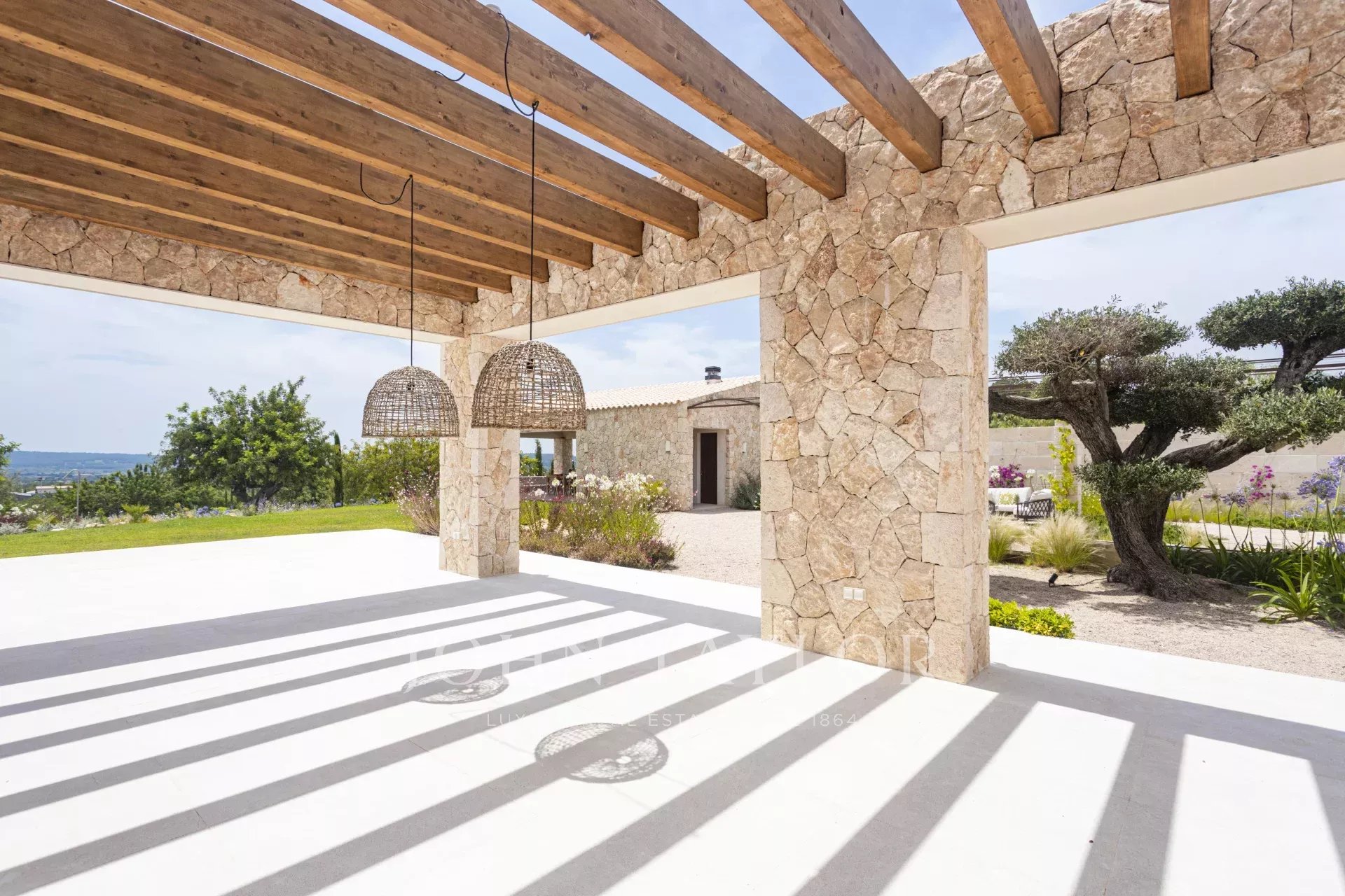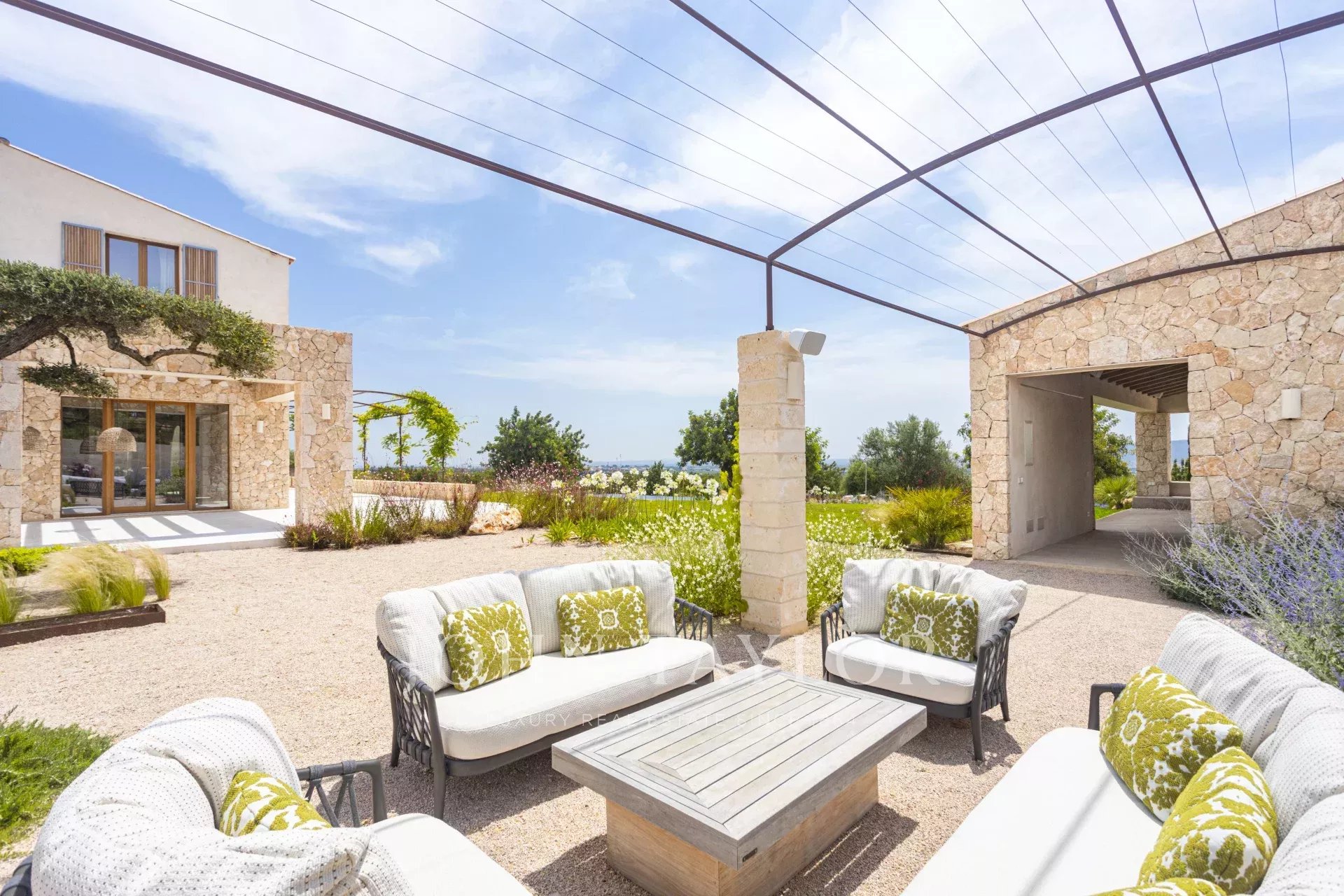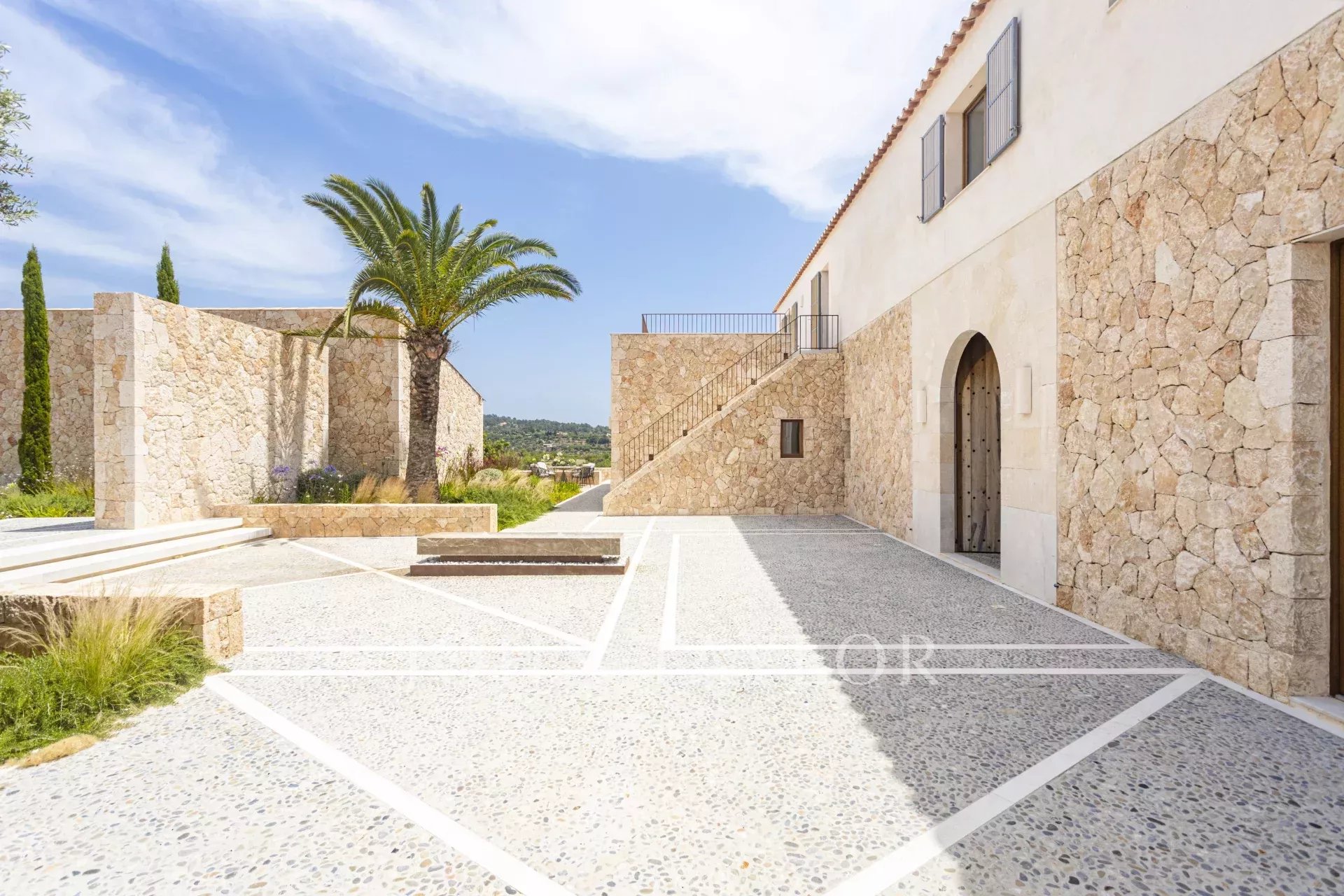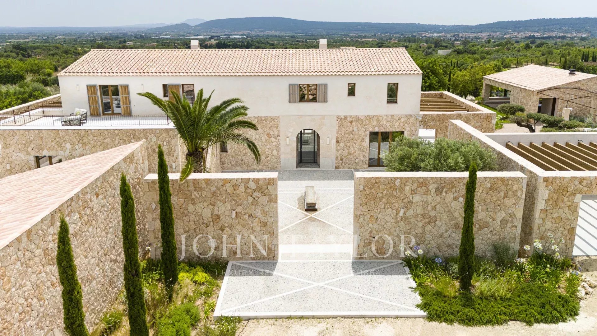Le caratteristiche e le finiture esclusive di questa proprietà includono piastrelle in pietra naturale marfil in tutto il piano terra e il primo piano, riscaldamento a pavimento in tutte le stanze, boiserie in legno di quercia su misura e lavandini artigianali in pietra naturale in tutti i bagni, rubinetti e docce di design di VOLA, sistema di pannelli solari (circa 30 KW) per l'energia sostenibile, ampio spazio per la piscina e il bagno. 30 KW) per l'energia sostenibile, grande piscina con locale tecnico e deposito dedicato, impianto audio SONOS in diversi punti esterni, barbecue con doppia griglia (gas e carbone), due fontane esterne con sistemi di pulizia e pompa indipendenti, circa 3.750 m² di vigneto piantato con varietà di uva prensal, affidato a un'azienda vinicola locale - con una produzione di circa 40 bottiglie all'anno, facciate in pietra naturale intagliata a mano per un'architettura senza tempo e architettura del paesaggio di NONAM