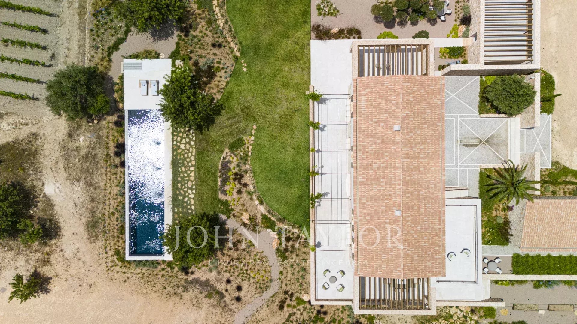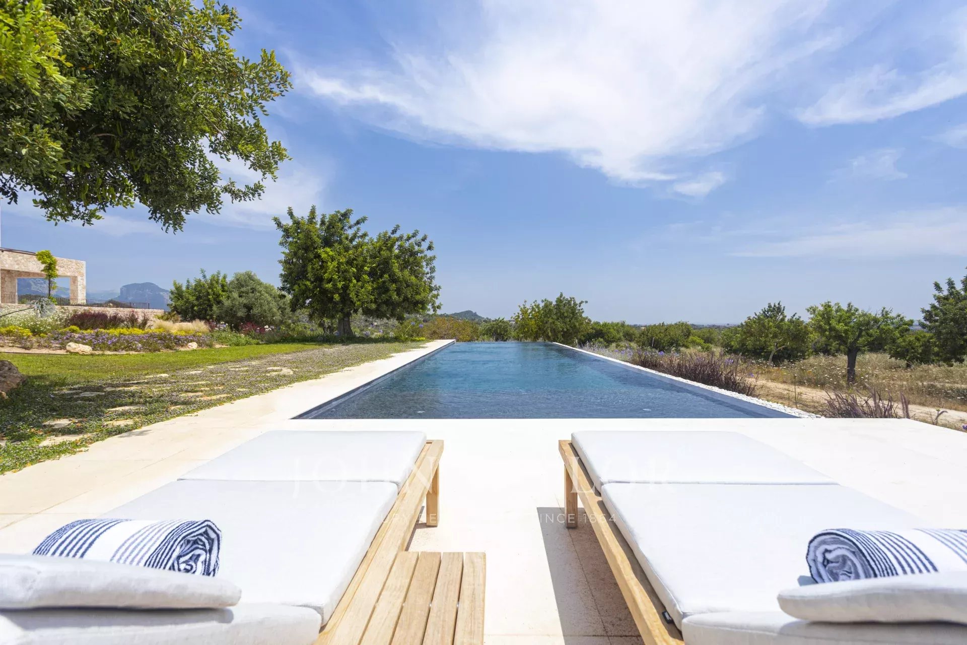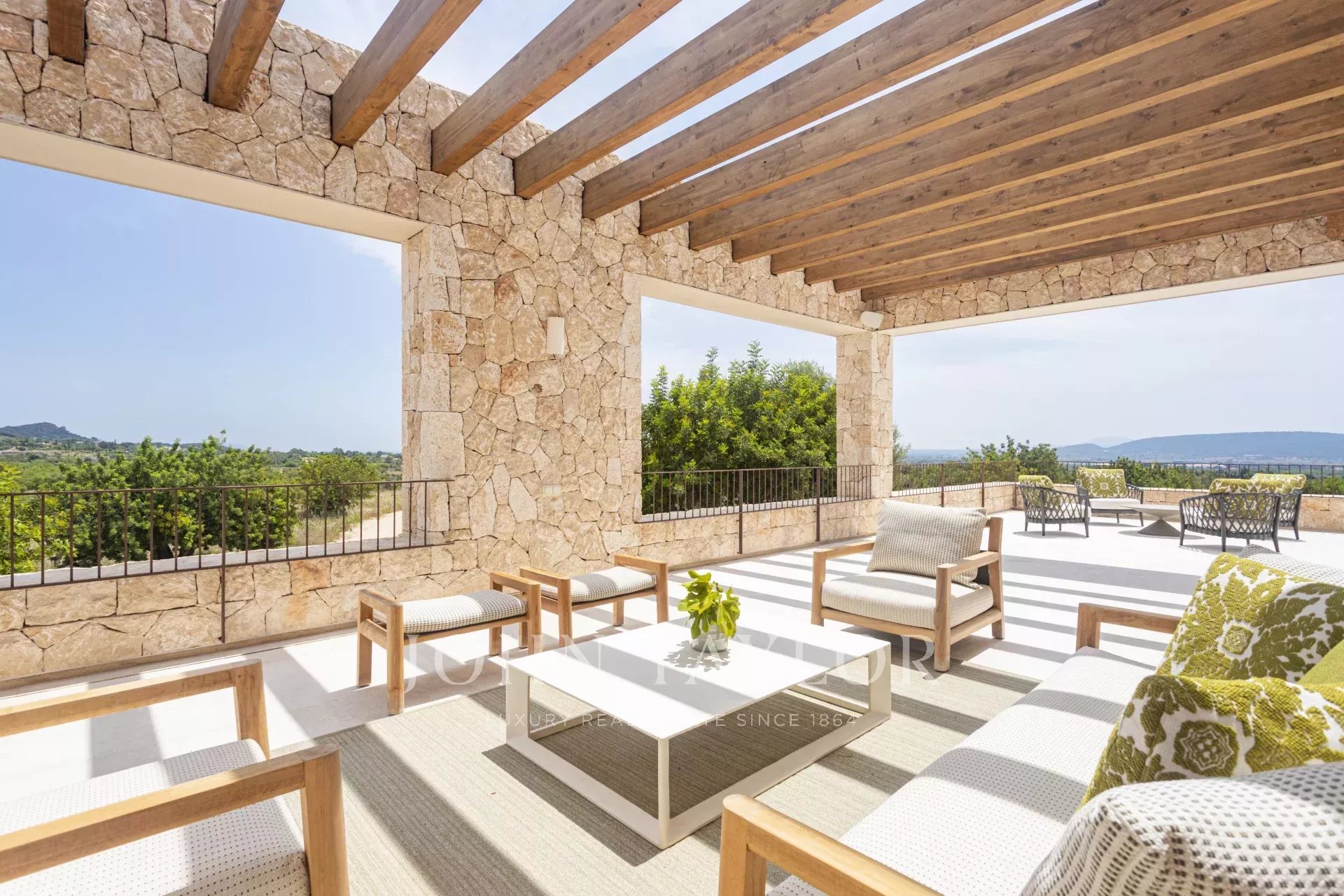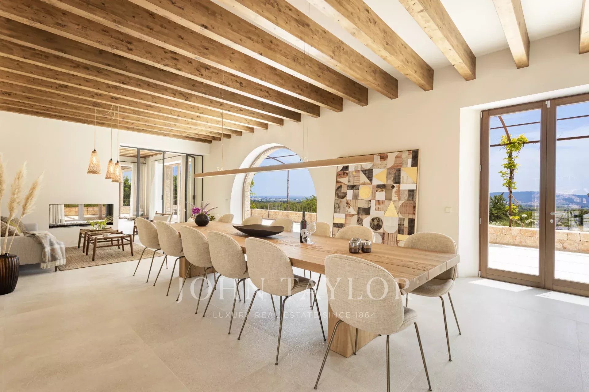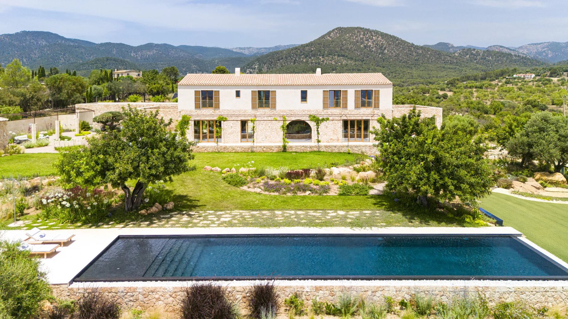 Le caratteristiche e le finiture esclusive di questa proprietà includono piastrelle in pietra naturale marfil in tutto il piano terra e il primo piano, riscaldamento a pavimento in tutte le stanze, boiserie in legno di quercia su misura e lavandini artigianali in pietra naturale in tutti i bagni, rubinetti e docce di design di VOLA, sistema di pannelli solari (circa 30 KW) per l'energia sostenibile, ampio spazio per la piscina e il bagno. 30 KW) per l'energia sostenibile, grande piscina con locale tecnico e deposito dedicato, impianto audio SONOS in diversi punti esterni, barbecue con doppia griglia (gas e carbone), due fontane esterne con sistemi di pulizia e pompa indipendenti, circa 3.750 m² di vigneto piantato con varietà di uva prensal, affidato a un'azienda vinicola locale - con una produzione di circa 40 bottiglie all'anno, facciate in pietra naturale intagliata a mano per un'architettura senza tempo e architettura del paesaggio di NONAM