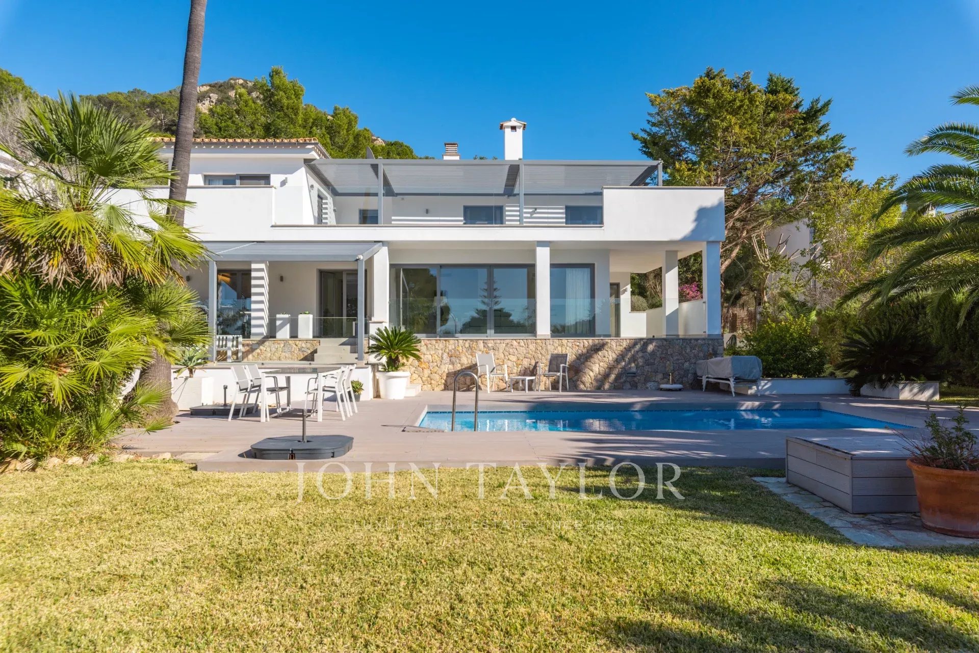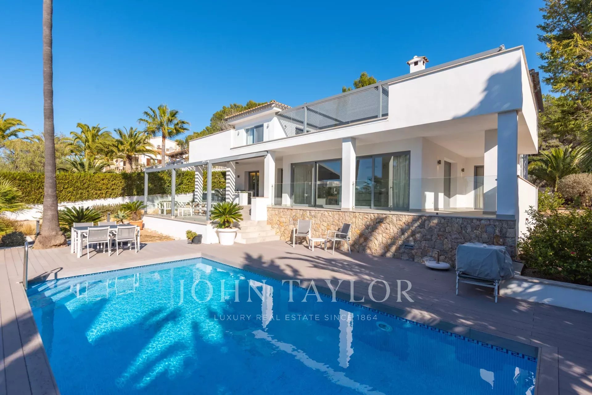 Villa in posizione tranquilla a Santa Ponsa. Questa casa è stata completamente ristrutturata nel 2018 e si distingue per la sua disposizione pratica, la buona qualità dei materiali e l'ambiente accogliente. È una casa ideale per la famiglia. L'ampio giardino e diverse grandi terrazze invitano a godersi la vita all'aperto. Al piano terra, l'ampio soggiorno con camino e la cucina aperta con isola si collegano al portico. Vi sono inoltre 2 camere da letto con bagno privato, una zona ufficio, un bagno per gli ospiti, una lavanderia e un garage. Il piano superiore offre un'ampia camera da letto principale con spogliatoio e bagno en suite, un'altra camera da letto e una sala fitness, che potrebbe essere la quinta camera da letto della casa. Il riscaldamento a pavimento e l'aria condizionata garantiscono la giusta temperatura in qualsiasi periodo dell'anno. La piscina e il giardino con molta privacy sono in perfette condizioni. Una grande proprietà molto vicina a tutto ciò che Santa Ponsa ha da offrire e a pochi passi da Port Adriano, Portals Nous e Palma.
