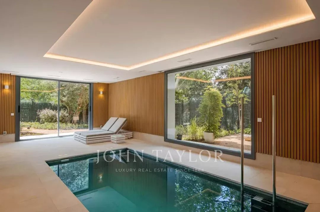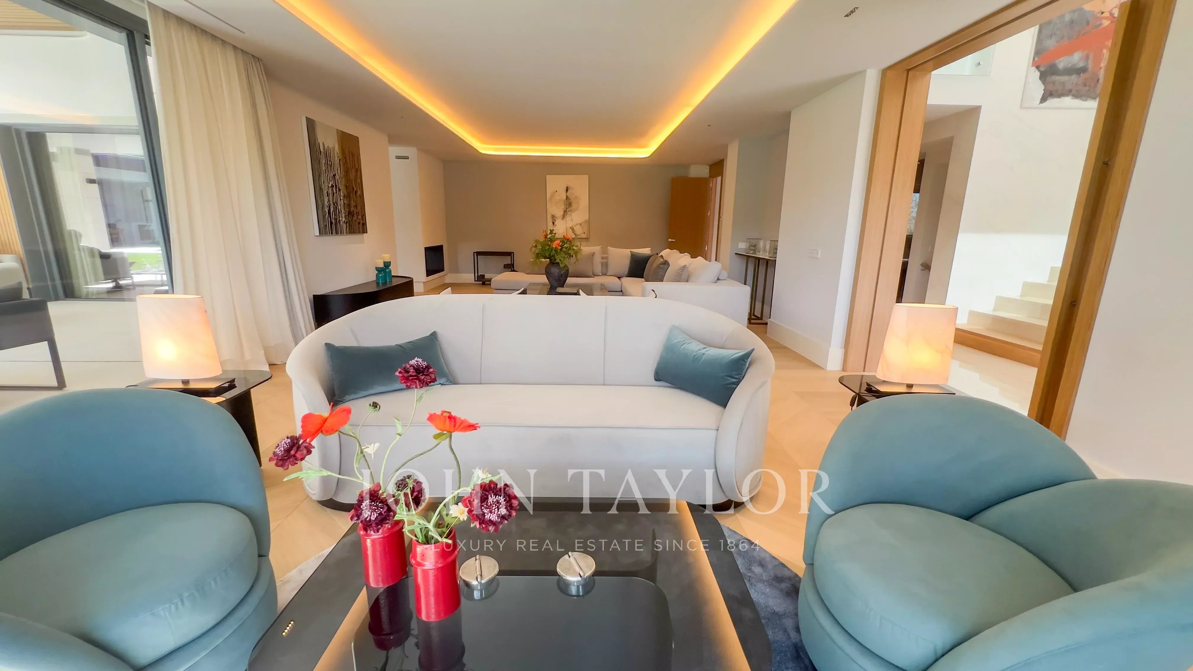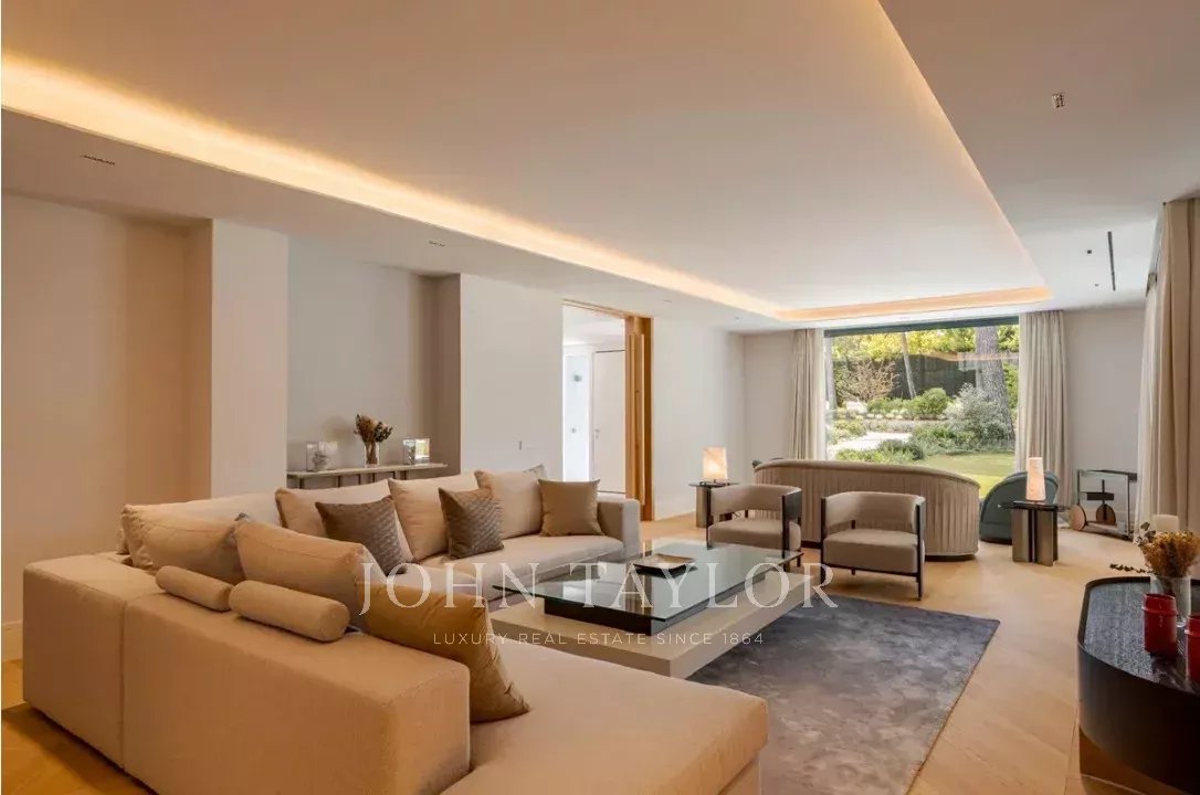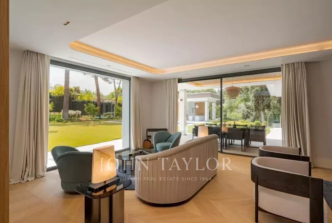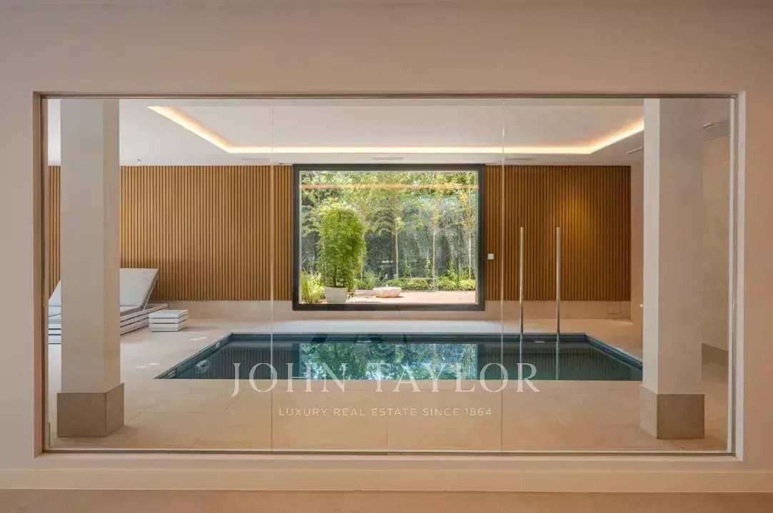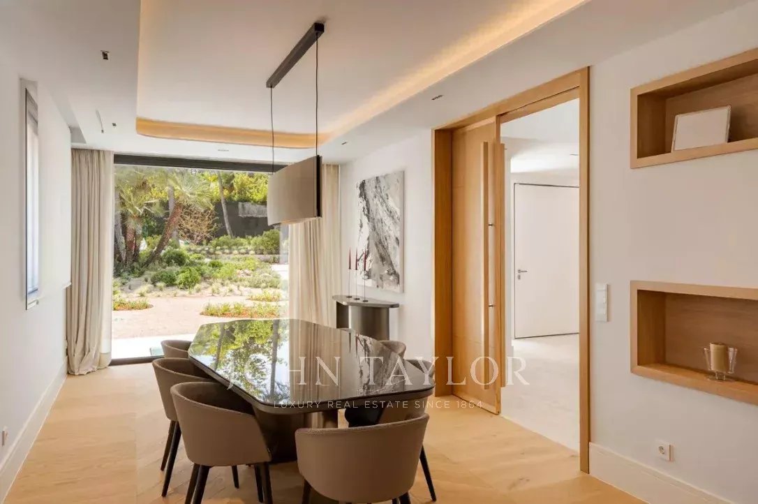 Il piano principale ospita un elegante ingresso a doppia altezza, un grande soggiorno con uscita al giardino e alla piscina, sala da pranzo con bar, cucina di design attrezzata con elettrodomestici Gaggenau e zona ufficio. In questo livello si trova anche la suite principale, con salotto privato, due guardaroba e bagno in suite, oltre a un bagno per gli ospiti.
