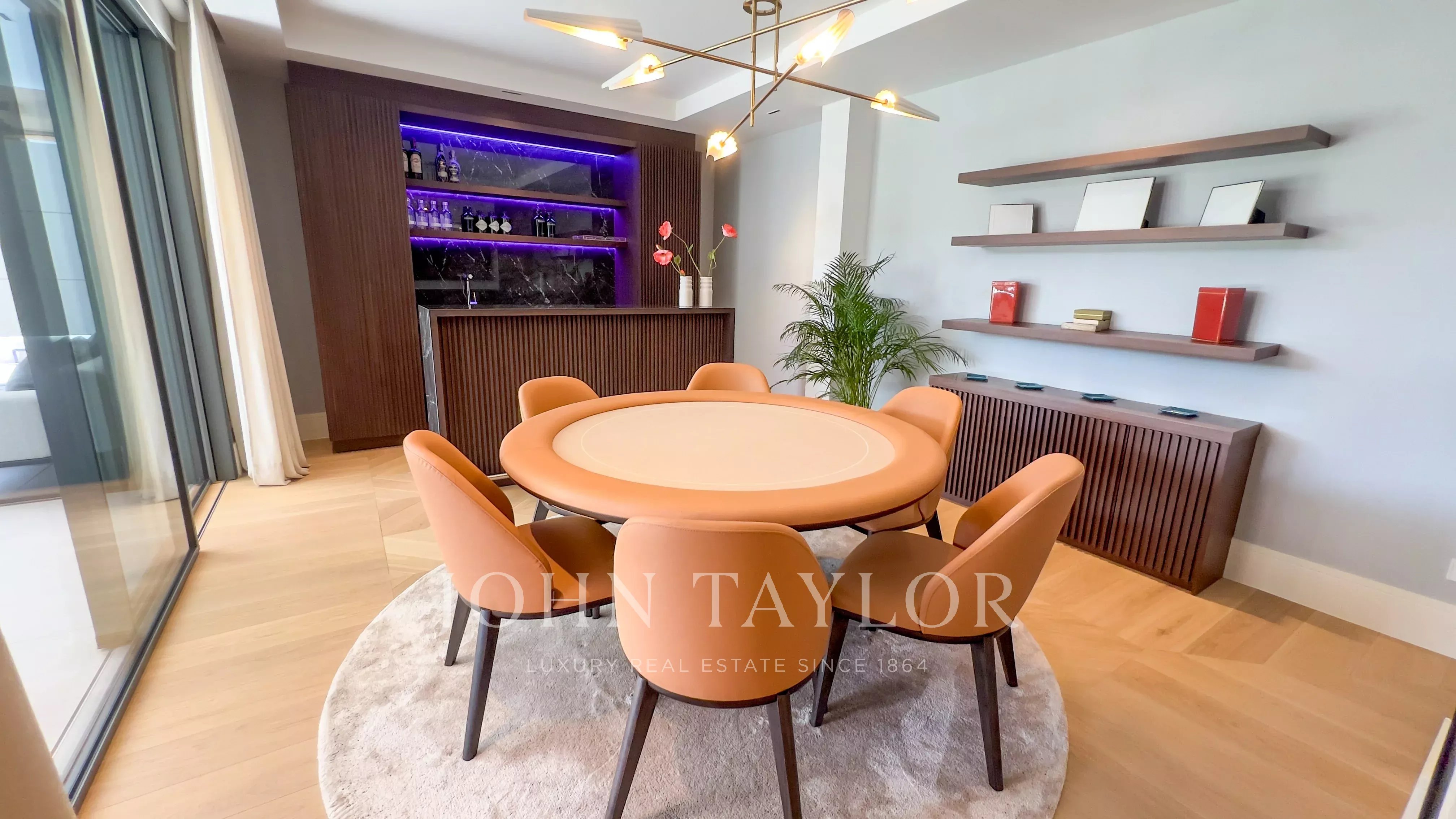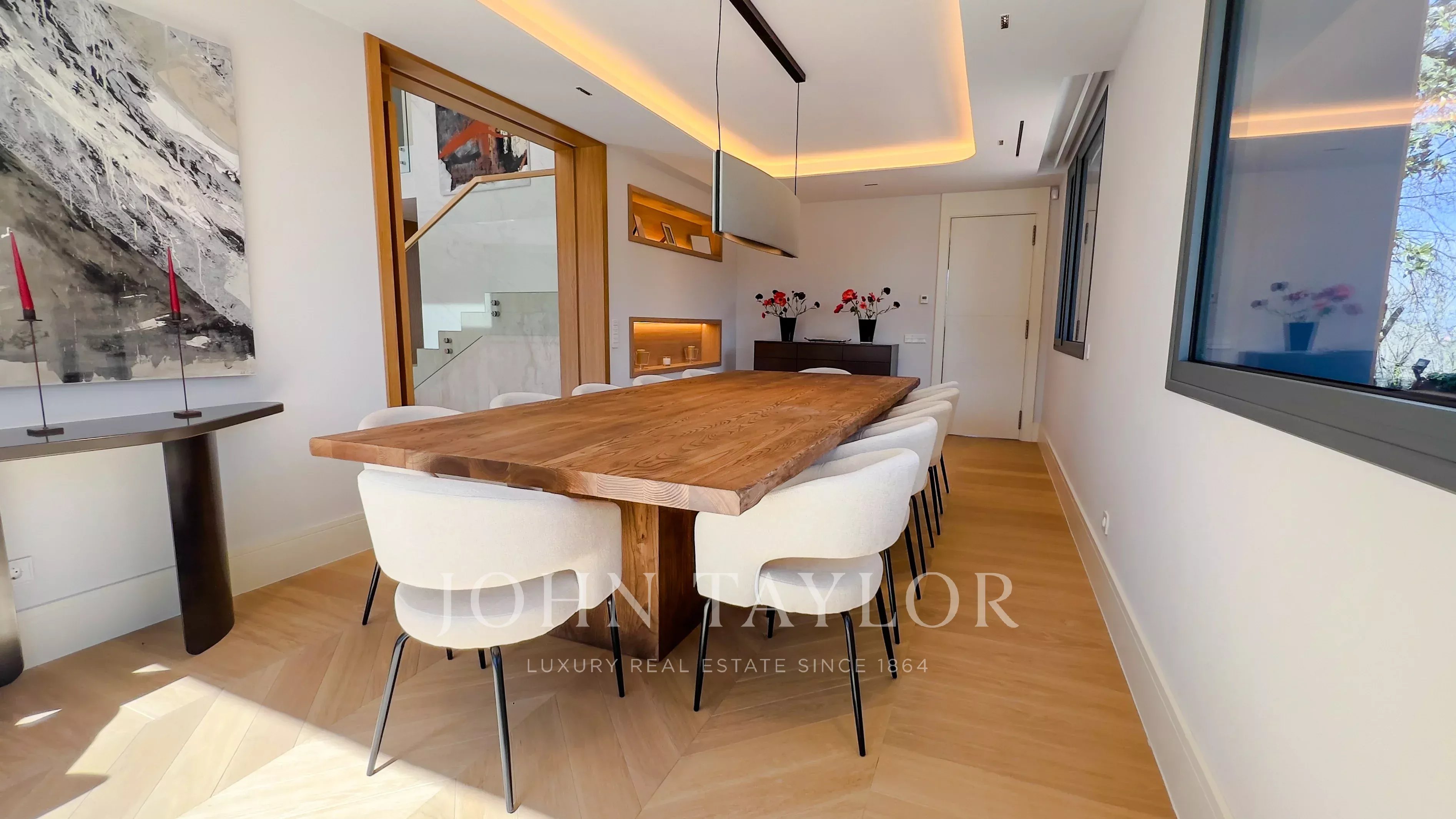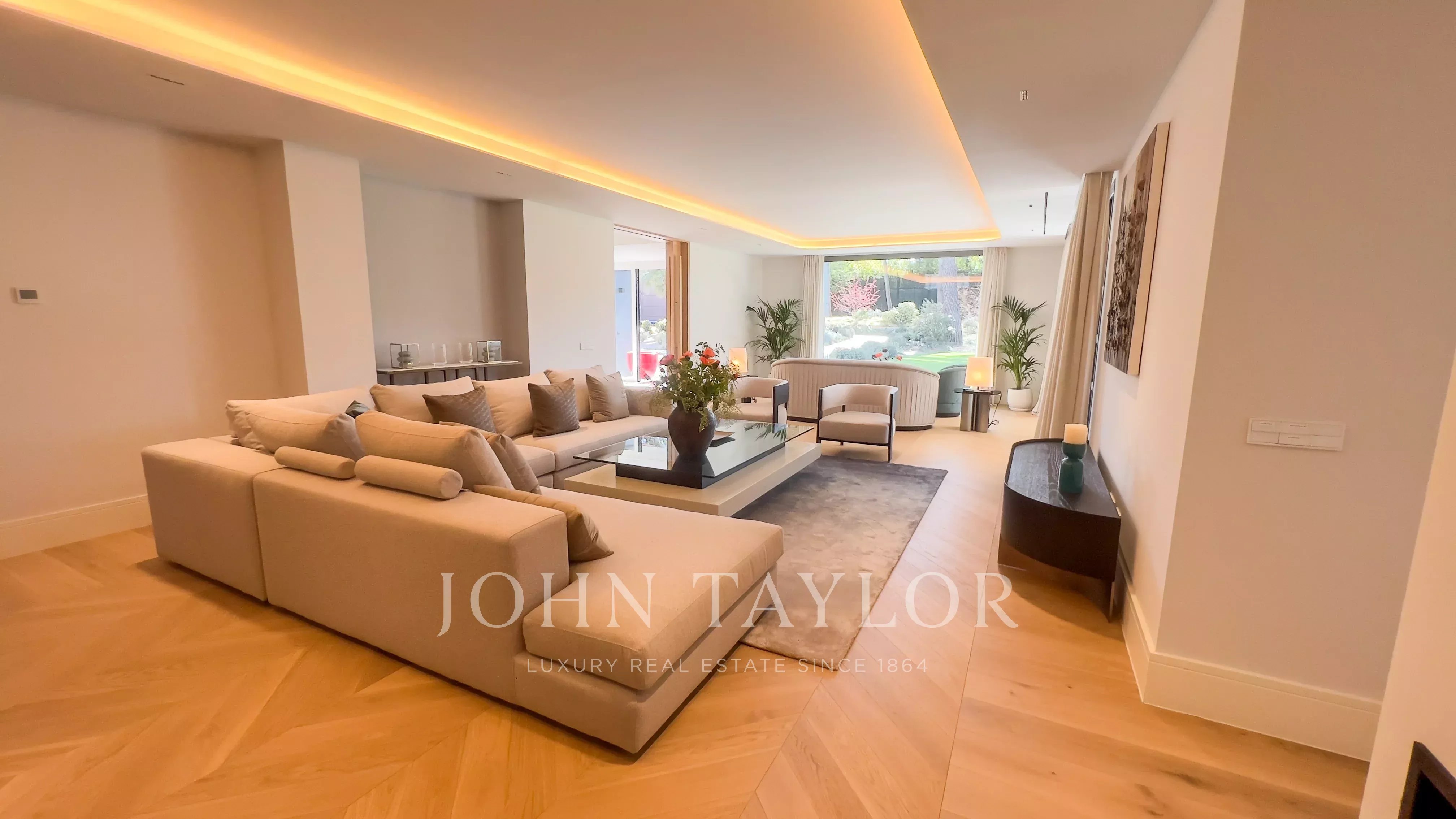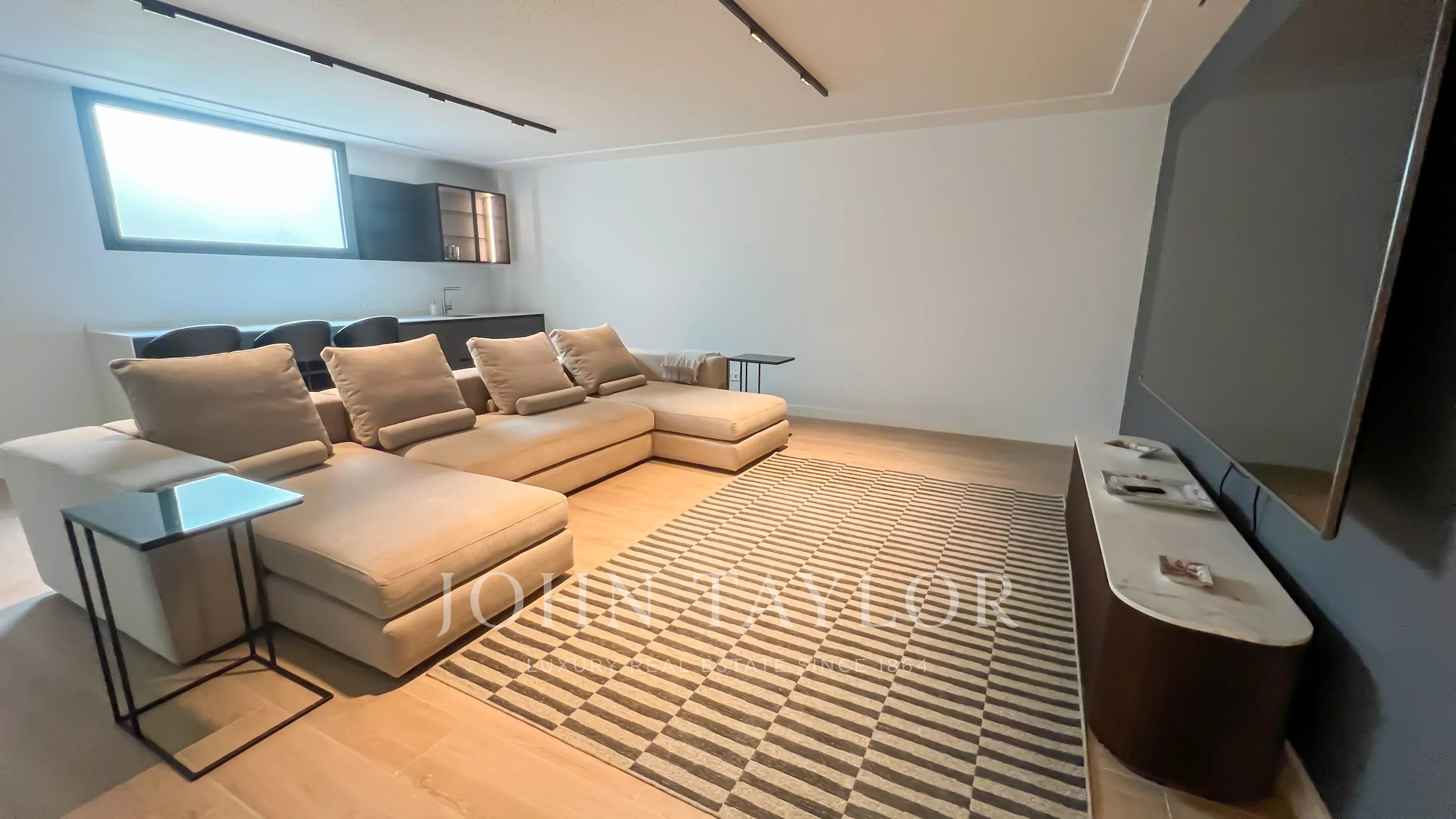Il piano principale ospita un elegante ingresso a doppia altezza, un grande soggiorno con uscita al giardino e alla piscina, sala da pranzo con bar, cucina di design attrezzata con elettrodomestici Gaggenau e zona ufficio. In questo livello si trova anche la suite principale, con salotto privato, due guardaroba e bagno in suite, oltre a un bagno per gli ospiti.