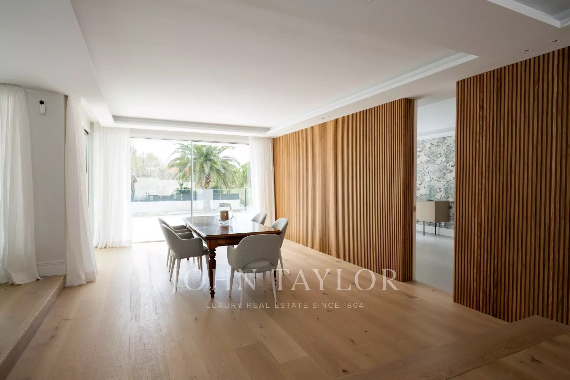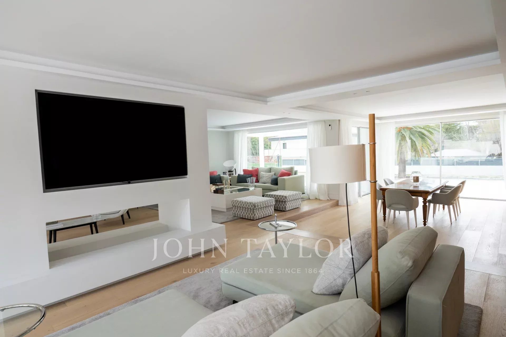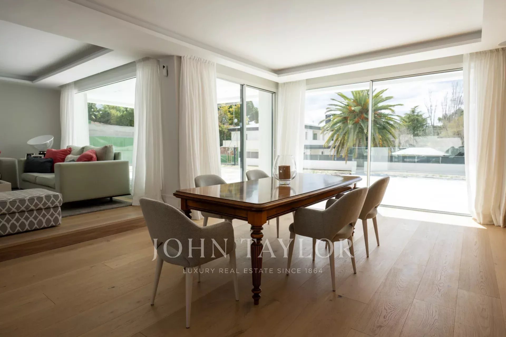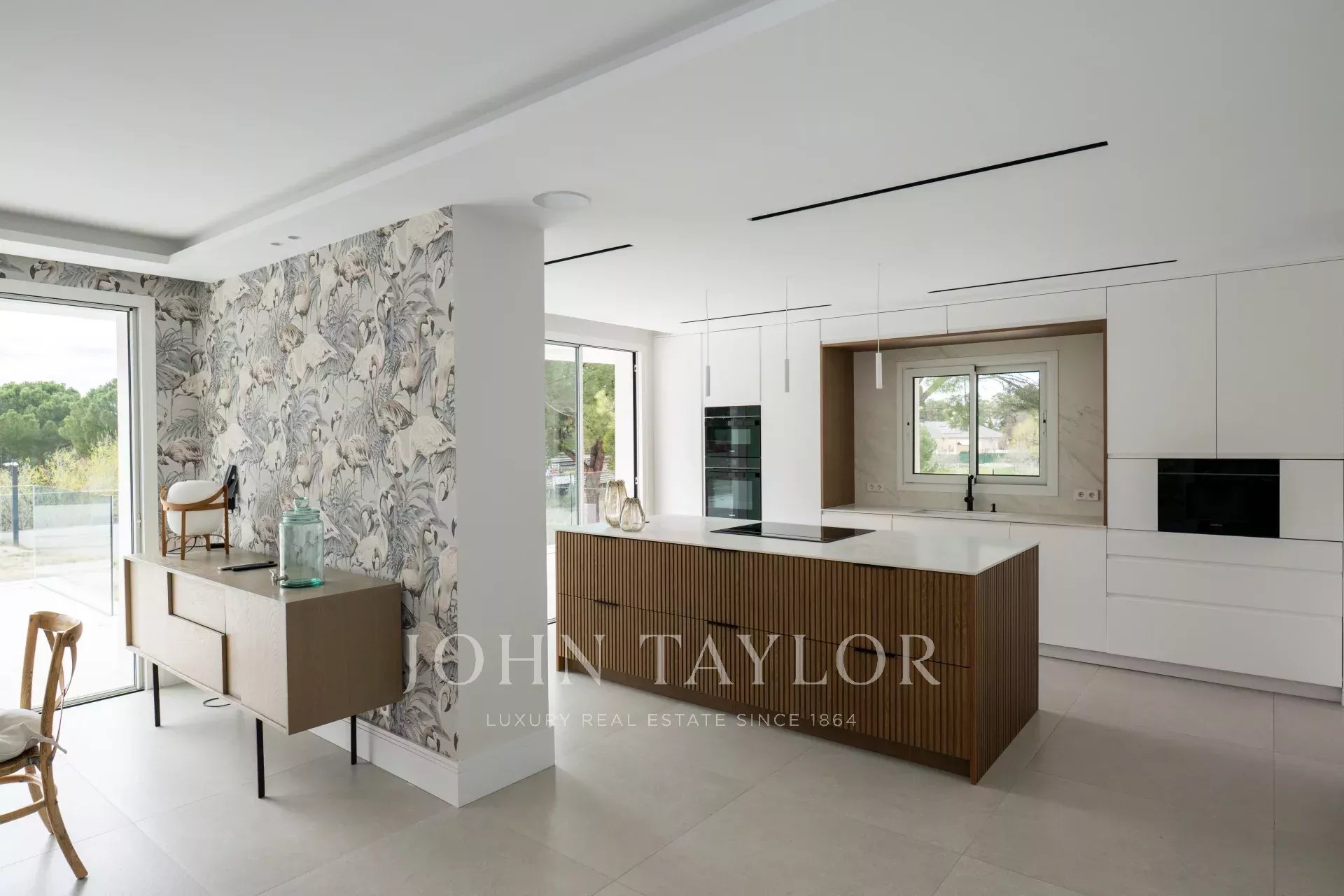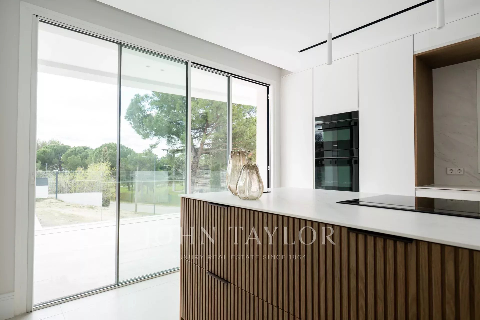 La casa, con una superficie costruita totale di 1679 m2, è un omaggio alla luce. L'ingresso principale è costituito da una bella scala che conduce a una splendida porta d'ingresso di grandi dimensioni. L'ingresso, con due immense finestre monoblocco, illumina l'intero piano principale della casa e ci collega con un ampio soggiorno-sala da pranzo su due livelli. Accanto alla sala da pranzo, la cucina, di alta gamma e domotizzata, dispone di un doppio frigorifero, una grande isola centrale, l'accesso a un'ampia terrazza esterna e una zona ufficio perfetta per i pasti quotidiani della famiglia. Si accede anche alla zona di servizio, che dispone di un'ampia camera da letto con bagno.