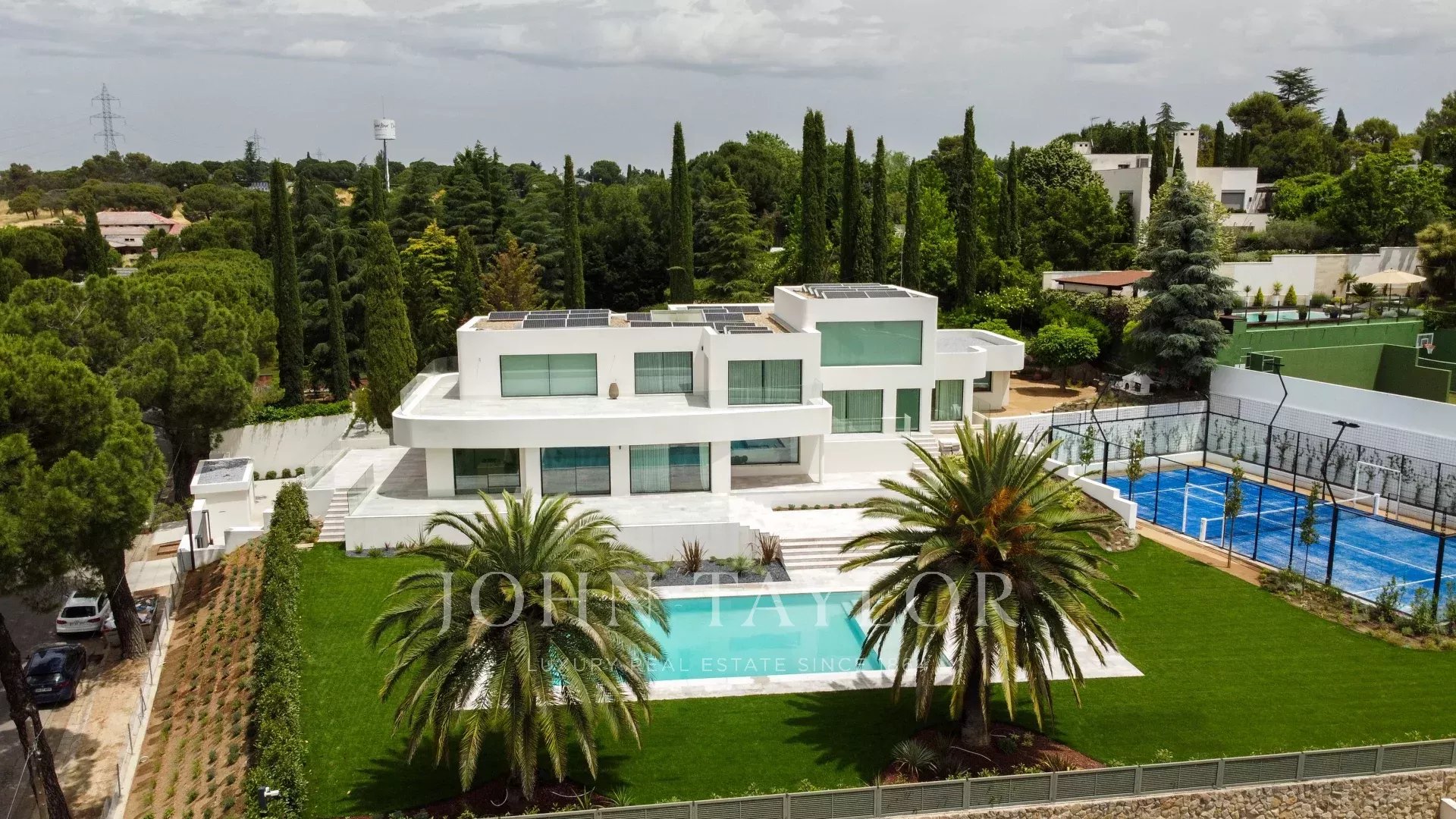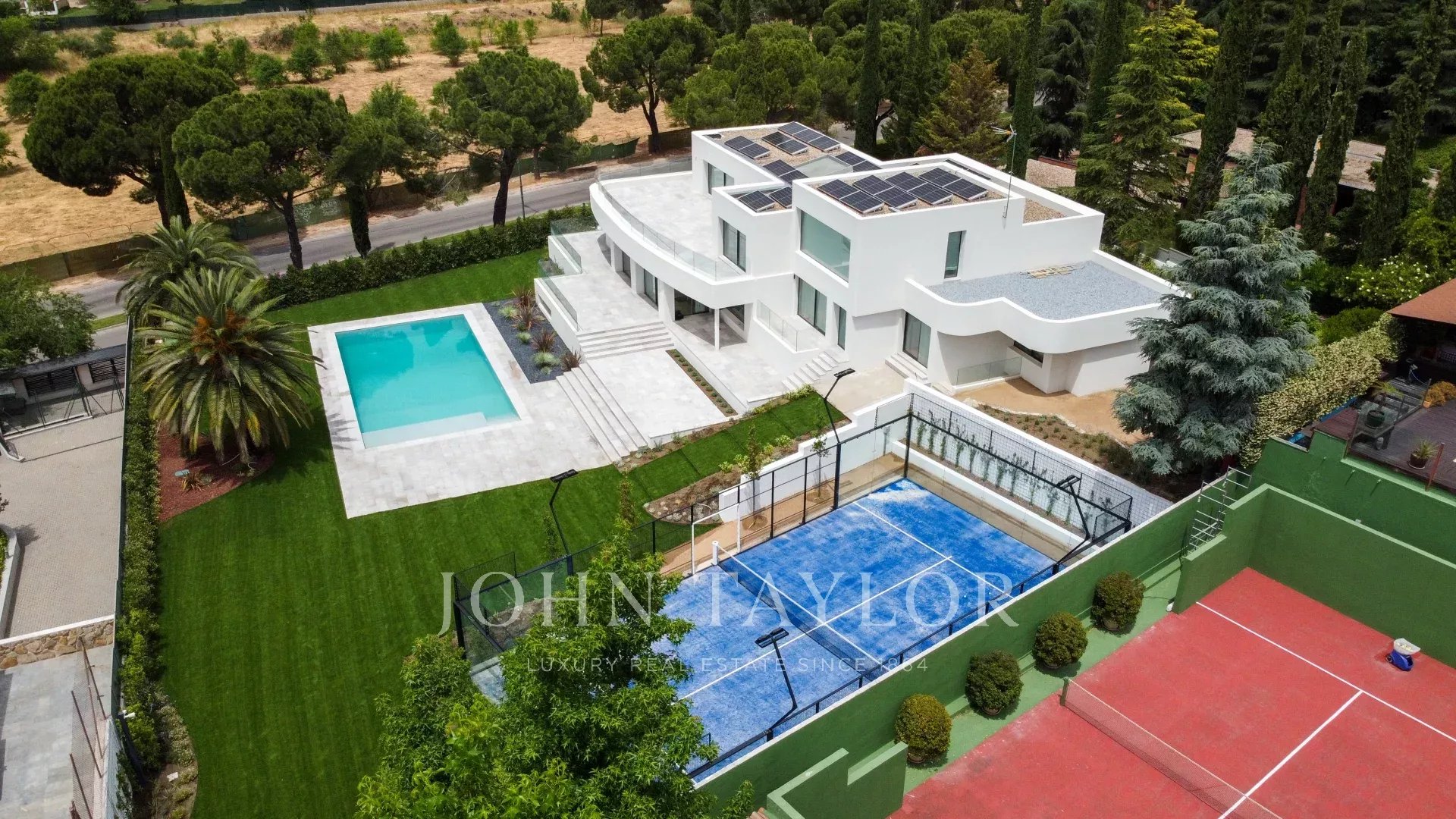 L'esterno della proprietà è dominato da una splendida piscina di acqua salata, da ampi spazi verdi, da una zona cucina esterna (barbecue e forno) e da un campo da paddle tennis professionale.