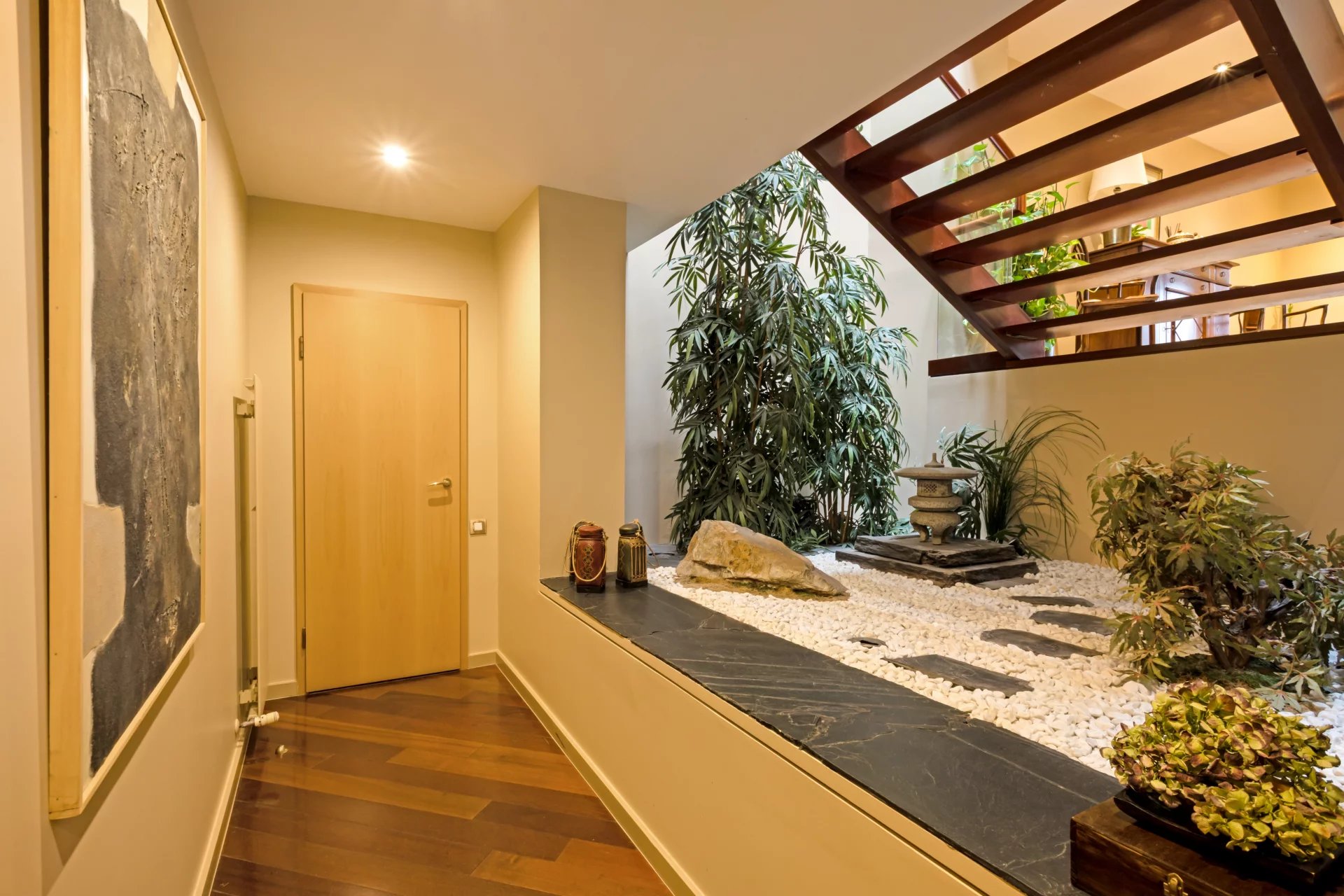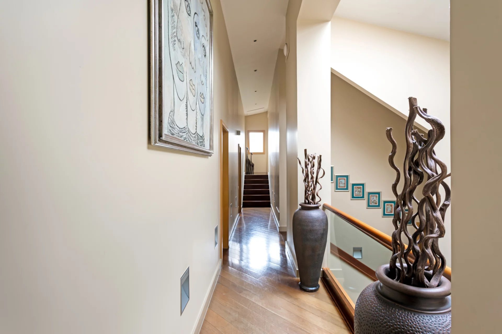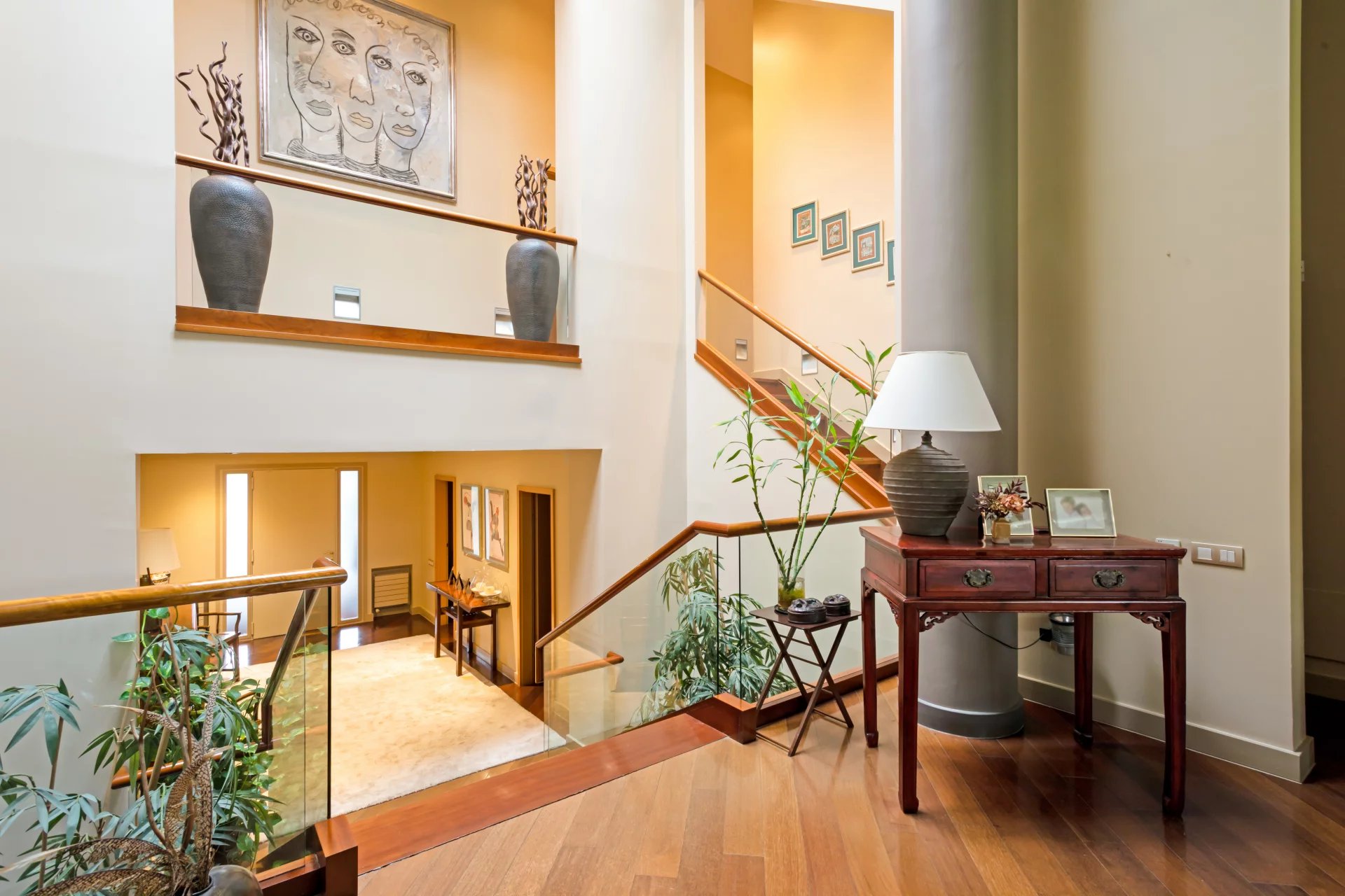 Dalla zona d'ingresso, una scala di sette gradini conduce a un livello intermedio - un mezzanino - che distribuisce il soggiorno principale, la cucina, il portico coperto, la zona piscina e l'accesso diretto ai giardini comuni.