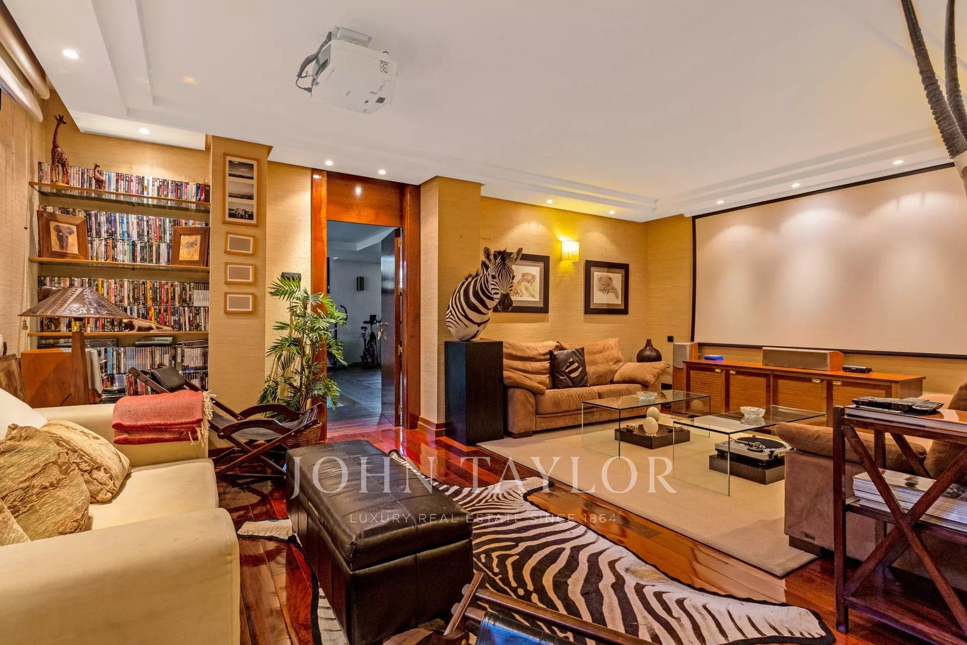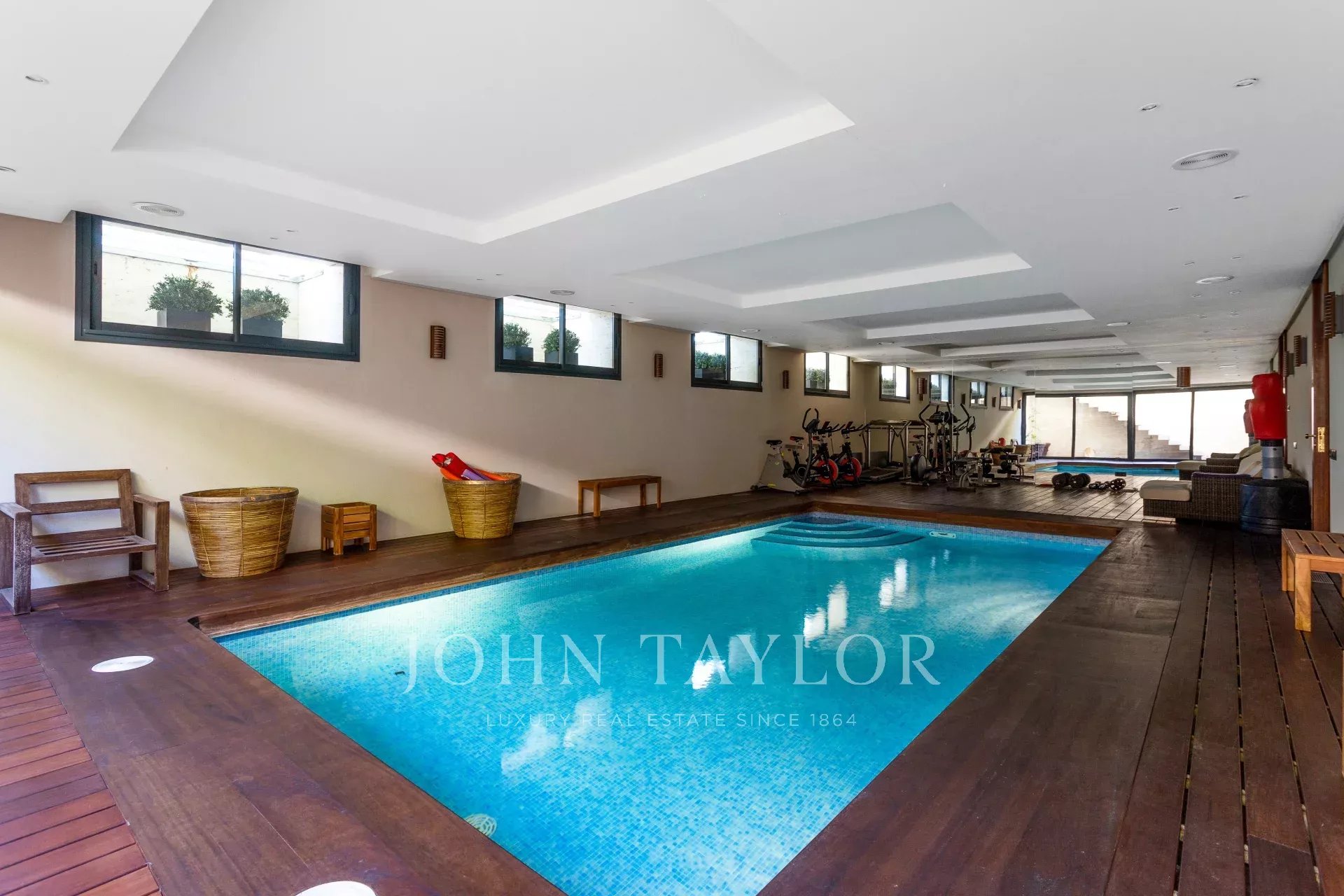 Al piano interrato si trovano due camere di servizio con bagno completo, guardaroba e una piccola cucina di servizio. Garage interno per cinque/quattro auto, ripostiglio e magazzino. All'altra estremità del seminterrato si trova una sala di proiezione e un bagno di servizio che prosegue fino alla zona della piscina coperta e alla palestra, con bagno completo e sauna annessa.