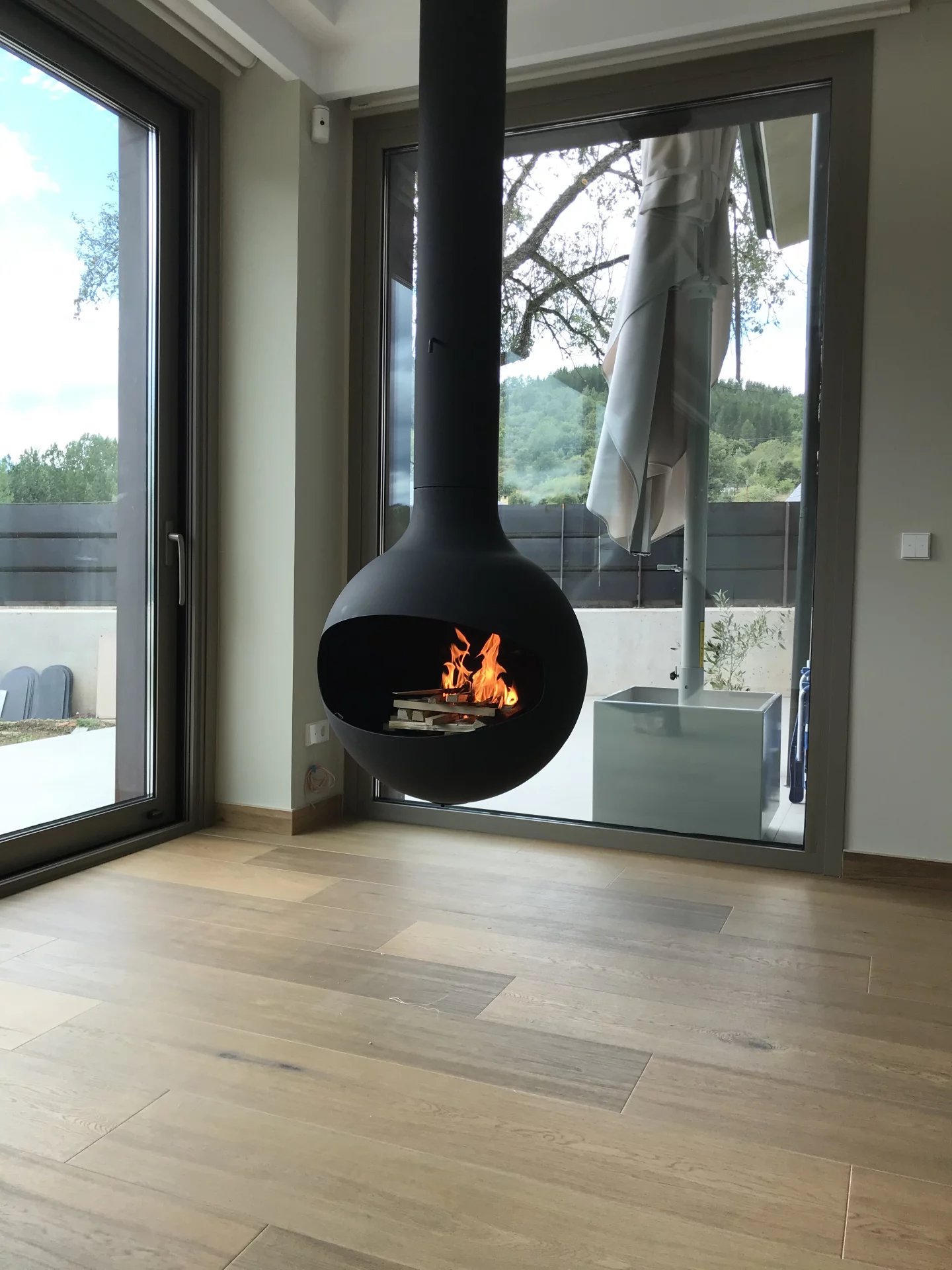- Caminetto BATHYSCAFOCUS Black Focus, sospeso al soffitto. Parascintille e guanto di protezione.