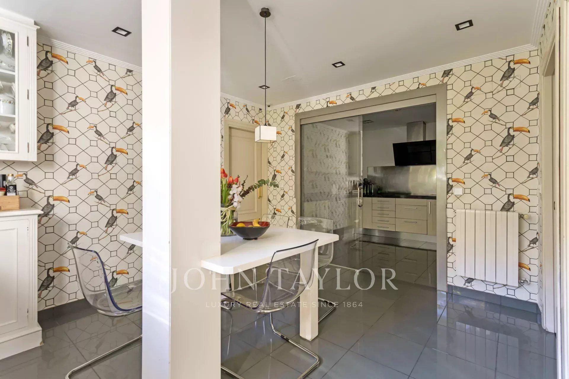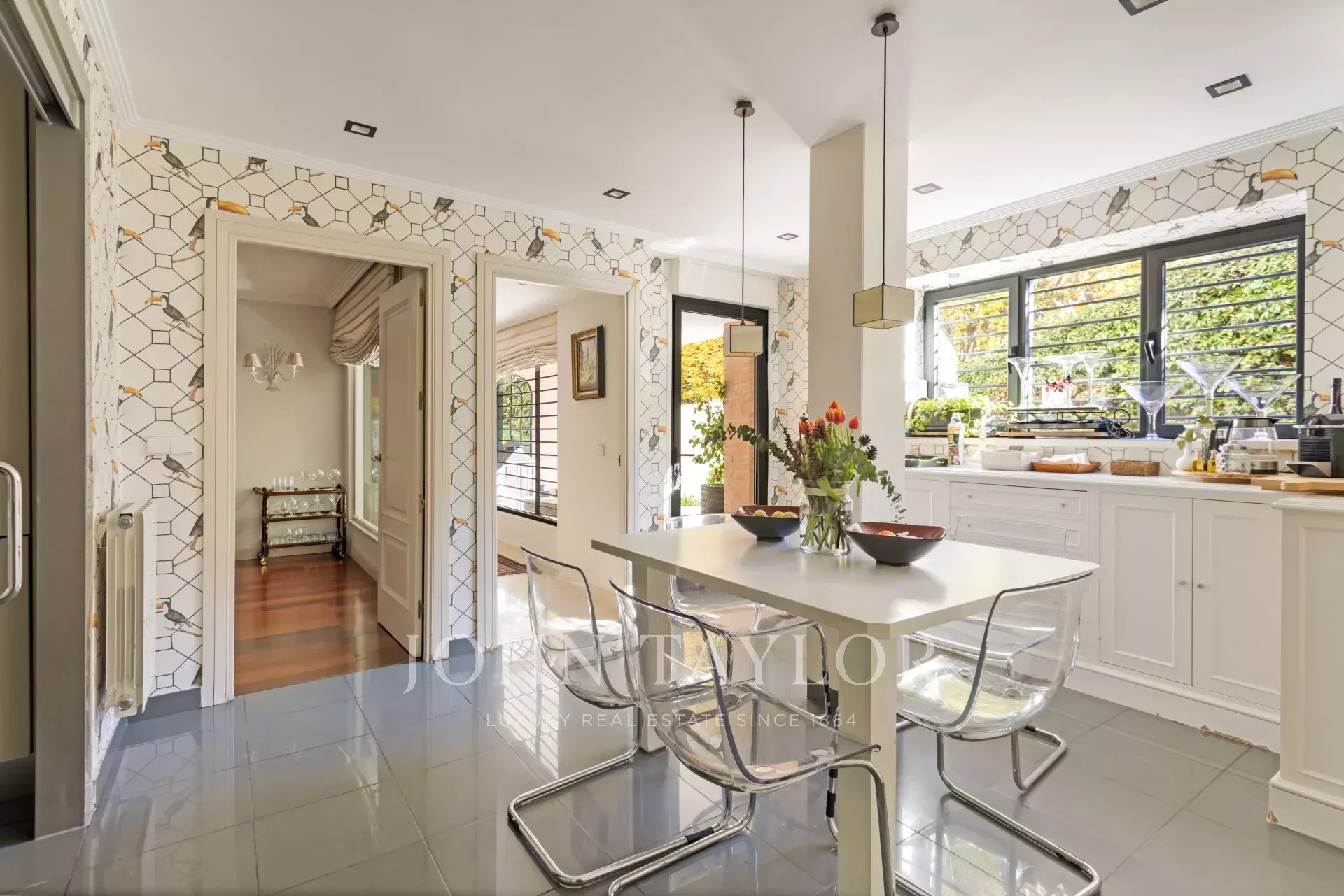 Al piano d'ingresso, il soggiorno ha accesso diretto al portico e al giardino. Servizi igienici accanto all'ingresso. Sala da pranzo con accesso all'ufficio e alla cucina completamente attrezzata. Camera di servizio con bagno e lavanderia, dispensa e spogliatoio per gli abiti stagionali.