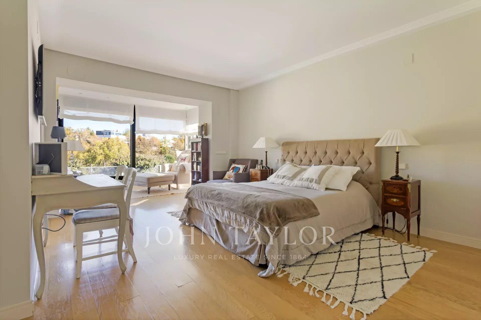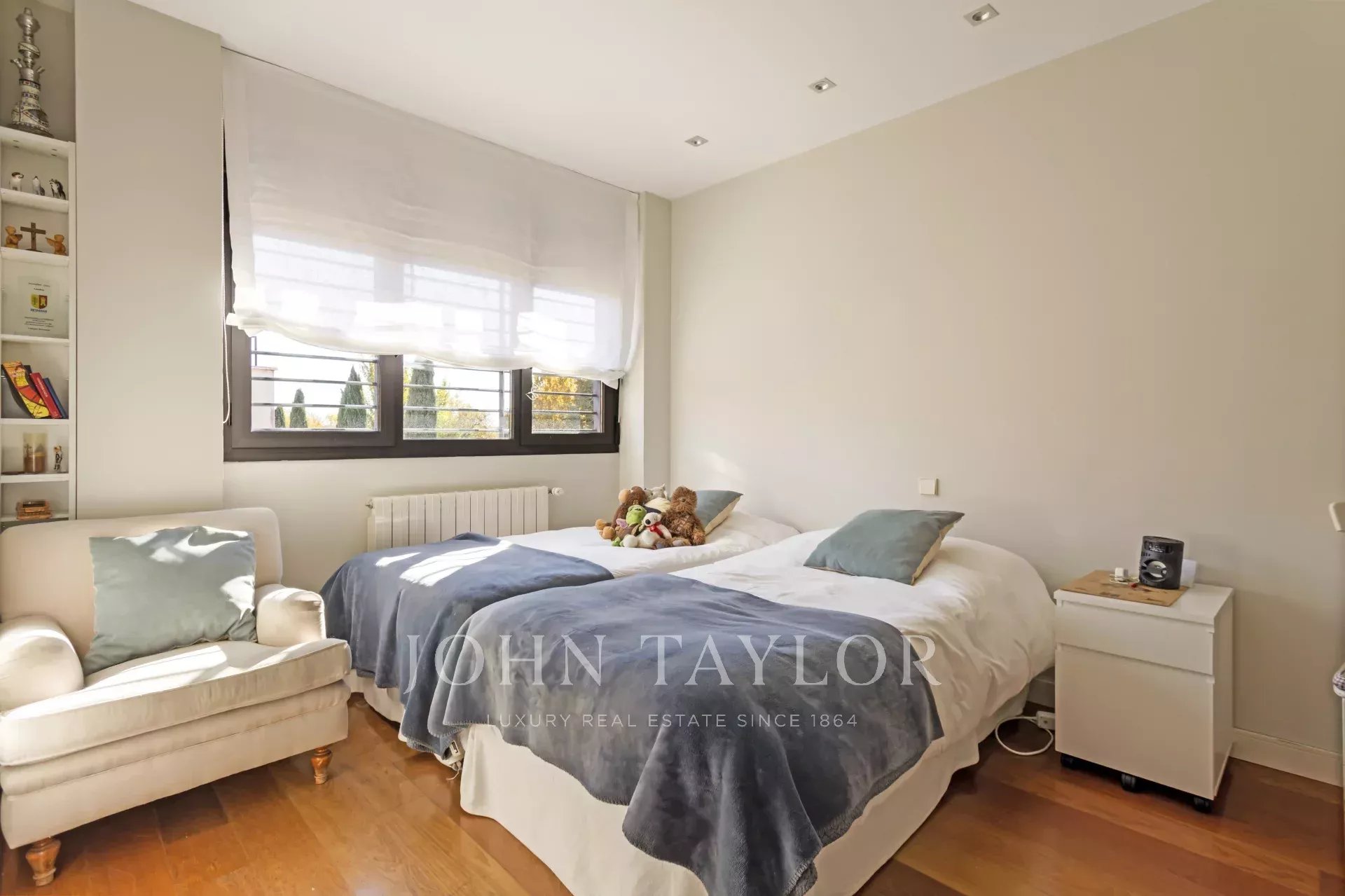Camera da letto principale con bagno privato e spogliatoio, con bella vista sul terreno. Un'altra camera da letto, anch'essa con bagno en suite e armadi aggiuntivi nelle aree del corridoio. Ufficio sullo stesso piano.
